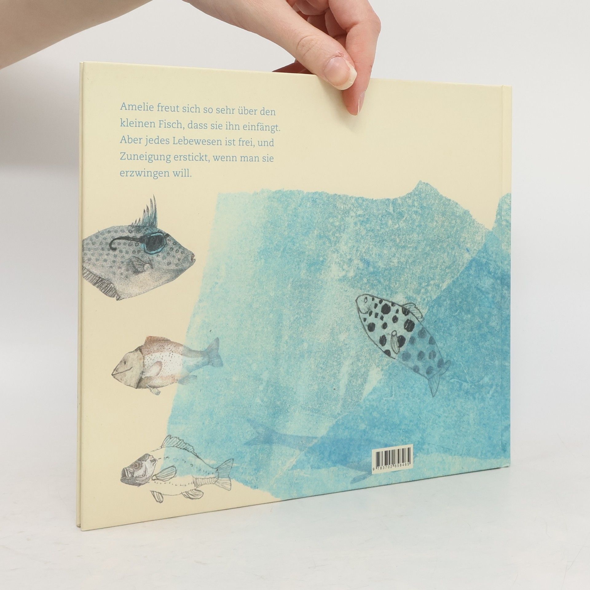 Amelie ist zum ersten Mal in ihrem Leben am Meer. Sie hat Angst vor so viel Wasser und geht vorsichtig nur ein Stückchen hinein. Da kommt ein kleiner Fisch, der mit ihr spielt. Am Abend schwimmt er wieder ins offene Meer hinaus. So geht das mehrere Tage. Amelie möchte den Fisch immer bei sich haben und ihn mit nach Hause nehmen. Darum fängt sie ihn ein und steckt ihn in ein großes Glas. Aber der Fisch ist unglücklich, und Amelie hat ein schlechtes Gewissen. Sie weiß ja, dass der Fisch aus freien Stücken zu ihr gekommen ist und dass sie ihn nicht festhalten kann. Also lässt sie ihn wieder frei. Am nächsten Morgen wartet Amelie auf ihren Freund, aber der kommt nicht. Sie ist traurig und sagt dem Meer, dass ihr leid tut, was sie getan hat. Da taucht der Fisch auf und Amelie ist überglücklich. Sie hat verstanden, dass jedes Lebewesen frei ist und dass Zuneigung erstickt, wenn man sie erzwingen will.