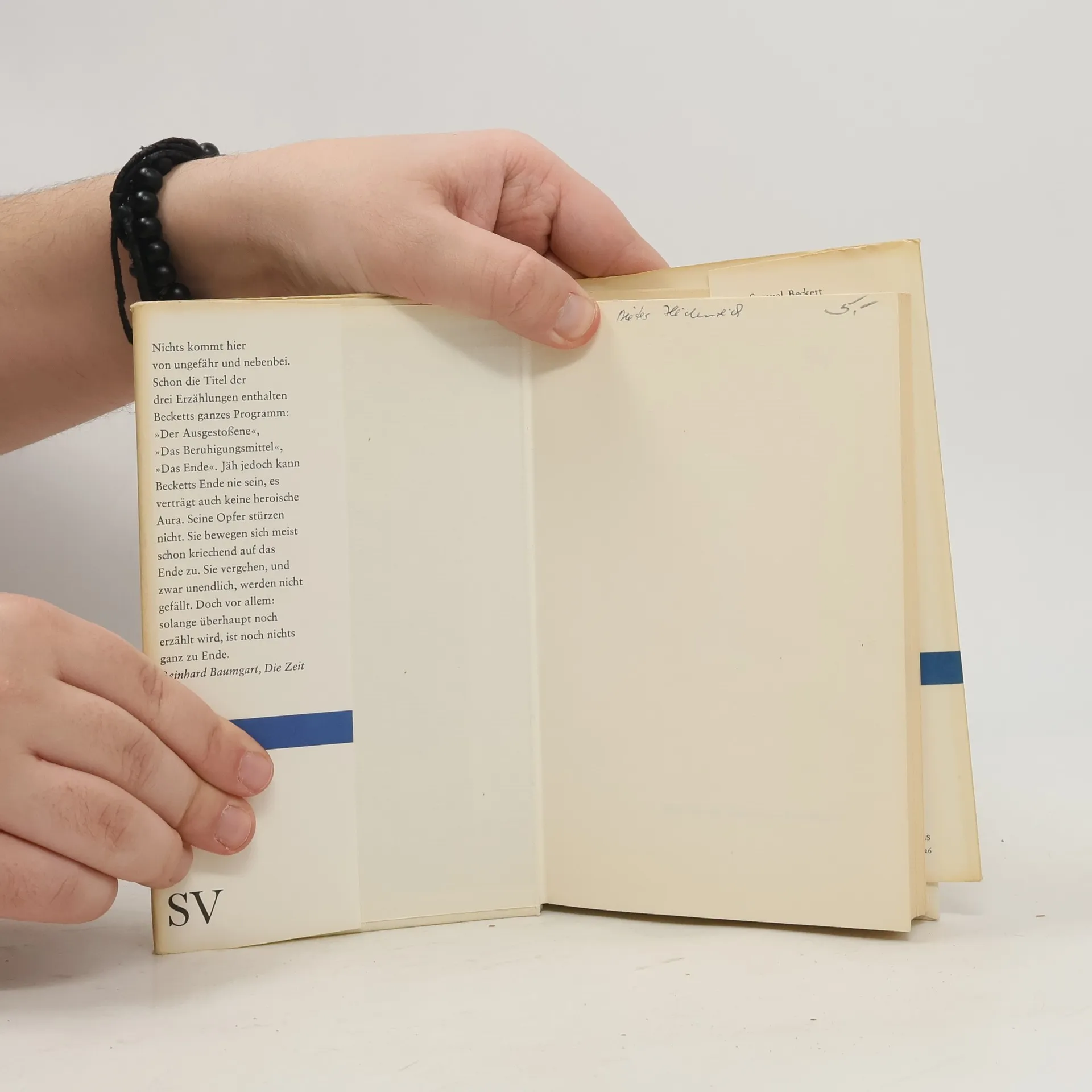 Die drei "Erzählungen" sind 1945 entstanden, die dreizehn "Texte um Nichts" 1930. Gemeinsam führen sie ein in die typische Gestaltenwelt und die stetig sich wiederholende Problematik Samuel Becketts. Sie machen keine Zugeständnisse, aber sie sind leichter zugänglich als die großen epischen Dichtungen, zu denen sie sich verhalten wie ein Bruchstück zum Ganzen, ein Bruchstück, aus dem man das Ganze rekonstruieren könnte.