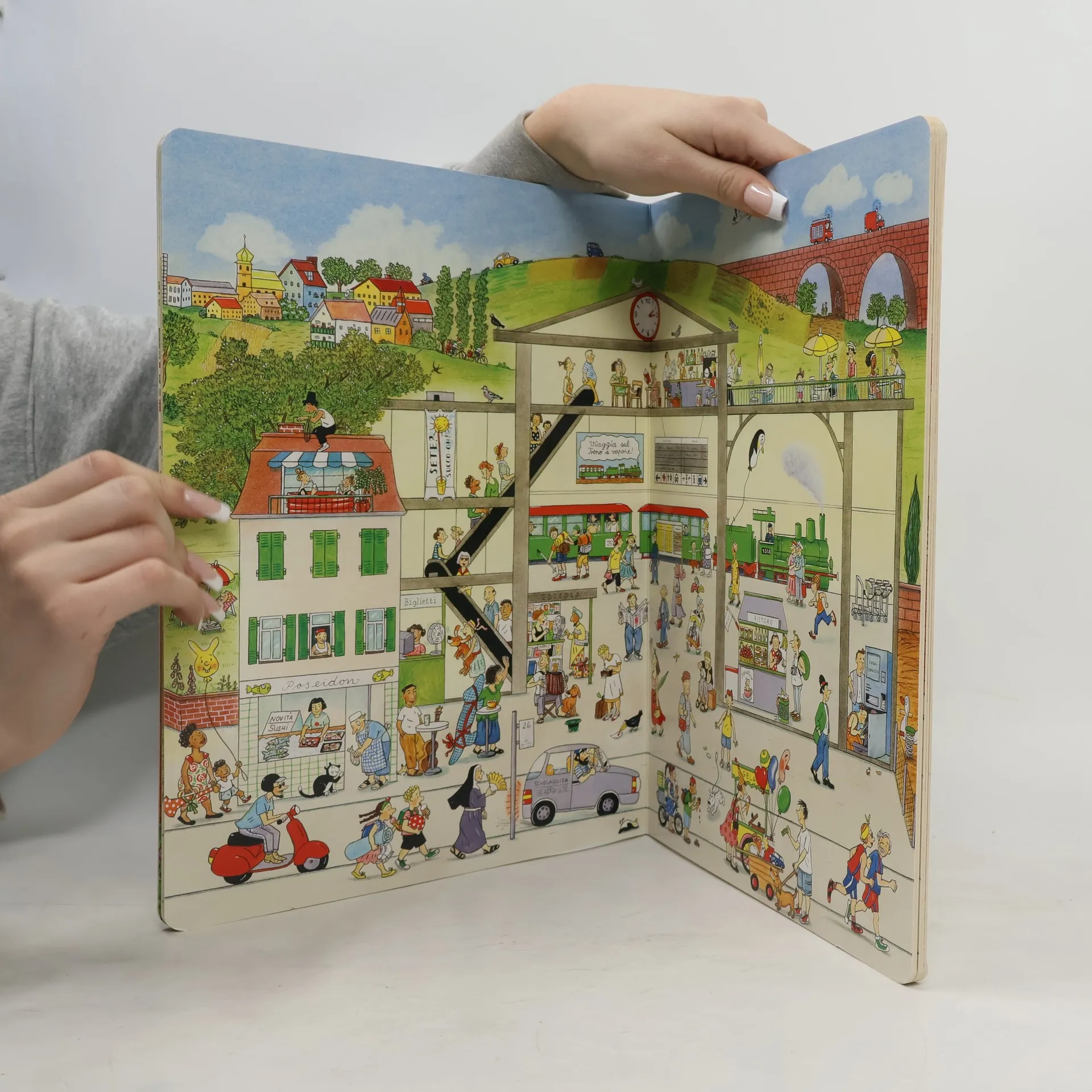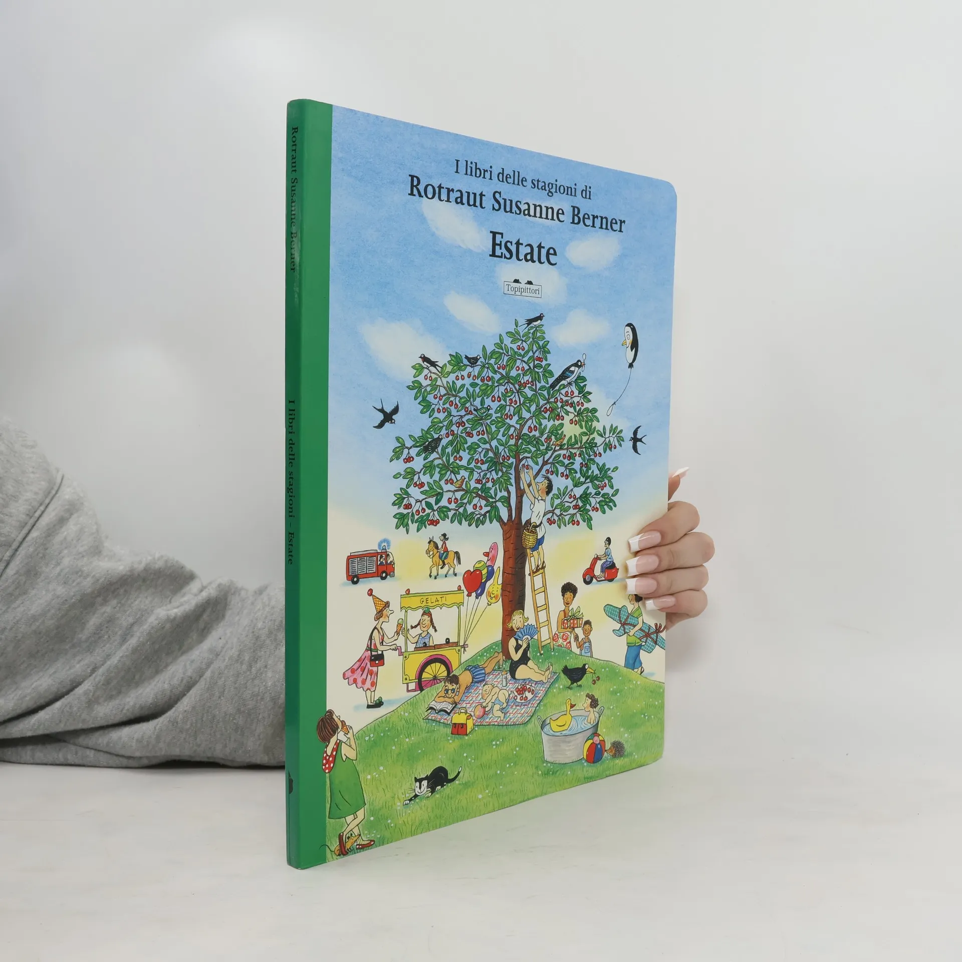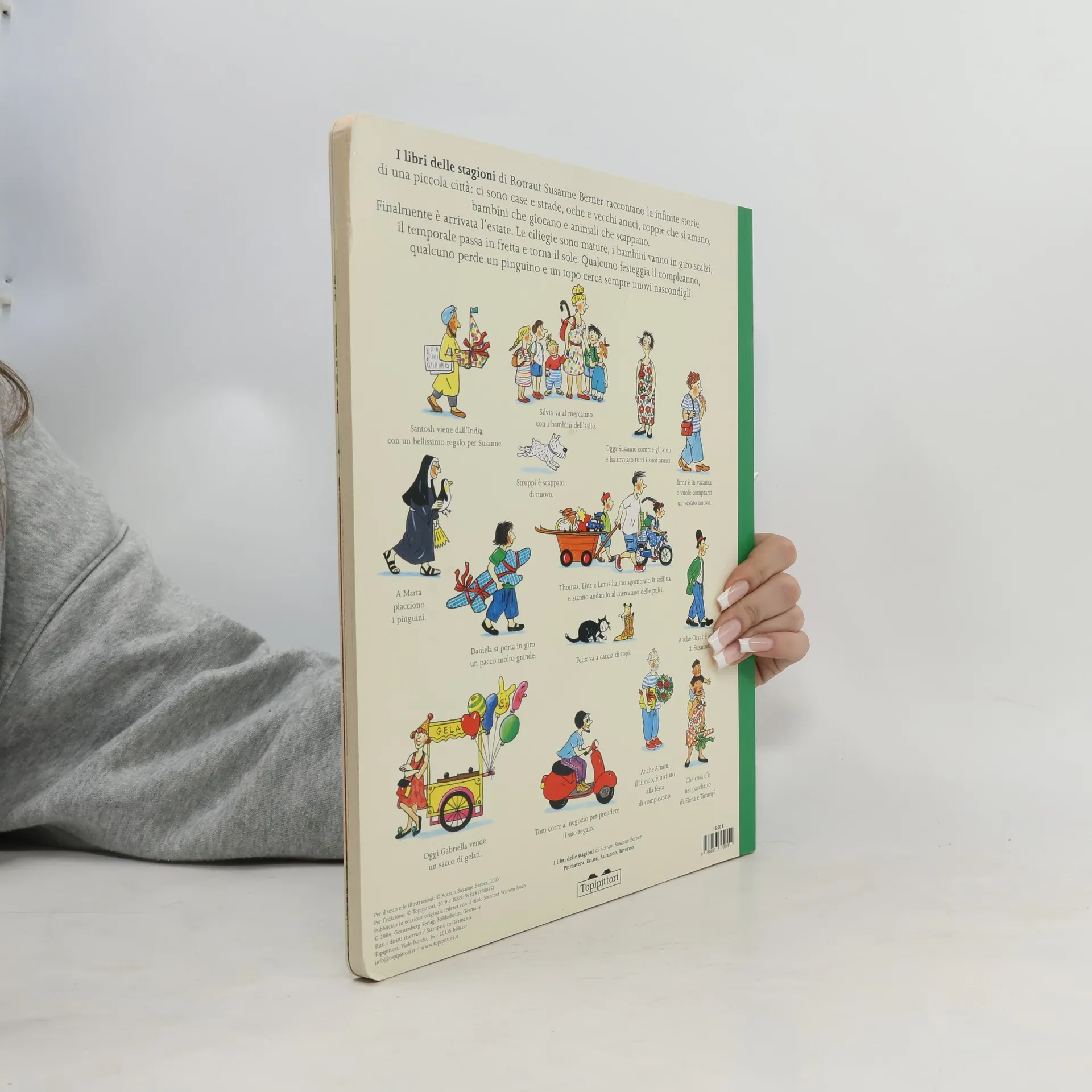 È arrivata l’estate, quindi i gelati, e in piazza c’è il mercatino delle pulci. Qualcuno ha organizzato una festa di compleanno e Daniela sta attraversando la città con un grande pacchetto sottobraccio: chi lo scarterà? I bellissimi Libri delle stagioni di Rotraut Susanne Berner terminano con Estate. Un’opera inesauribile, senza parole, per raccontare le stagioni nella medesima cittadina. La grande illustratrice tedesca, vincitrice dell’Hans Christian Andersen Award 2016, conduce, infatti, il lettore in una passeggiata lungo la stessa strada, in momenti diversi dell’anno e della giornata. Uno spaccato di vita cittadina, brulicante di attività, persone, piante, giochi, animali, stranezze.