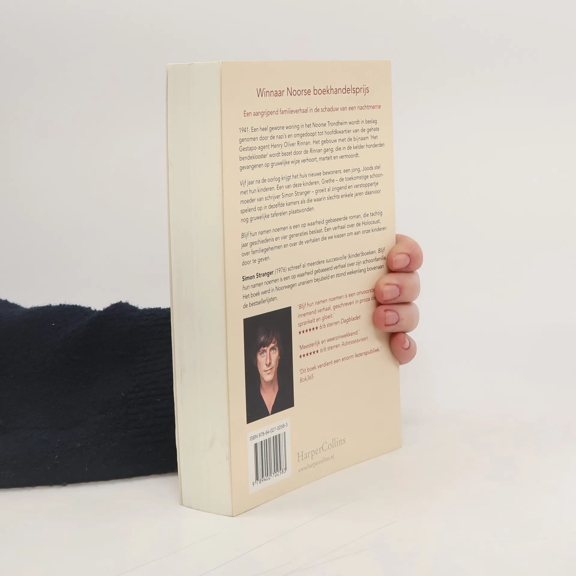 Een aangrijpend familieverhaal in de schaduw van een nachtmerrie 1941. Een heel gewone woning in het Noorse Trondheim wordt in beslag genomen door de nazi’s en omgedoopt tot hoofdkwartier van de gehate Gestapo-agent Henry Oliver Rinnan. Het gebouw met de bijnaam ‘Het bendeklooster’ wordt bezet door de Rinnan gang, die in de kelder honderden gevangenen op gruwelijke wijze verhoort, martelt en vermoordt. Vijf jaar na de oorlog krijgt het huis nieuwe bewoners: een jong, Joods stel met hun kinderen. Een van deze kinderen, Grethe – de toekomstige schoonmoeder van schrijver Simon Stranger – groeit al zingend en verstoppertje spelend op in dezelfde kamers als die waarin slechts enkele jaren daarvoor nog gruwelijke taferelen plaatsvonden. Blijf hun namen noemen is een op waarheid gebaseerde roman, die tachtig jaar geschiedenis en vier generaties beslaat. Een verhaal over de Holocaust, over familiegeheimen en over de verhalen die we kiezen om aan onze kinderen door te geven.