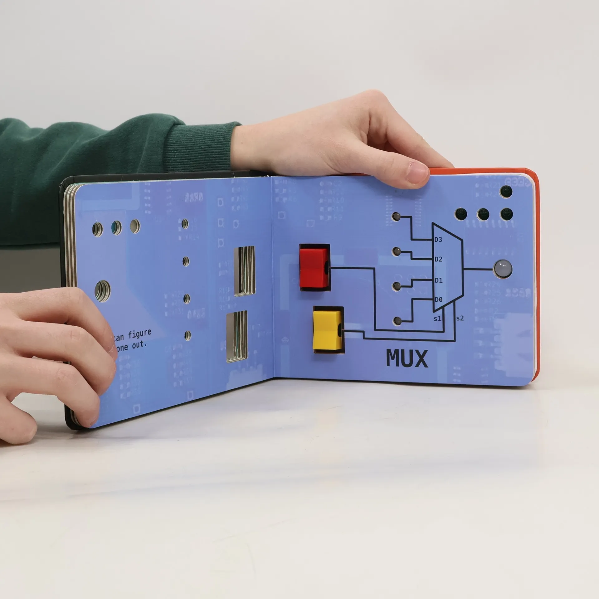 THE SEQUELCE for Big Babies is the next step in continuing education, and putting you and your kids in the good graces of the General AI that is sure to take over the world. The book picks up where the original CE for Babies left off. And, like the first book, it's way too short with six pages. It explores D-Latches, a Shift Register, a Multiplexer, a Decoder, and reading and writing from Addressable Memory.CUSTOM SWITCHES AND 5X THE LIGHTSButtons are old and boring. You know what is new and exciting? Switches. Similar to the buttons in the first book, this book has nice large switches that kids can flip easily, have great tactile feedback, and are just fun!You might have thought one LED was a good time. Just wait until you see all the learning that happens when we quintuple the light count!