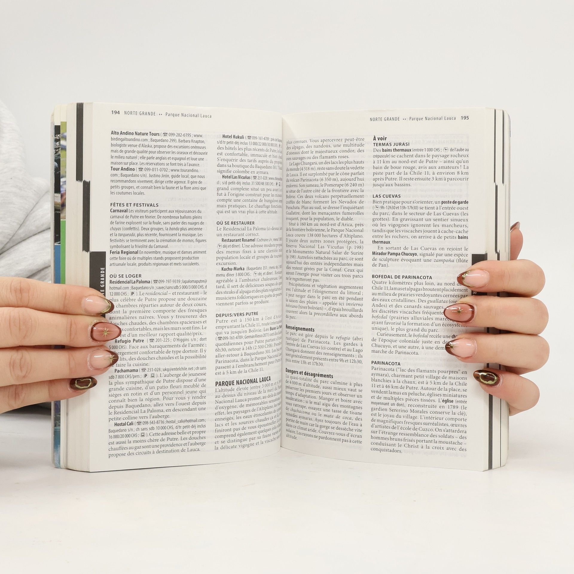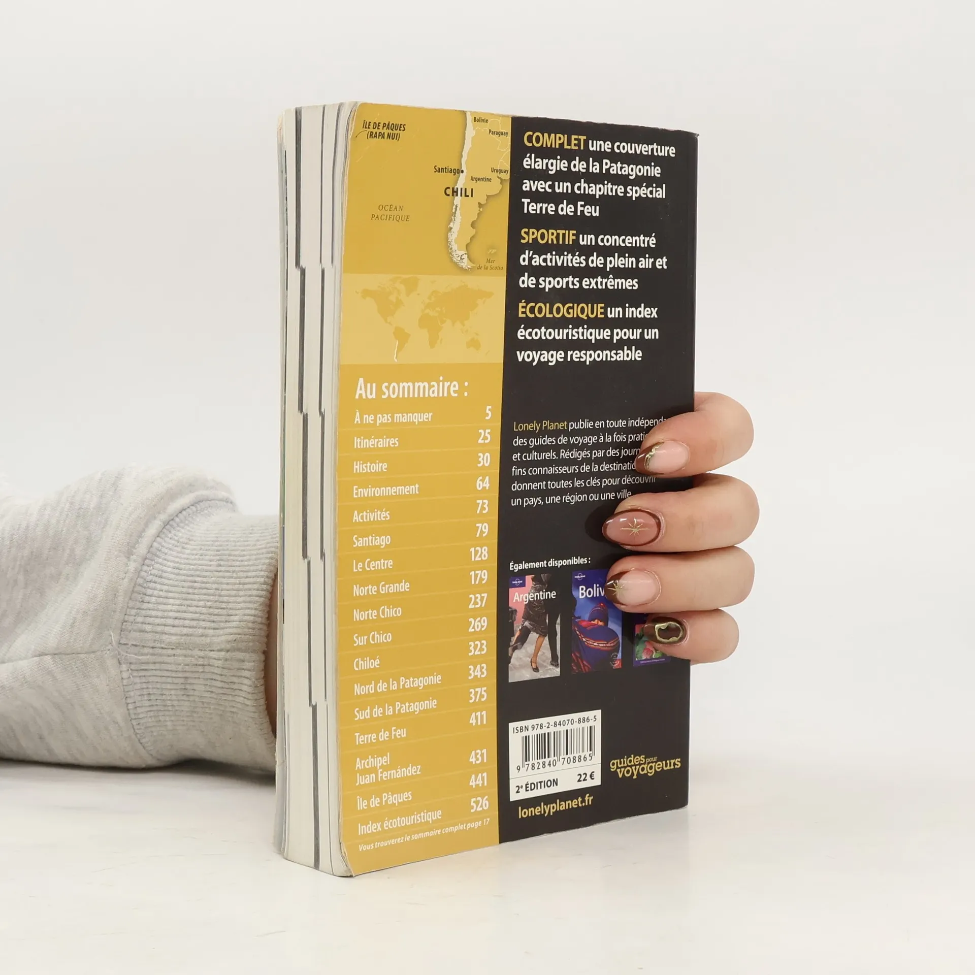 Ce guide couvre la totalité du territoire chilien : les régions frontalières des pays limitrophes sont traitées ainsi que la Patagonie argentine et deux encadrés sont consacrés à l'Antarctique et au Salar de Uyuni depuis le désert d'Atacama. Il propose des activités de plein air, une liste de tous les parcs nationaux et des sites classés au patrimoine mondial de l'Unesco, etc.