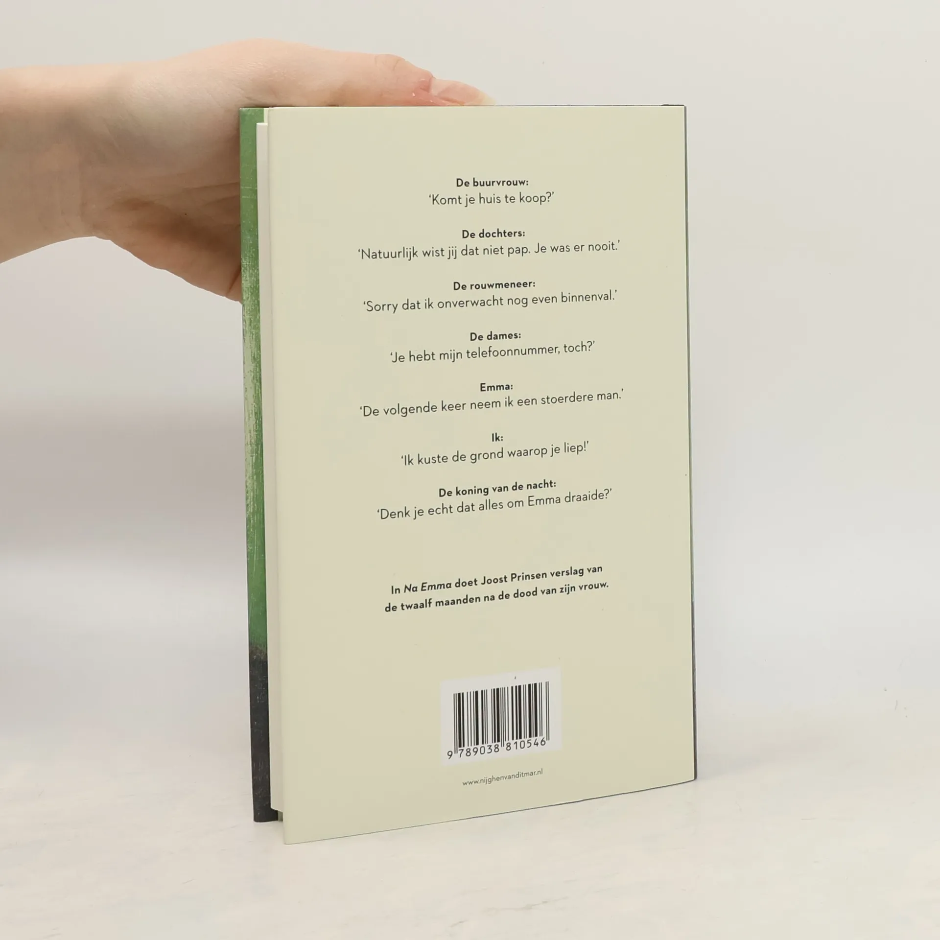 De ‘Komt je huis te koop?’De ‘Natuurlijk wist jij dat niet pap. Je was er nooit.’De ‘Sorry dat ik onverwacht nog even binnenval.’De ‘Je hebt mijn telefoonnummer, toch?’ ‘De volgende keer neem ik een stoerdere man.’ ‘Ik kuste de grond waarop je liep!’De Koning van de ‘Denk je echt dat alles om Emma draaide?’In Na Emma doet Joost Prinsen verslag van de twaalf maanden na de dood van zijn vrouw.