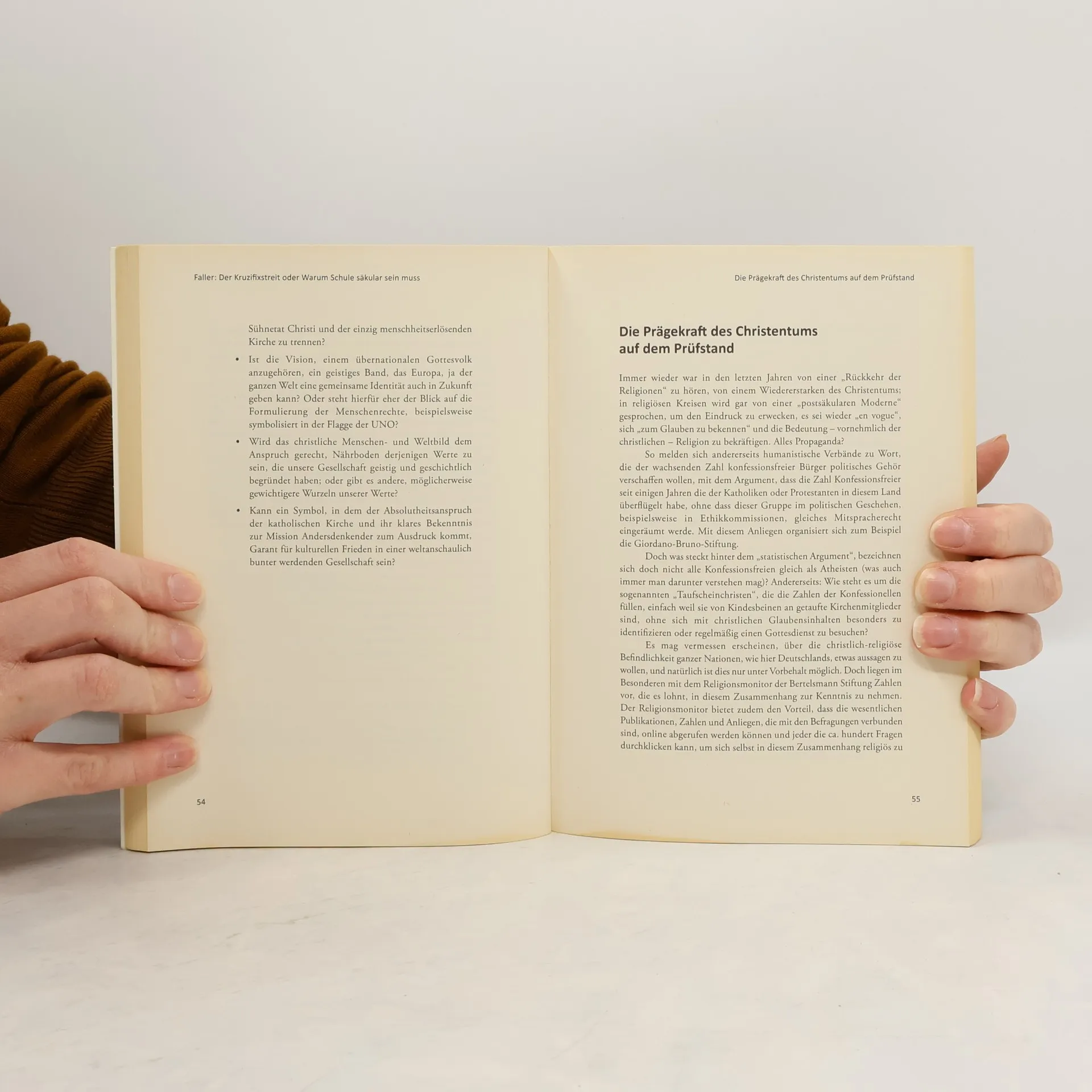 Europa wird weltanschaulich vielfältiger. Der Autor Ulf Faller sieht in der zunehmenden Vielfalt eine Chance in Zeiten wachsender globaler Herausforderungen. Das Miteinander von Menschen unterschiedlichster Religionen und Weltanschauungen allerdings muss erlernt werden. Hierbei spielt die Schule eine zentrale Rolle. Voraussetzung für das Gelingen eines weltanschaulich neutralen Staates ist, dass die gemeinsame Wertebasis eben nicht religiös definiert wird. Der immer wieder aufflammende Streit um Kreuze in Klassenzimmern zeigt deutlich die Gefahren eines „Kulturkampfes in Schulräumen“. Während die Kreuz-Befürworter „unsere Kultur“ als „christliches Abendland“ etikettieren, zeigt Ulf Faller, dass die unsere Gesellschaft bestimmenden Grundwerte viel treffender in Antike und Aufklärung wurzeln. Dementsprechend sieht der Autor die Notwendigkeit, das Schulwesen säkular zu gestalten und zeigt praktische Konsequenzen für den Schulalltag auf. Im Besonderen unterstreicht er die Wichtigkeit eines Philosophie- und Ethikunterrichtes, an dem alle Schüler unabhängig von ihrem Bekenntnis gemeinsam teilnehmen.