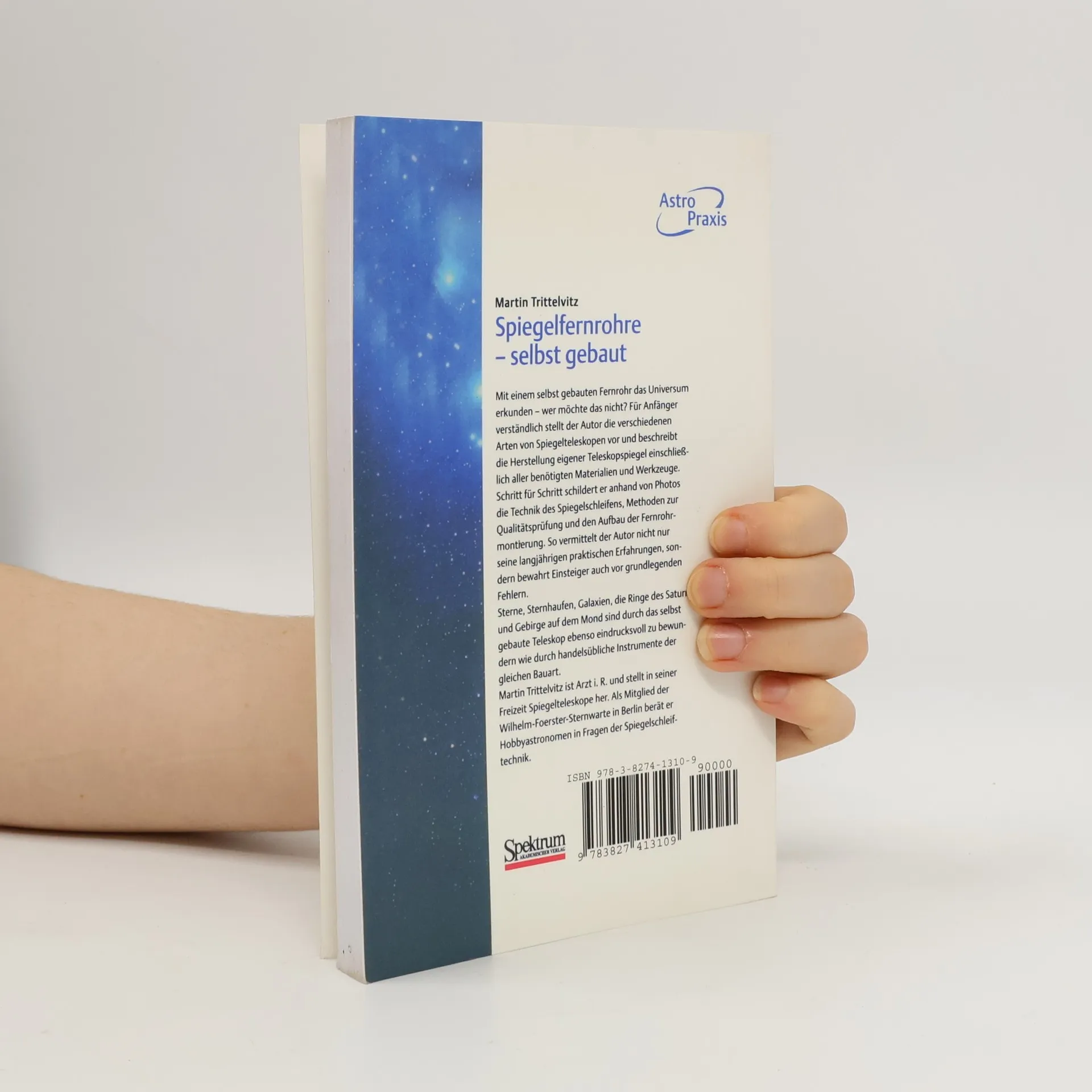 KlappentextMit einem selbst gebauten Fernrohr das Universum erkunden - wer möchte das nicht? Für Anfänger verständlich stellt der Autor die verschiedenen Arten von Spiegelteleskopen vor und beschreibt die Herstellung eigener Teleskopspiegel einschließlich aller benötigten Materialien und Werkzeuge. Schritt für Schritt schildert er anhand von Photos die Technik des Spiegelschleifens, Methoden zur Qualitätsprüfung und den Aufbau der Fernrohrmontierung. So vermittelt der Autor nicht nur seine langjährigen praktischen Erfahrungen, sondern bewahrt Einsteiger auch vor grundlegenden Fehlern. Sterne, Sternhaufen, Galaxien, die Ringe des Saturn und Gebirge auf dem Mond sind durch das selbst gebaute Teleskop ebenso eindrucksvoll zu bewundern wie durch handelsübliche Instrumente der gleichen Bauart. Martin Trittelvitz ist Arzt i. R. und stellt in seiner Freizeit Spiegelteleskope her. Als Mitglied der Wilhelm-Foerster-Sternwarte in Berlin berät er Hobbyastronomen in Fragen der Spiegelschleiftechnik.
