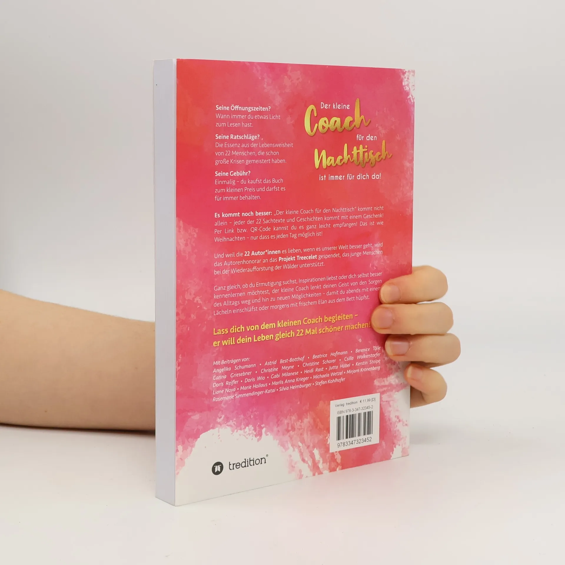 "Der kleine Coach für den Nachttisch" ist immer für dich da! - Seine Öffnungszeiten? Wann immer du etwas Licht zum Lesen hast. - Seine Ratschläge? Die Essenz aus der Lebensweisheit von 22 Menschen, die schon große Krisen gemeistert haben. - Seine Gebühr? Einmalig - du kaufst das Buch oder E-Book zum kleinen Preis und darfst es für immer behalten. Es kommt noch "Der kleine Coach für den Nachttisch" kommt nicht allein - jeder der 22 Sachtexte und Geschichten kommt mit einem Geschenk! Per Link bzw. QR-Code kannst du es ganz leicht empfangen! Das ist wie Weihnachten - nur dass es jeden Tag möglich ist! Und weil die 22 Autor*innen es lieben, wenn es unserer Welt besser geht, wird das Autorenhonorar an das Projekt Treecelet gespendet, das junge Menschen bei der Wiederaufforstung der Wälder unterstützt. Ganz gleich, ob du Ermutigung suchst, Inspirationen liebst oder dich selbst besser kennenlernen möchtest, der kleine Coach lenkt deinen Geist von den Sorgen des Alltags weg und hin zu neuen Möglichkeiten - damit du abends mit einem Lächeln einschläfst oder morgens mit frischem Elan aus dem Bett hüpfst. Lass dich von dem kleinen Coach begleiten - er will dein Leben gleich 22 Mal schöner machen! Mit Beiträgen Angelika Schumann - Astrid Best-Botthof - Beatrice Hofmann - Berenice Tölle - Carina Griesebner - Christine Meyne - Christine Schorer - Csilla Wolkerstorfer - Doris Reifler - Doris Wio - Gabi Milanese - Heidi Rast - Jutta Hübel - Kerstin Stolpe - Liane Nova - Marie Hollaus - Marlis Anna Krieger - Michaela Wetzel - Mirjam Kronenberg - Rosemarie Simmendinger-Katai - Silvia Heimburger - Stefan Kohlhofer
