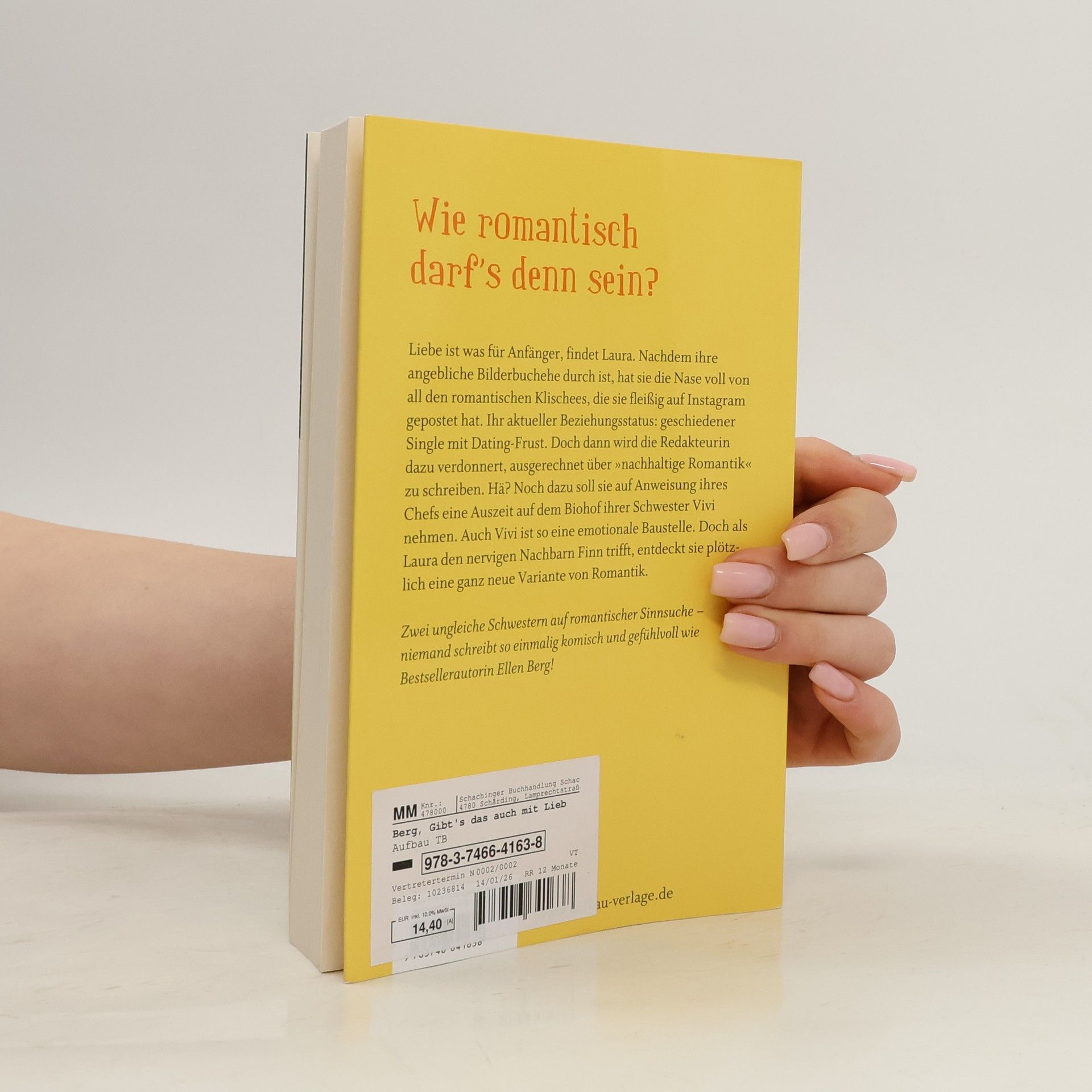 Wie romantisch darf‘s denn sein? Liebe ist was für Anfänger, findet Laura. Nachdem ihre vermeintliche Bilderbuchehe durch ist, hat sie die Nase voll von all den romantischen Klischees, die sie fleißig auf Instagram gepostet hat. Ihr aktueller Beziehungsstatus: geschiedener Single mit flüchtigen Affären. Doch dann wird die Redakteurin dazu verdonnert, über Liebe und »nachhaltige Romantik« zu schreiben. Hä? Vollends ins Schleudern kommt Laura, als sie eine kreative Auszeit in der Biohof-WG ihrer Schwester nimmt. Dort trifft sie den nervigen Nachbarn Finn. Und entdeckt plötzlich eine ganz neue Variante von Romantik … Zwei ungleiche Schwestern auf romantischer Sinnsuche – niemand schreibt so einmalig komisch und romantisch wie Bestsellerautorin Ellen Berg!