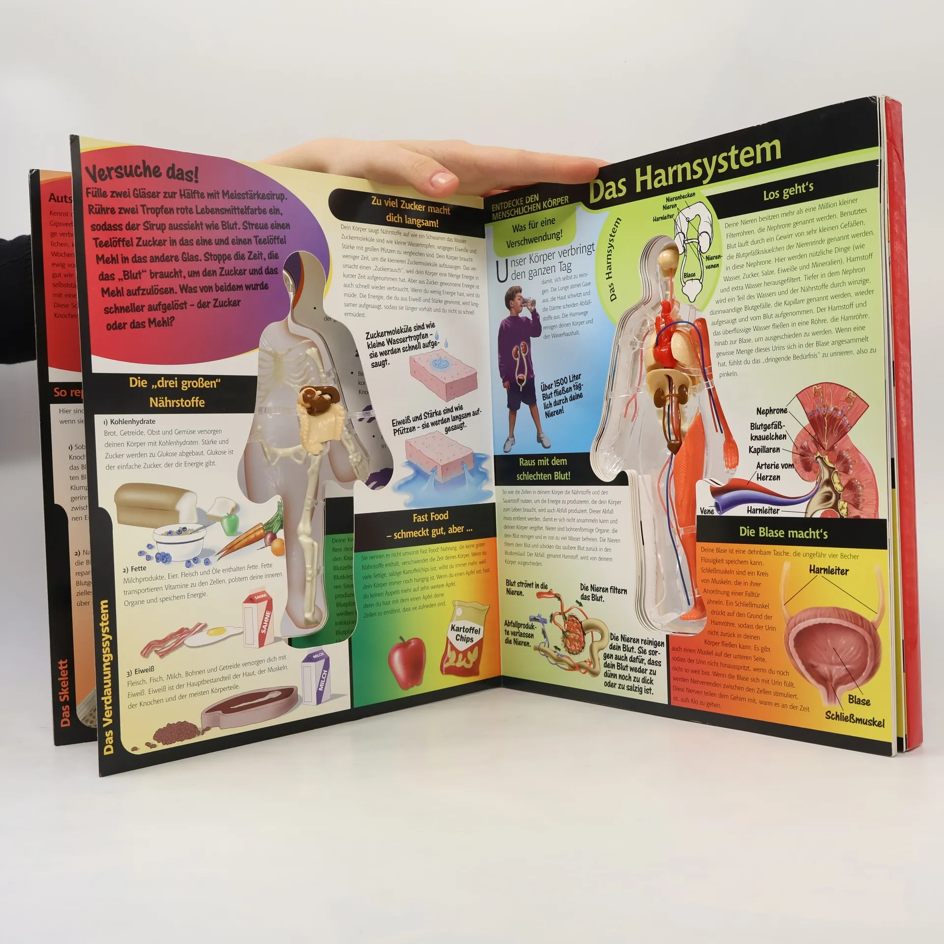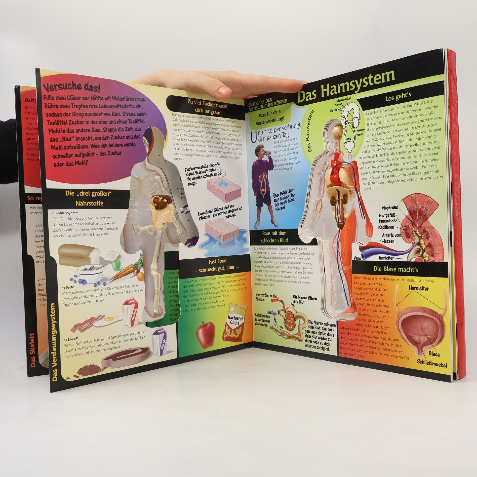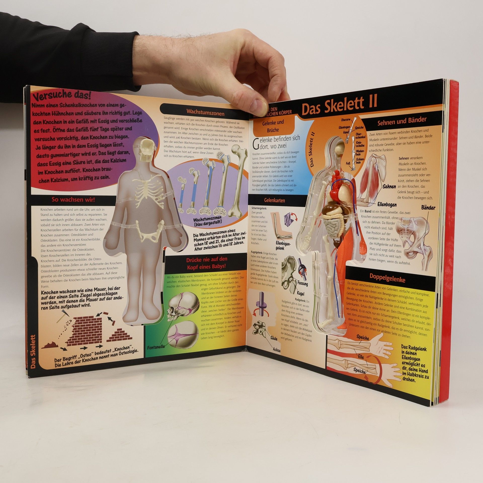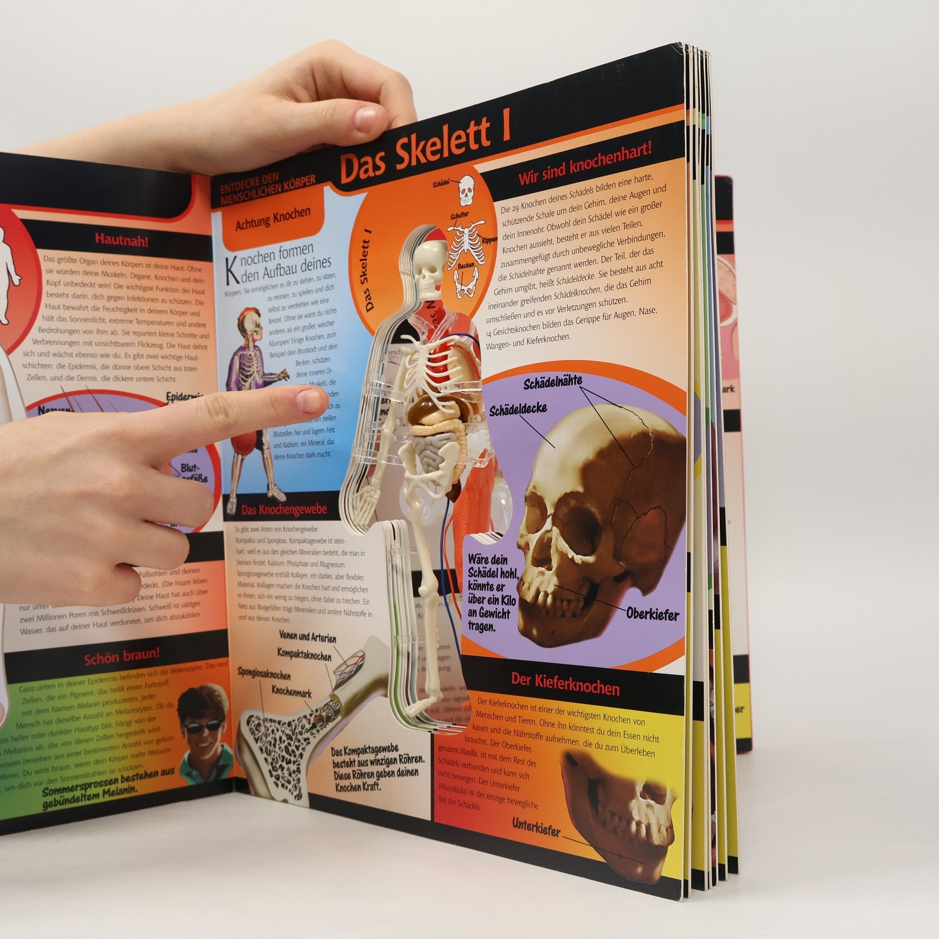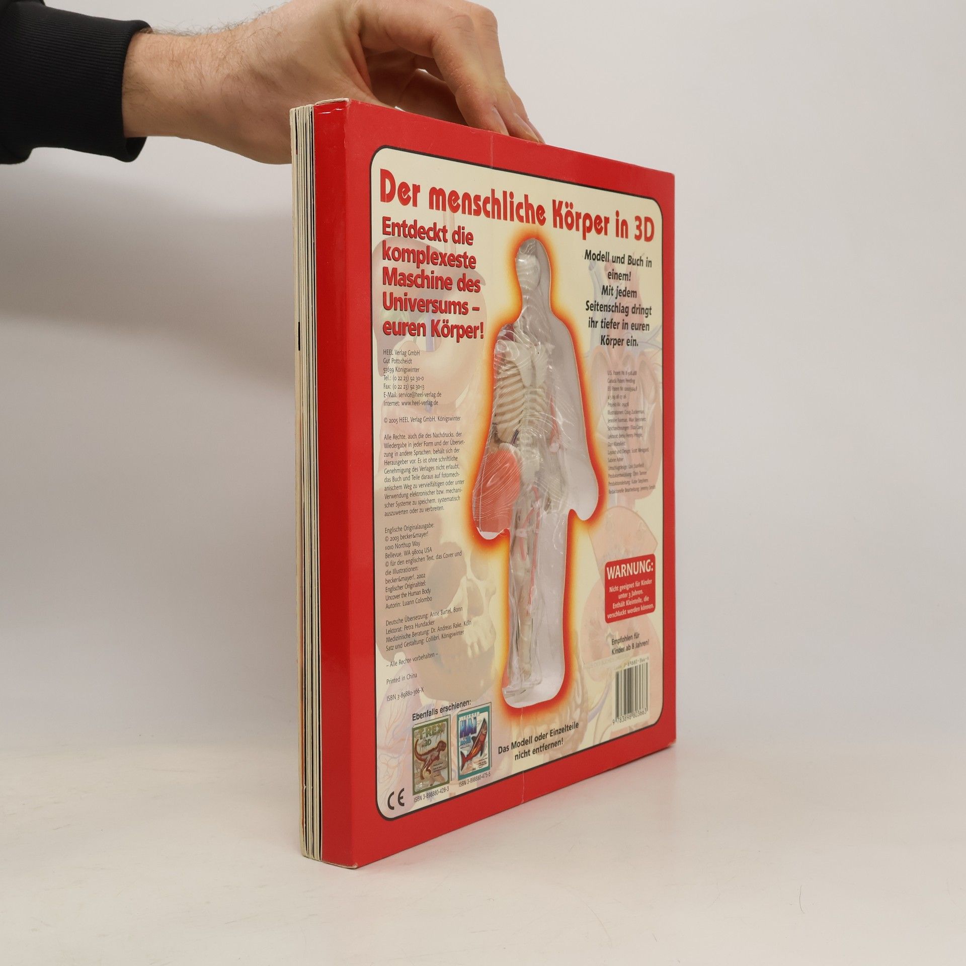 Lernen Sie und Ihre Kinder alles über die komplexeste maschine des Universums - Ihren Körper - und werfen Sie einen umwerfenden, dreidimensionalen Blick in dieses faszinierende Gebilde. Durch das aufschlagen jeder Seite dringen Sie eine Schicht tiefer in dieses Wunderwerk hinein und erafhren in leicht verständlichen und informativen Texten alles Wissenswerte. Ein detailliertes, mesnchliches Kunsstoff-Skelett in der Mitte, das sich ebenfalls mit jedem Seitenschlag verändert, und zusätlich viele Tipps und Experimente machen dieses besondere Buch zu einem eindrucksvollen Erlebnis, das Sie nicht vermissen sollten.