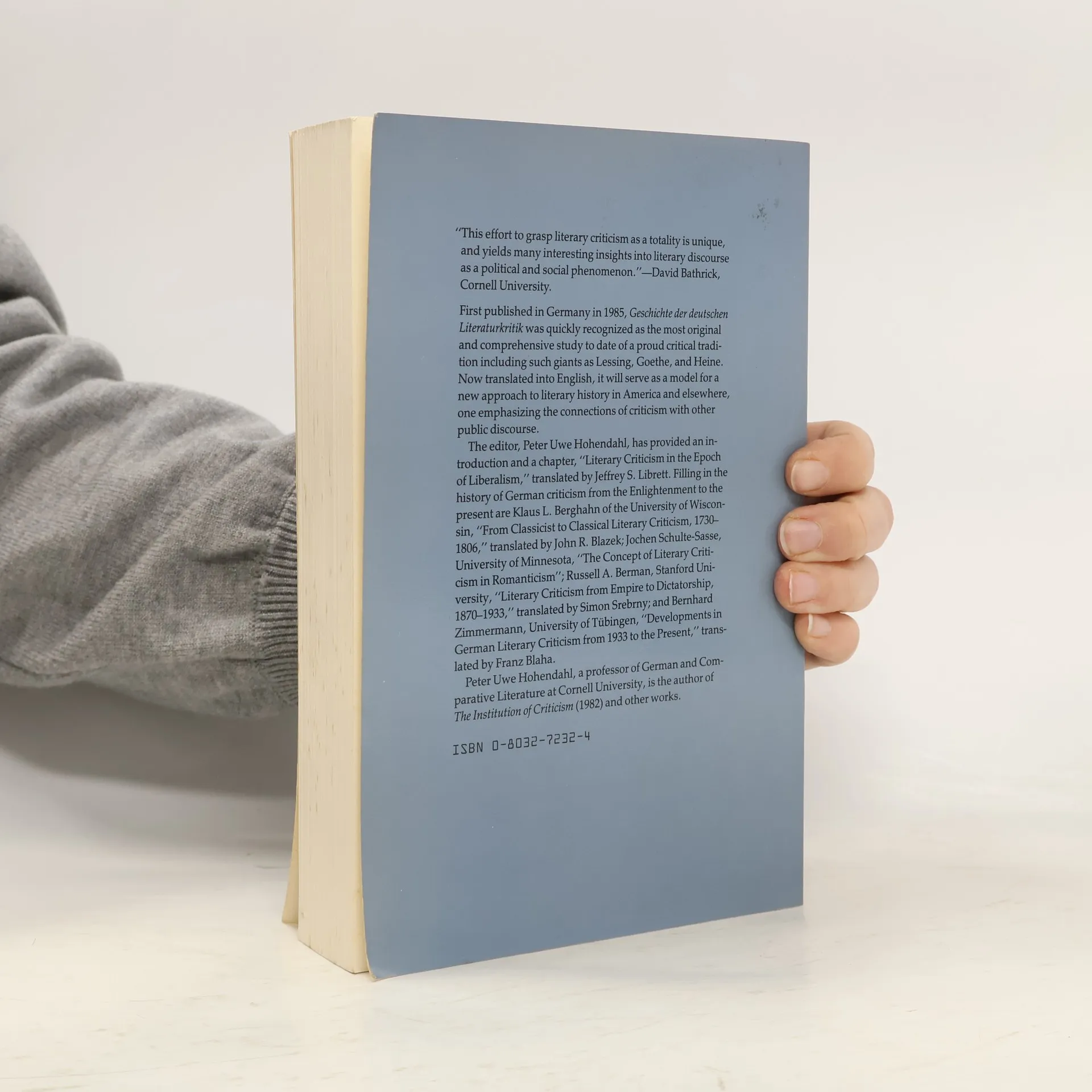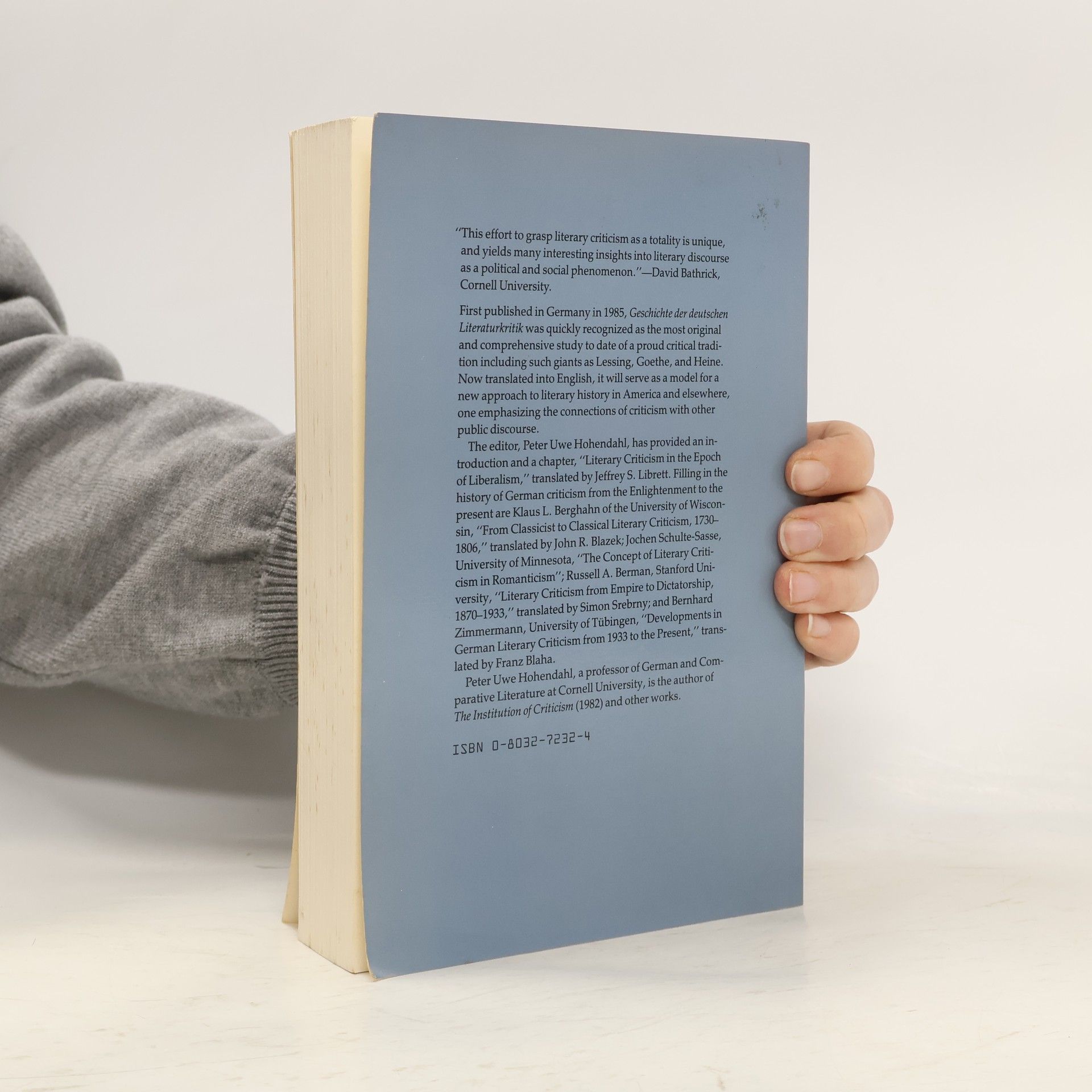 First published in Germany in 1985, Geschichte der deutschen Literaturkritik was quickly recognized as the most original and comprehensive study to date of a proud critical tradition including such giants as Lessing, Goethe, and Heine. Now translated into English, it will serve as a model for a new approach to literary history in America and elsewhere, one emphasizing the connections of criticism with other public discourse. The editor, Peter Uwe Hohendahl, has provided an introduction and a chapter, "Literary Criticism in the Epoch of Liberalism,"translated by Jeffrey S. Librett. Filling in the history of German criticism from the Enlightenment to the present are Klaus L. Berghahn of the University of Wisconsin, "From Classicist to Classical Literary Criticism, 1730-1806," translated by John R. Blazek; Jochen Schulte-Sasse, University of Minnesota, "The Concept of Literary Criticism in Romanticism"; Russell A. Berman, Stanford University, "Literary Criticism from Empire to Dictatorship, 1870-1933,"; translated by Simon Srebrny; and Bernhard Zimmerman, University of Tübingen, "Developments in German Literary Criticism from 1933 to the Present," translated by Franz Blaha.