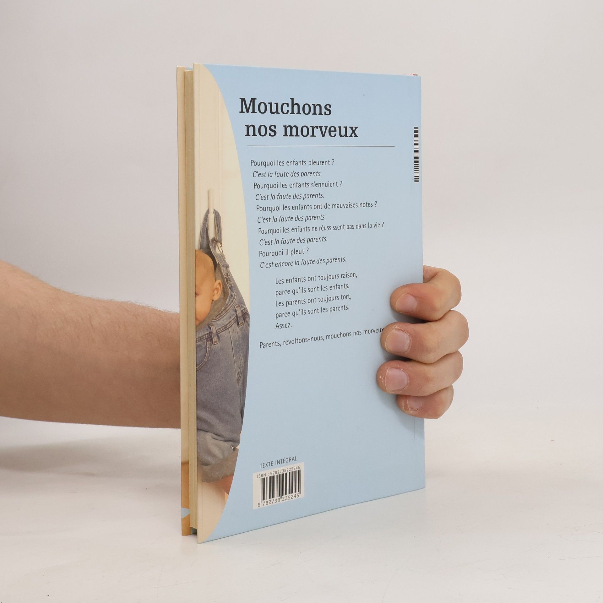 Pourquoi les enfants pleurent ? C'est la faute des parents. Pourquoi les enfants s'ennuient ? C'est la faute des parents. Pourquoi les enfants ont de mauvaises notes ? C'est la faute des parents. Pourquoi les enfants ne réussissent pas dans la vie ? C'est la faute des parents. Pourquoi il pleut ? C'est encore la faute des parents. Les enfants ont toujours raison, parce qu'ils sont les enfants. Les parents ont toujours tort, parce qu'ils sont les parents. Assez. Parents, révoltons-nous, mouchons nos morveux !