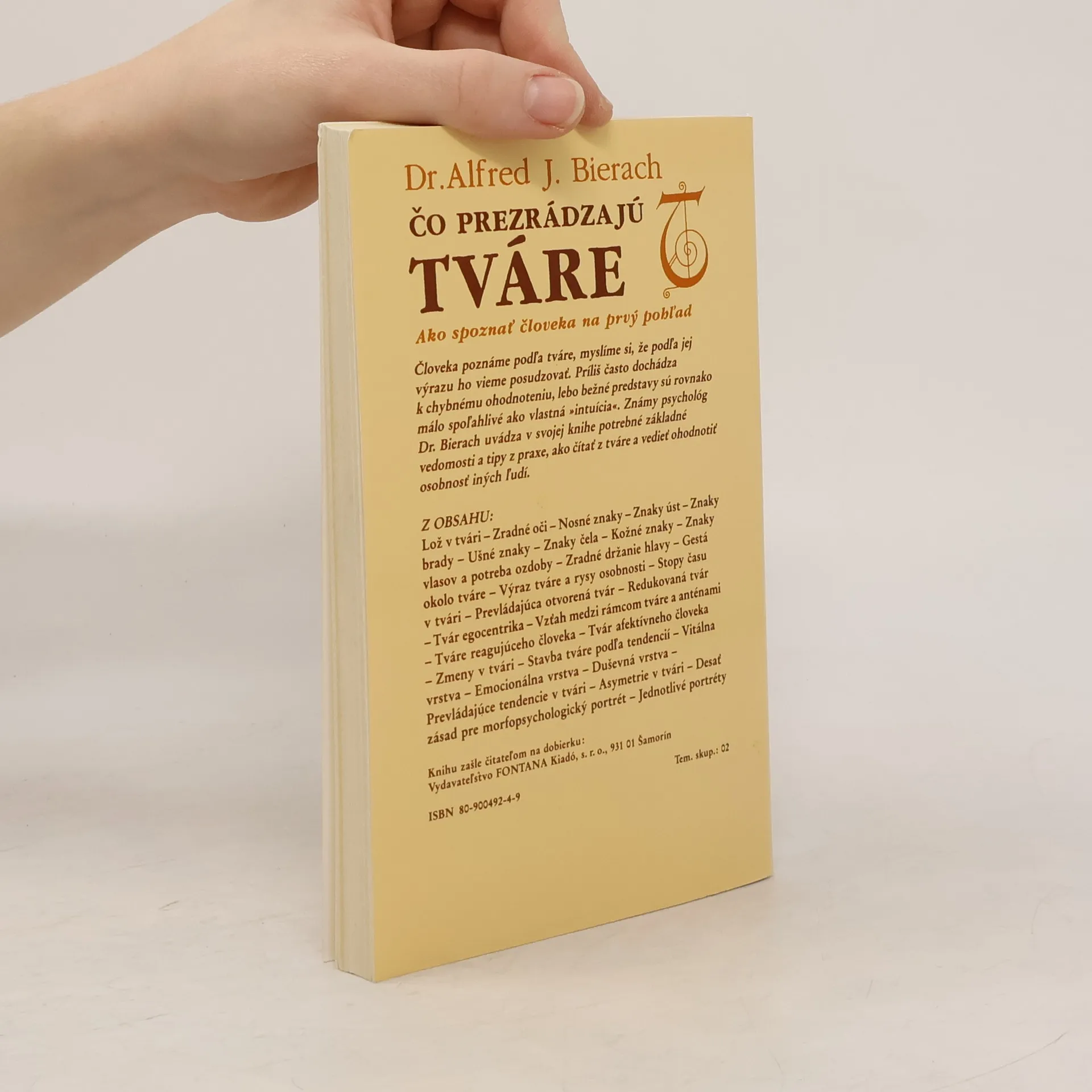 Ako spoznať človeka na prvý pohľad Človeka poznáme podľa tváre, myslíme si, že podľa jej výrazu ho vieme posudzovať. Príliš často dochádza k chybnému ohodnoteniu, lebo bežné predstavy sú rovnako málo spoľahlivé ako vlastná »intuícia«. Známy psychológ Dr. Bierach uvádza v svojej knihe potrebné základné vedomosti a tipy z praxe, ako čítať z tváre a vedieť ohodnotiť osobnosť iných ľudí. Z obsahu: Lož v tvári — Zradné oči — Nosné znaky — Znaky úst — Znaky brady — Ušné znaky — Znaky čela — Kožné znaky — Znaky vlasov a potreba ozdoby — Zradné držanie hlavy — Gestá okolo tváre — Výraz tváre a rysy osobnosti — Stopy času v tvári — Prevládajúca otvorená tvár — Redukovaná tvár — Tvár egocentrika — Vzťah medzi rámcom tváre a anténami — Tváre reagujúceho človeka — Tvár afektívneho človeka — Zmeny v tvári — Stavba tváre podľa tendencií — Vitálna vrstva — Emocionálna vrstva — Duševná vrstva — Prevládajúce tendencie v tvári — Asymetrie v tvári — Desať zásad pre morfopsychologický portrét — Jednotlivé portréty Prvé slovenské vydanie