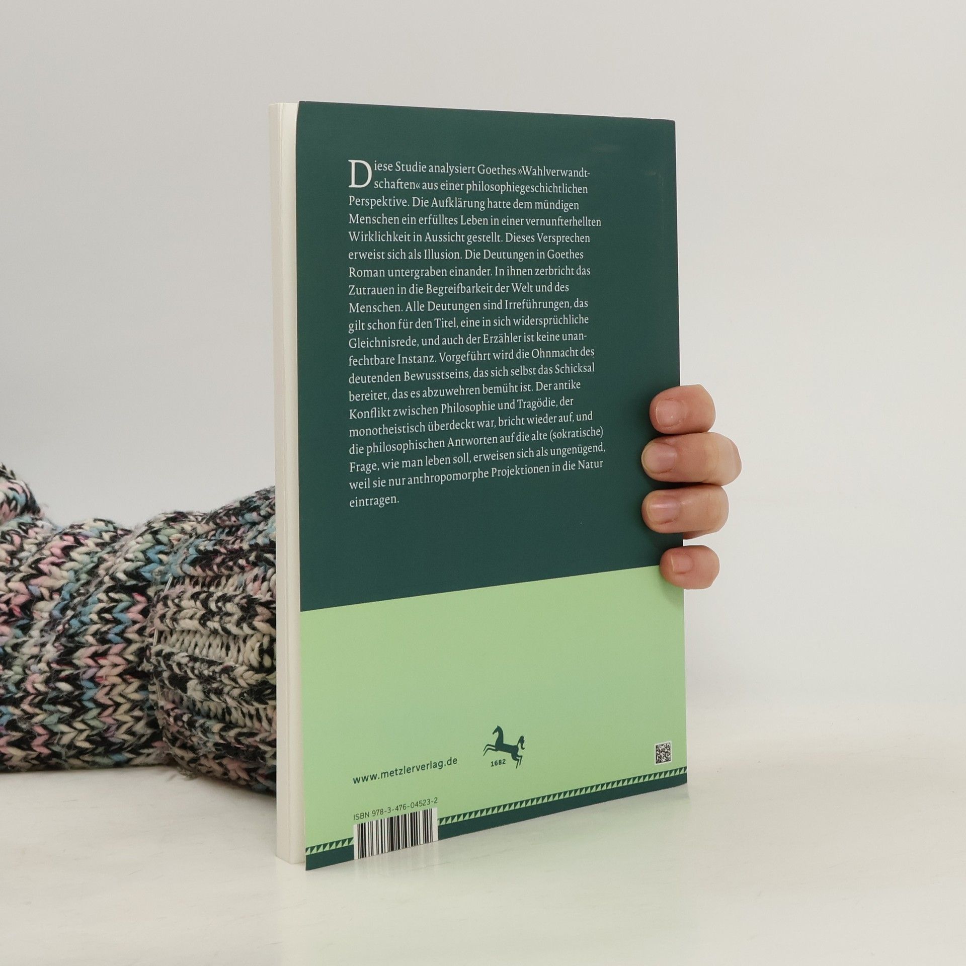 Diese Studie analysiert Goethes „Wahlverwandtschaften“ aus einer philosophiegeschichtlichen Perspektive. Die Aufklärung hatte dem mündigen Menschen ein erfülltes Leben in einer vernunfterhellten Wirklichkeit in Aussicht gestellt. Dieses Versprechen erweist sich als Illusion. Die Deutungen in Goethes Roman untergraben einander. In ihnen zerbricht das Zutrauen in die Begreifbarkeit der Welt und des Menschen. Alle Deutungen sind Irreführungen, das gilt schon für den Titel, eine in sich widersprüchliche Gleichnisrede, und auch der Erzähler ist keine unanfechtbare Instanz. Vorgeführt wird die Ohnmacht des deutenden Bewusstseins, das sich selbst das Schicksal bereitet, das es abzuwehren bemüht ist. Der antike Konflikt zwischen Philosophie und Tragödie, der monotheistisch überdeckt war, bricht wieder auf, und die philosophischen Antworten auf die alte (sokratische) Frage, wie man leben soll, erweisen sich als ungenügend, weil sie nur anthropomorphe Projektionen in die Natur eintragen.