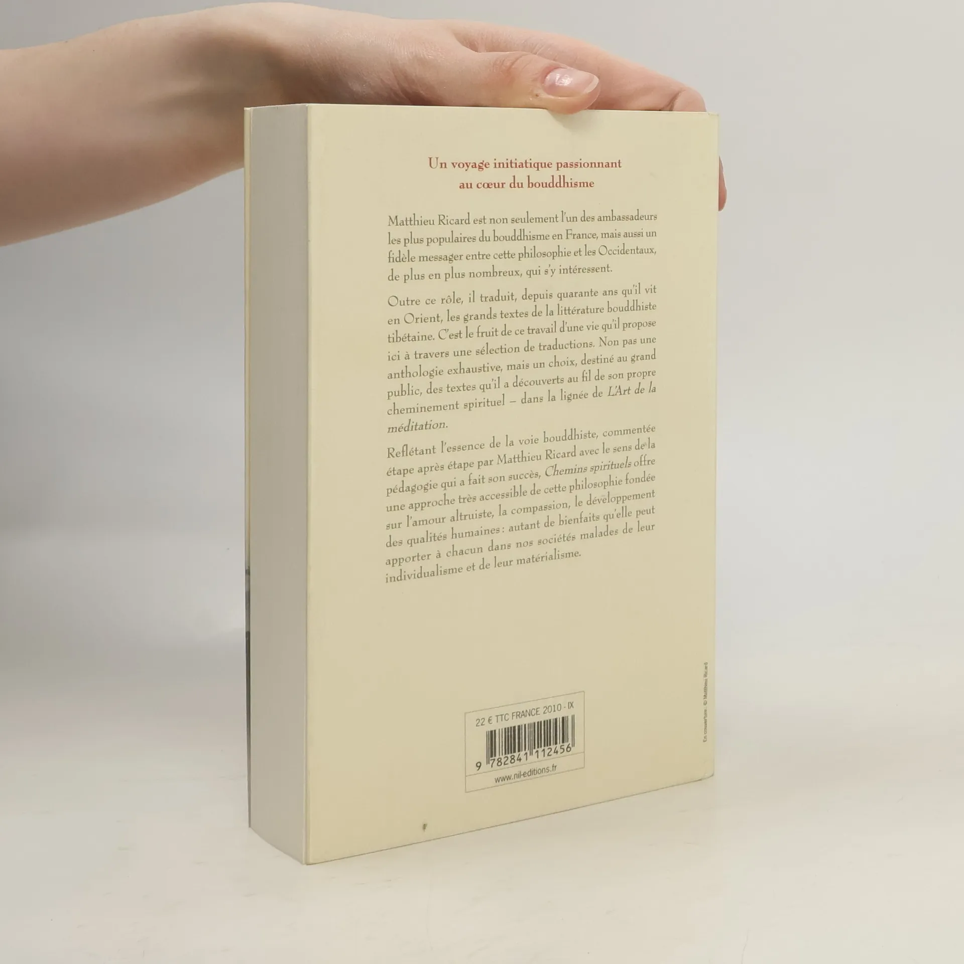 Matthieu Ricard est non seulement l'un des ambassadeurs les plus populaires du bouddhisme en France, mais aussi un fidèle messager entre cette philosophie et les Occidentaux, de plus en plus nombreux, qui s'y intéressent. Outre ce rôle, il traduit, depuis quarante ans qu'il vit en Orient, les grands textes de la littérature bouddhiste tibétaine. C'est le fruit de ce travail d'une vie qu'il propose ici à travers une sélection de traductions. Non pas une anthologie exhaustive, mais un choix, destiné au grand public, des textes qu'il a découverts au fil de son propre cheminement spirituel - dans la lignée de l'Art de la méditation. Reflétant l'essence de la voie bouddhiste, commentée étape après étape par Matthieu Ricard avec le sens de la pédagogie qui a fait son succès, Chemins spirituels offre une approche très accessible de cette philosophie fondée sur l'amour altruiste, la compassion, le développement des qualités humaines : autant de bienfaits qu'elle peut apporter à chacun dans nos sociétés malades de leur individualisme et de leur matérialisme.