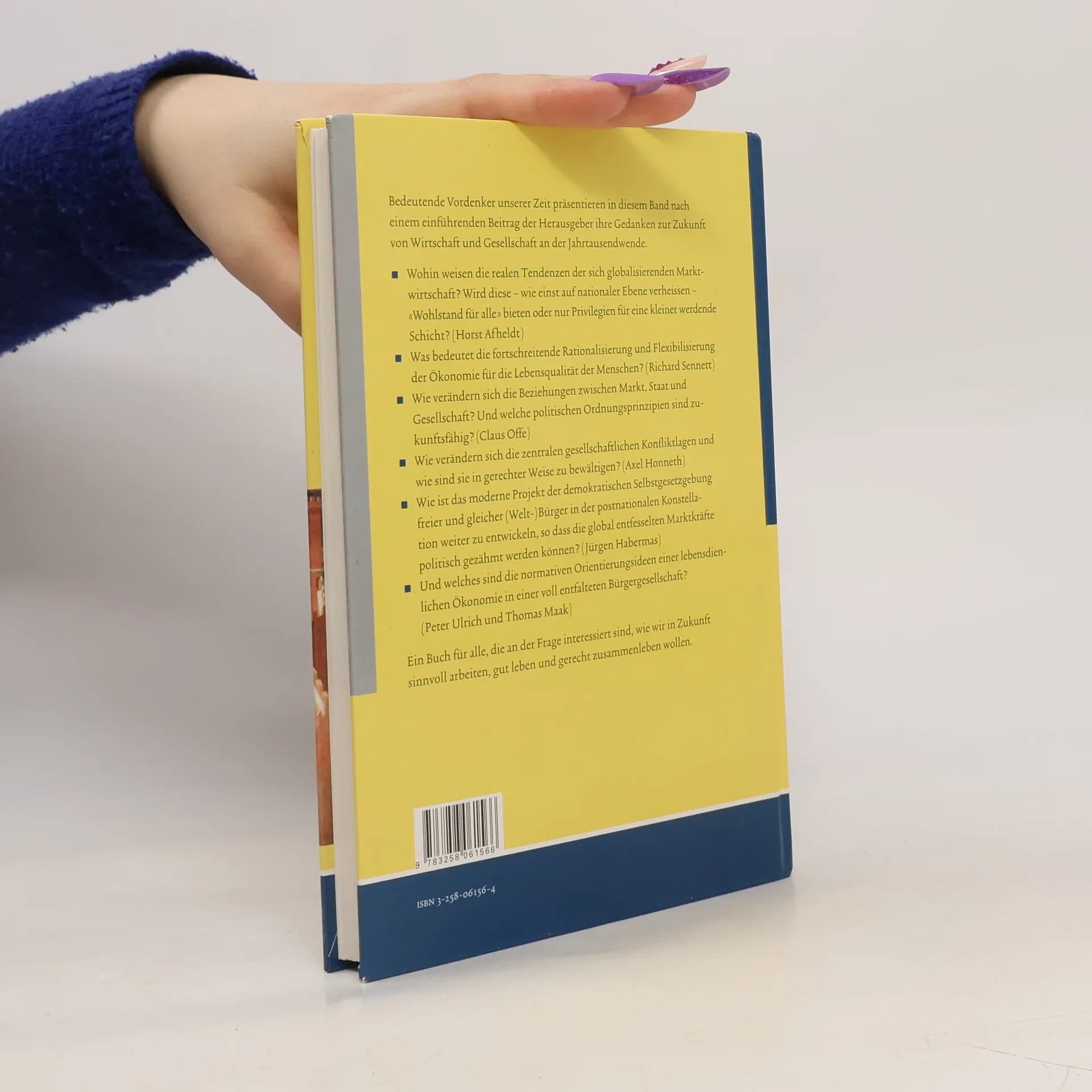 Fünf bedeutende Intellektuelle – Horst Afheldt, Jürgen Habermas, Axel Honneth, Claus Offe und Richard Sennett – teilen in diesem Band ihre Überlegungen zur Zukunft von Wirtschaft und Gesellschaft an der Jahrtausendwende. Im Mittelpunkt steht die Entwicklungsperspektive des komplexen Verhältnisses zwischen Politik und Wirtschaft. Die Beiträge basieren auf einem öffentlichen Vortragszyklus des Instituts für Wirtschaftsethik an der Universität St. Gallen, der auf großes Interesse stieß. Die Autoren präsentieren vor allem fachwissenschaftliche Analysen, die zu einer scharfen Kritik der gegenwärtigen Politik führen, und bieten auch anderen Gesellschaftskritikern wertvolle Perspektiven. Die Analysen sind scharfsinnig und teilweise brillant formuliert, mit Vorschlägen zur sinnvollen Organisation der Arbeit und für ein gerechtes Zusammenleben. Das Buch richtet sich an Leser, die Wirtschaft nicht nur als kurzfristiges Geschäft betrachten, sondern an Zusammenhängen und Zukunftsperspektiven interessiert sind. Besonders hervorzuheben sind die Beiträge von Habermas, Afheldt und Ulrich/Maak, die zwischen düsteren Prognosen und idealistischen Ansätzen einen illusionslosen, aber mutigen diagnostischen Blick präsentieren.