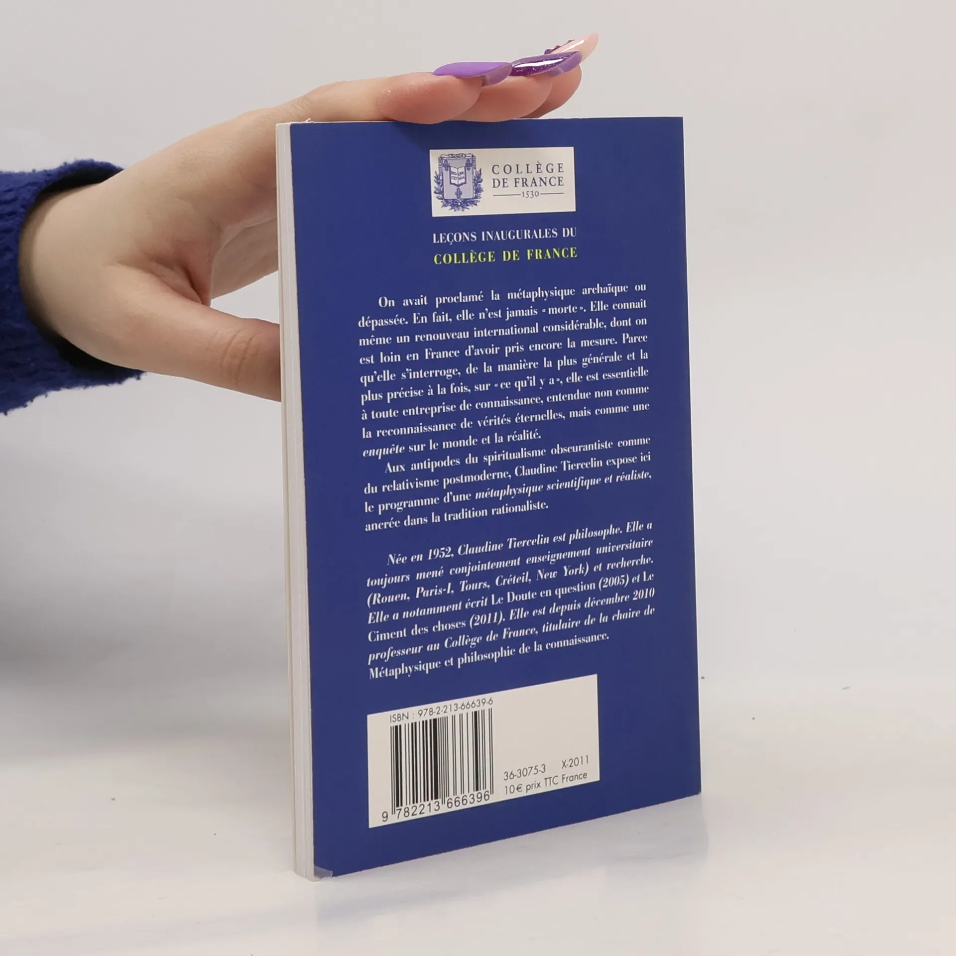 On avait proclam� la m�taphysique archa�que ou d�pass�e. En fait, elle n'est jamais � morte �. Elle conna�t m�me un renouveau international consid�rable, dont on est loin en France d'avoir pris encore la mesure. Parce qu'elle s'interroge, de la mani�re la plus g�n�rale et la plus pr�cise � la fois, sur � ce qu'il y a �, elle est essentielle � toute entreprise de connaissance, entendue non comme la reconnaissance de v�rit�s �ternelles, mais comme une enqu�te sur le monde et la r�alit�. Aux antipodes du spiritualisme obscurantiste comme du relativisme postmoderne, Claudine Tiercelin expose ici le programme d'une m�taphysique scientifique et r�aliste, ancr�e dans la tradition rationaliste.<i>N�e en 1952, Claudine Tiercelin est philosophe. Elle a toujours men� conjointement enseignement universitaire (Rouen, Paris-1, Tours, Cr�teil, New York) et recherche. Elle a notamment �crit Le doute en question (2005) et Le Ciment des choses (2011). Elle est depuis d�cembre 2010 professeur au Coll�ge de France, titulaire de la chaire de </i>M�taphysique et philosophie de la connaissance.