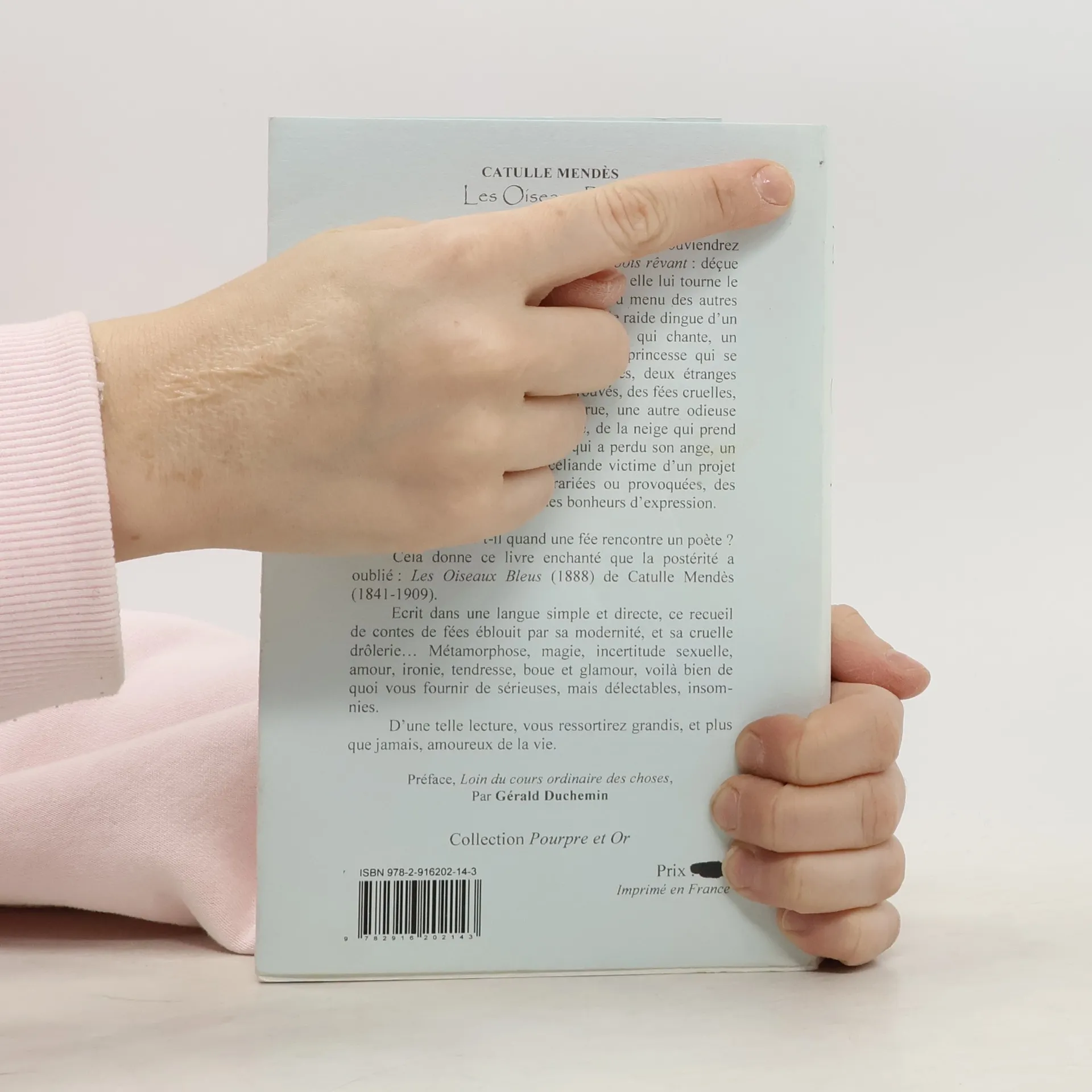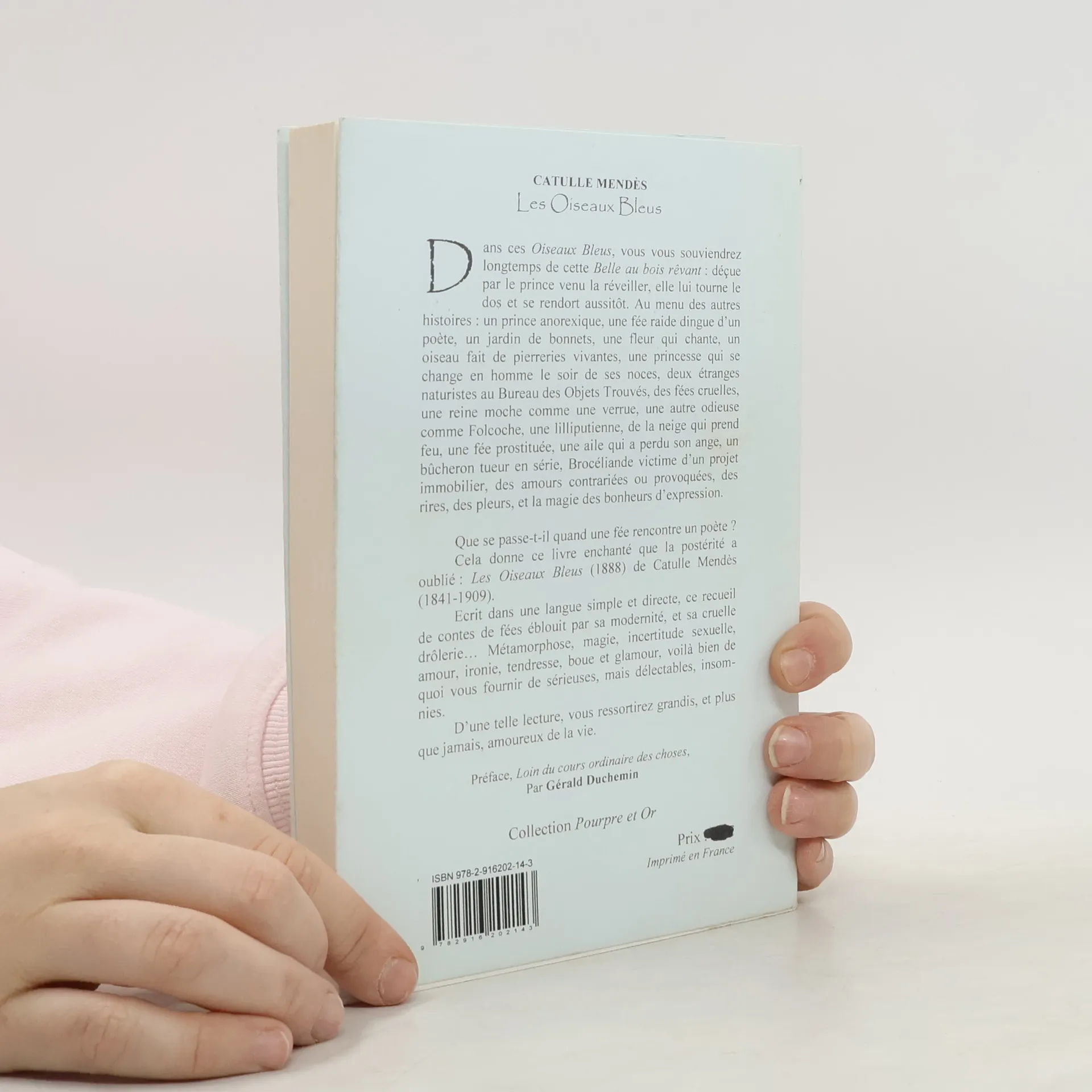 Dans ces Oiseaux Bleus, vous vous souviendrez longtemps de cette Belle au bois rêvant : déçue par le prince venu la réveiller, elle lui tourne le dos et se rendort aussitôt. Au menu des autres histoires : un prince anorexique, une fée raide dingue d’un poète, un jardin de bonnets, une fleur qui chante, un oiseau fait de pierreries vivantes, une princesse qui se change en homme le soir de ses noces, deux étranges naturistes au Bureau des Objets Trouvés, des fées cruelles, une reine moche comme une verrue, une autre odieuse comme Folcoche, une lilliputienne, de la neige qui prend feu, une fée prostituée, une aile qui a perdu son ange, un bûcheron tueur en série, Brocéliande victime d’un projet immobilier, des amours contrariées ou provoquées, des rires, des pleurs, et la magie des bonheurs d’expression. Que se passe-t-il quand une fée rencontre un poète ? Cela donne ce livre enchanté que la postérité a oublié : Les Oiseaux Bleus (1888) de Catulle Mendès (1841-1909). Ecrit dans une langue simple et directe, ce recueil de contes de fées éblouit par sa modernité, et sa cruelle drôlerie… Métamorphose, magie, incertitude sexuelle, amour, ironie, tendresse, boue et glamour, voilà bien de quoi vous fournir de sérieuses, mais délectables, insomnies. D'une telle lecture, vous ressortirez grandis, et plus que jamais, amoureux de la vie. Préface, Loin du cours ordinaire des choses, Par Gérald Duchemin