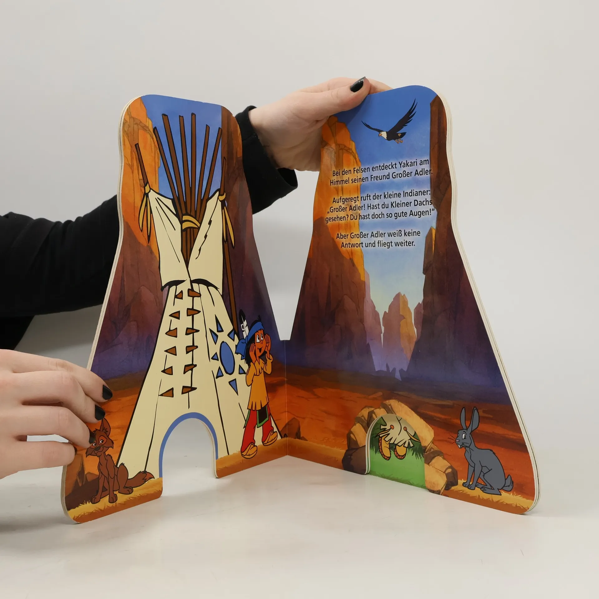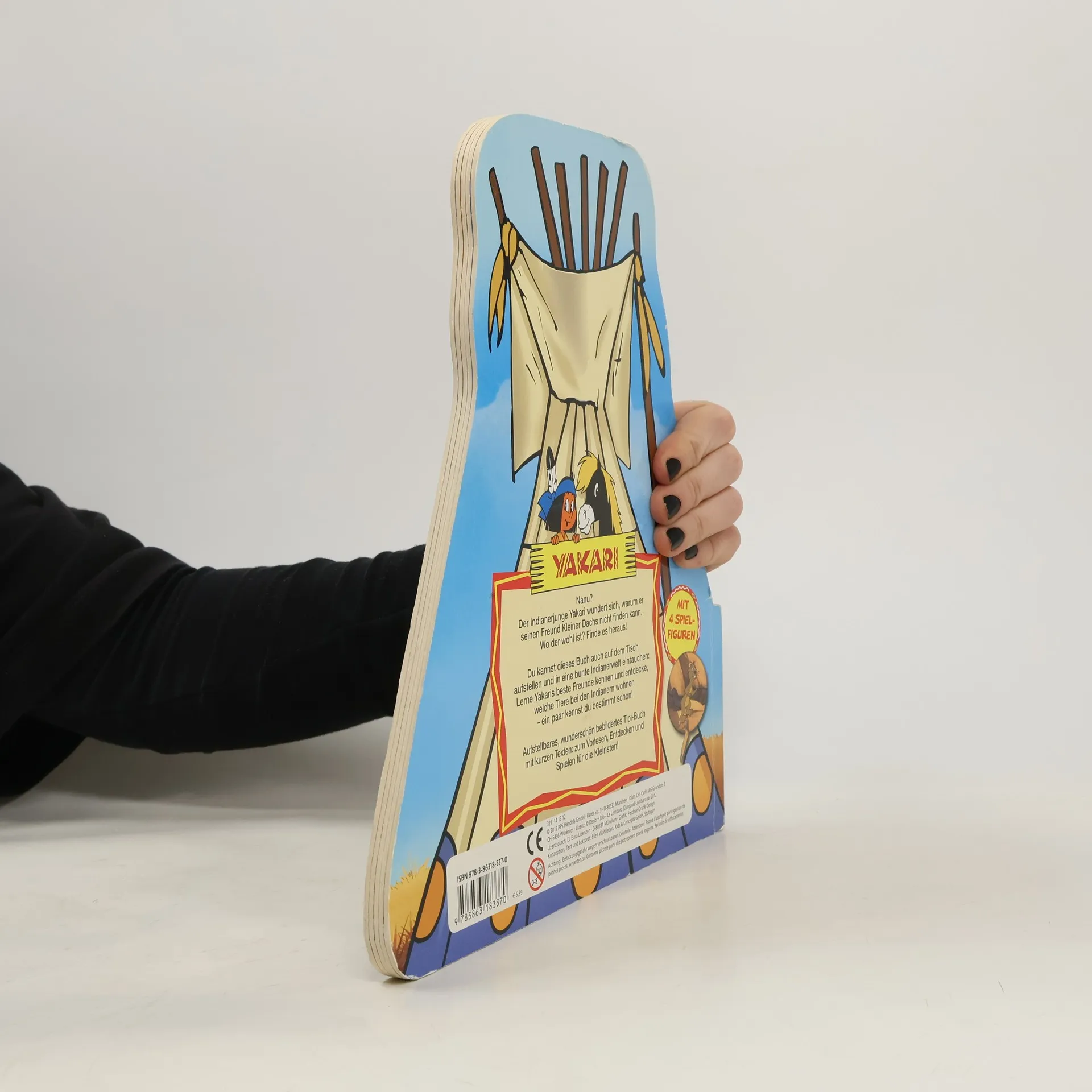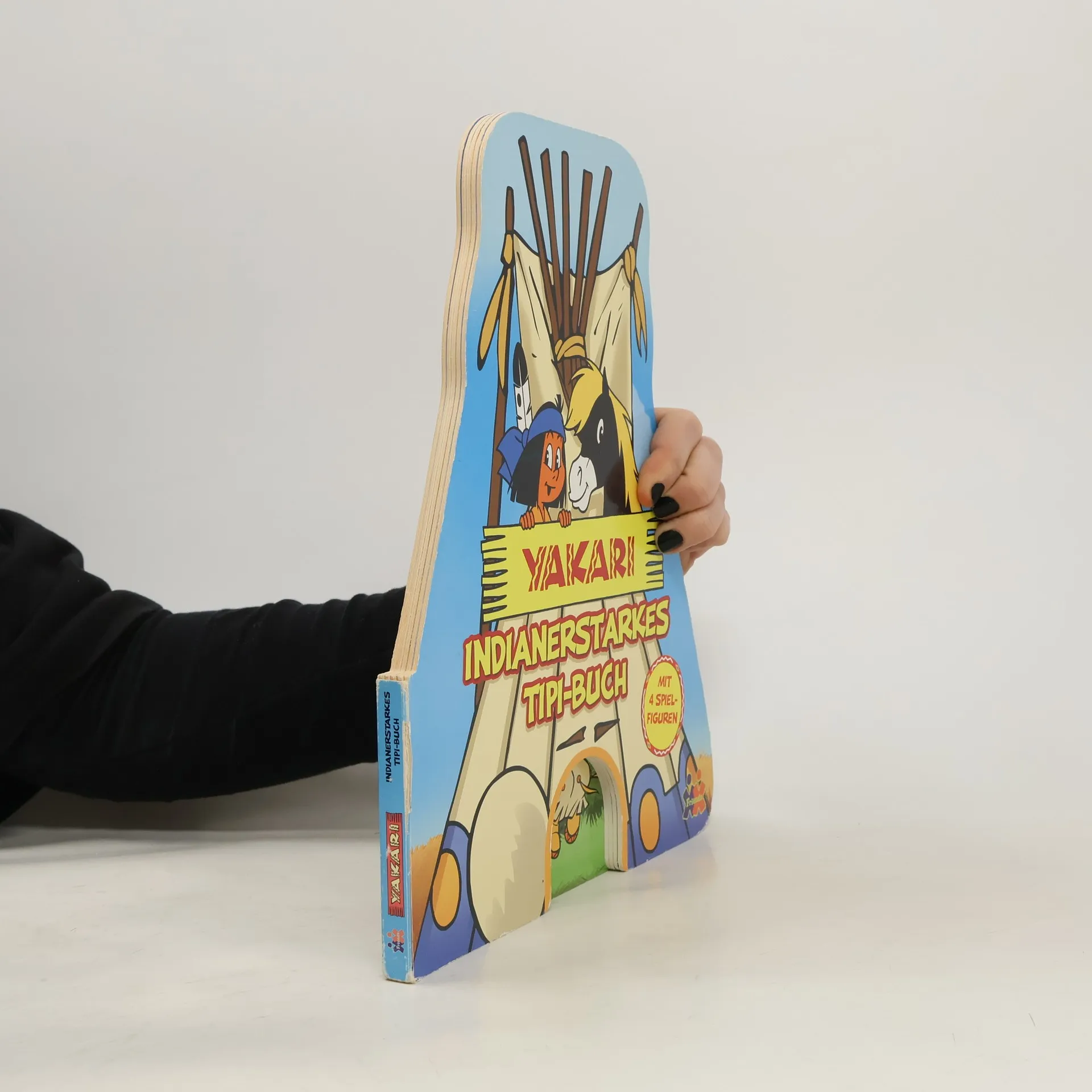 Ein formgestanztes Pappbilderbuch in Form eines Tipis erzählt die Geschichte des Indianerjungen Yakari, der seinen Freund Kleiner Dachs sucht. Das Buch kann aufgestellt und zum Spielen verwendet werden, ergänzt durch kleine Pappaufsteller von Yakari-Tieren.