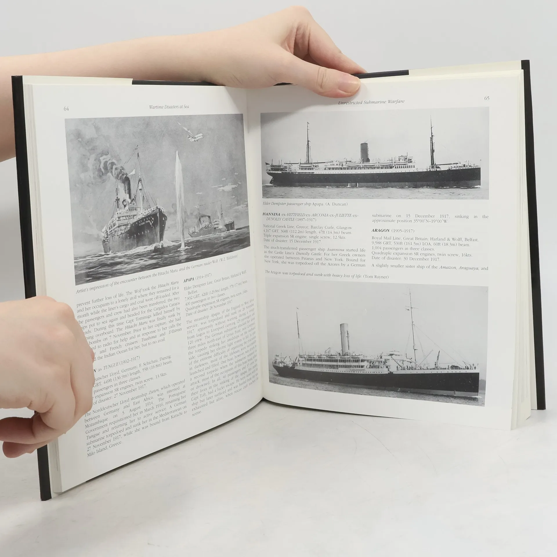 During WWI and WWII more than 400 passenger ships were sunk following torpedo strikes, surface shellfire, aerial bombardment, or scuttling. Here are details of every deep-sea passenger carrying vessel lost either in regular commercial service or in temporary auxiliary duties. Year-by-year chapters for 1914-18 and 1939-45 contain ships name, year built, owner, builder, tonnage, length, engine type, description of the incident providing date, position, circumstances, cause and number of casualties.