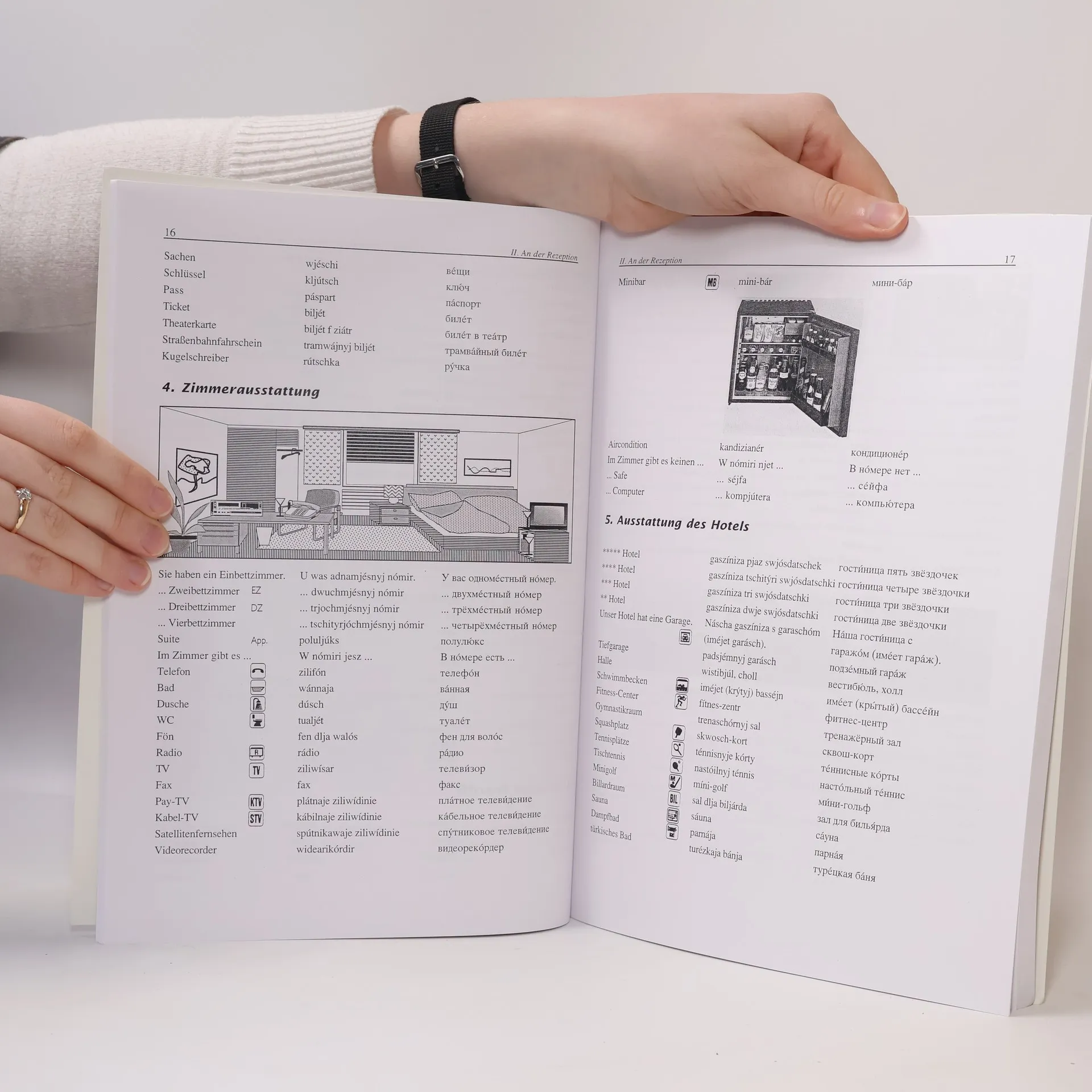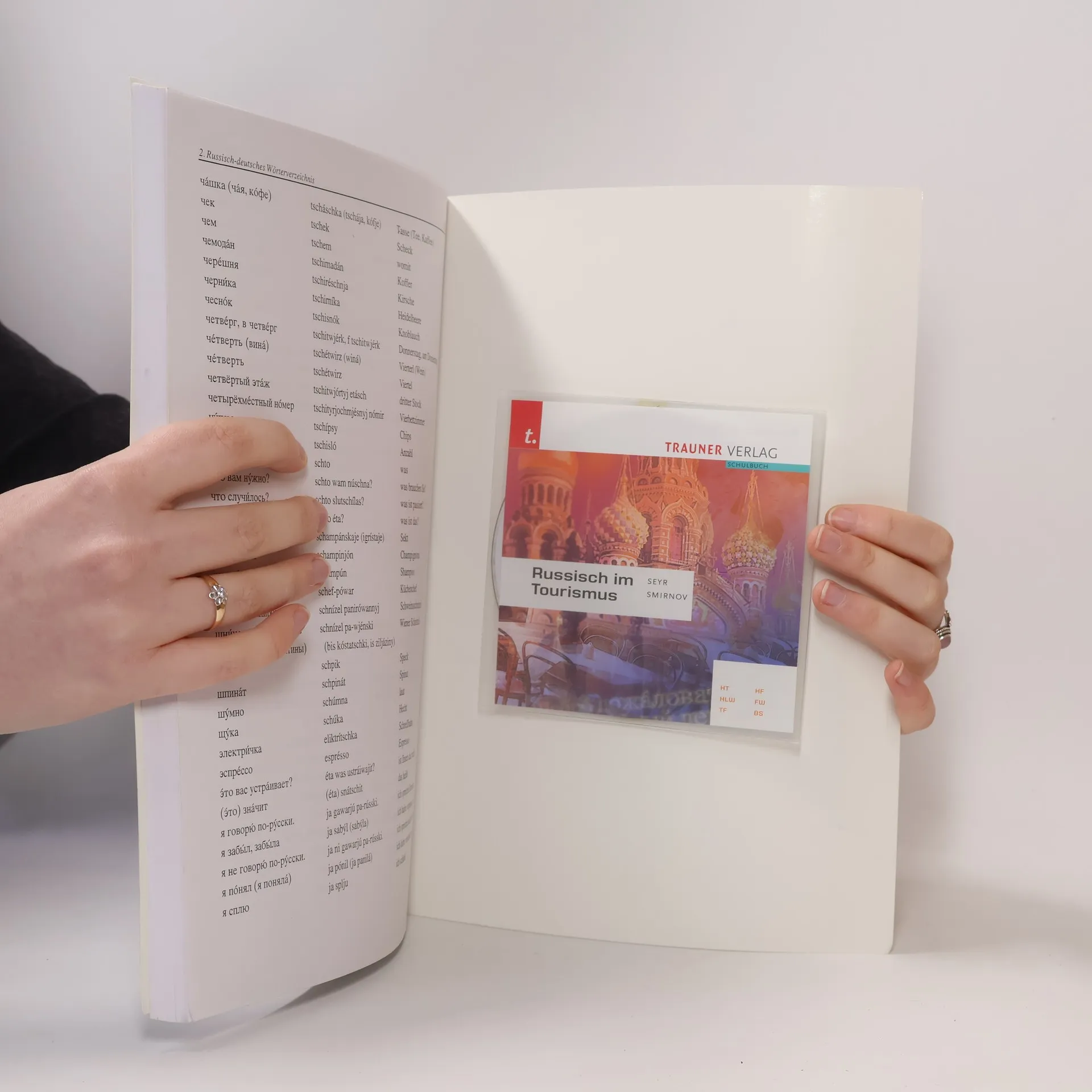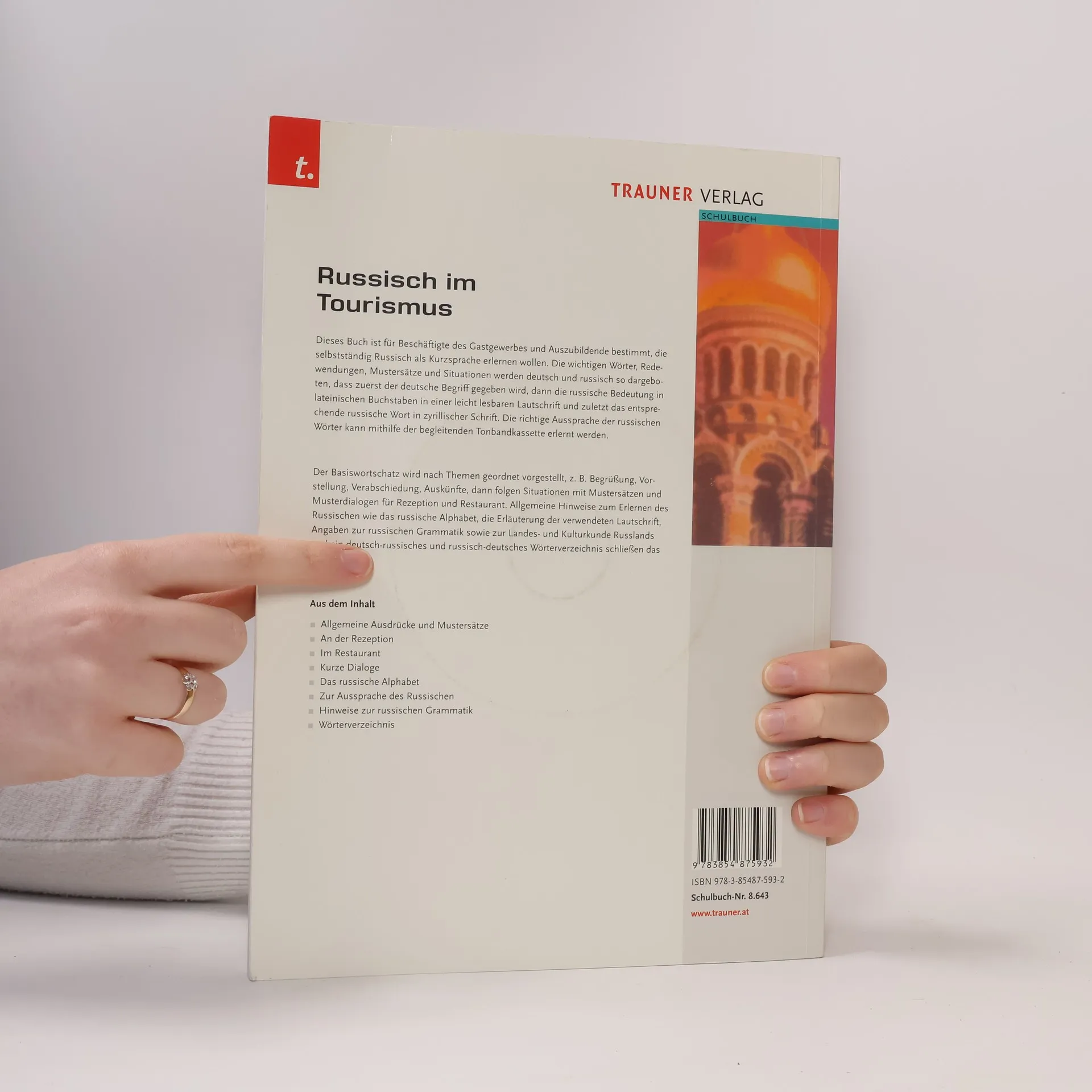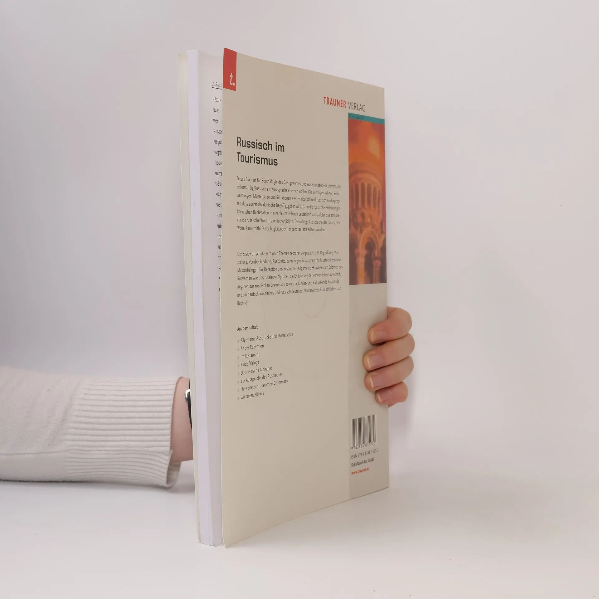 Dieses Buch ist für Beschäftigte des Gastgewerbes und Auszubildende bestimmt, die selbstständig Russisch als Kurzsprache erlernen wollen. Die wichtigen Wörter, Redewendungen, Mustersätze und Situationen werden deutsch und russisch so dargeboten, dass zuerst der deutsche Begriff gegeben wird, dann die russische Bedeutung in lateinischen Buchstaben in einer leicht lesbaren Lautschrift und zuletzt das entsprechende russische Wort in zyrillischer Schrift. Die richtige Aussprache der russischen Wörter kann mithilfe der begleitenden Tonbandkassetten erlernt werden. Der Basiswortschatz wird nach Themen geordnet vorgestellt, zB Begrüßung, Vorstellung, Verabschiedung, Auskünfte, dann folgen Situationen mit Mustersätzen und Musterdialogen für Rezeption und Restaurant. Allgemeine Hinweise zum Erlernen des Russischen wie das russische Alphabet, die Erläuterung der verwendeten Lautschrift, Angaben zur russischen Grammatik sowie zur Landes- und Kulturkunde Russlands und ein deutsch-russisches und russisch-deutsches Wörterverzeichnis schließen das Buch ab.