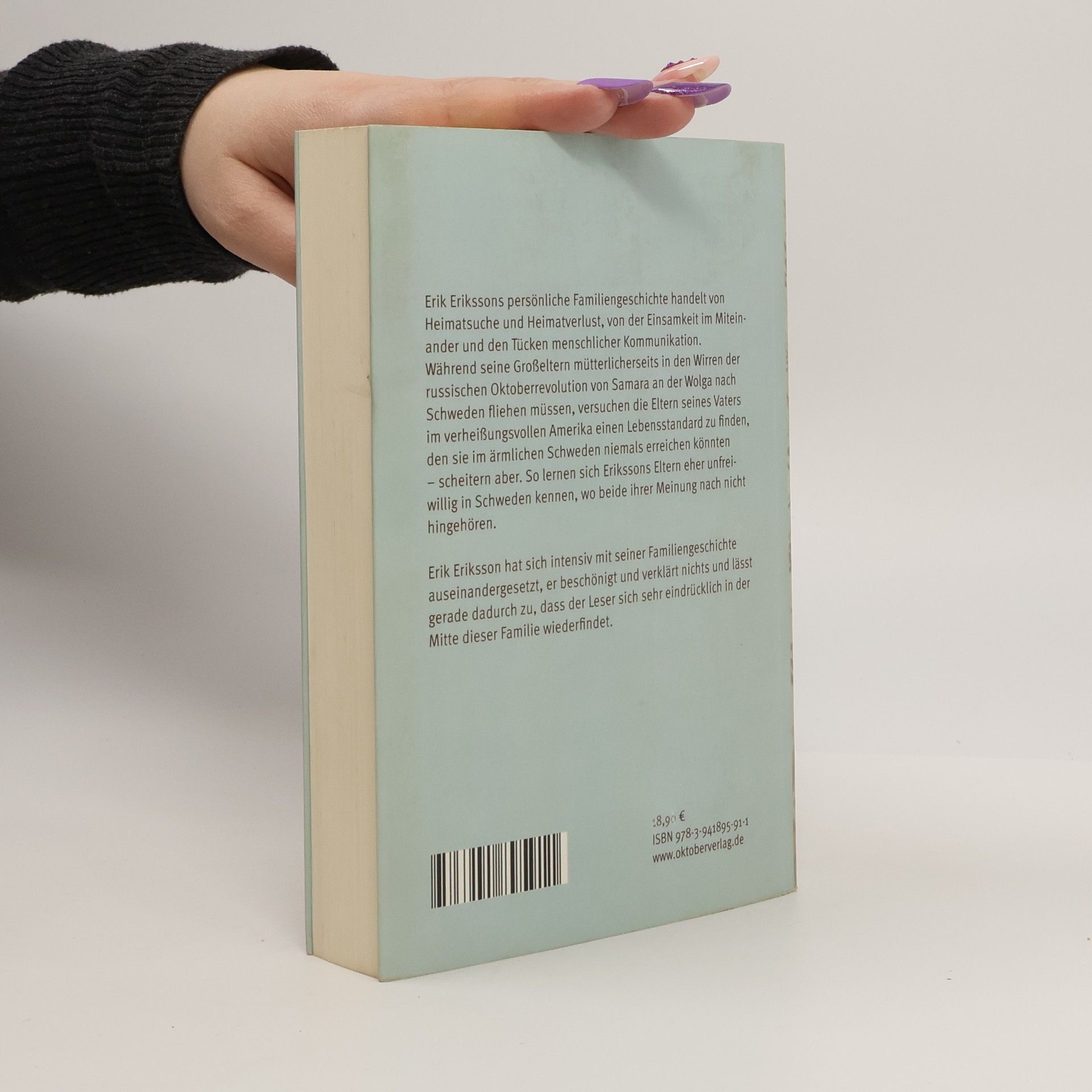 Erik Erikssons persönliche Familiengeschichte handelt von Heimatsuche und Heimatverlust, von der Einsamkeit im Miteinander und den Tücken menschlicher Kommunikation. Während seine Großeltern mütterlicherseits in den Wirren der russischen Oktoberrevolution von Samara an der Wolga nach Schweden fliehen müssen, versuchen die Eltern seines Vaters im verheißungsvollen Amerika einen Lebensstandard zu finden, den sie im ärmlichen Schweden niemals erreichen könnten – scheitern aber. So lernen sich Erikssons Eltern eher unfreiwillig in Schweden kennen, wo beide ihrer Meinung nach nicht hingehören. Erik Eriksson hat sich intensiv mit seiner Familiengeschichte auseinandergesetzt, er beschönigt und verklärt nichts und lässt gerade dadurch zu, dass der Leser sich sehr eindrücklich in der Mitte dieser Familie wiederfindet.