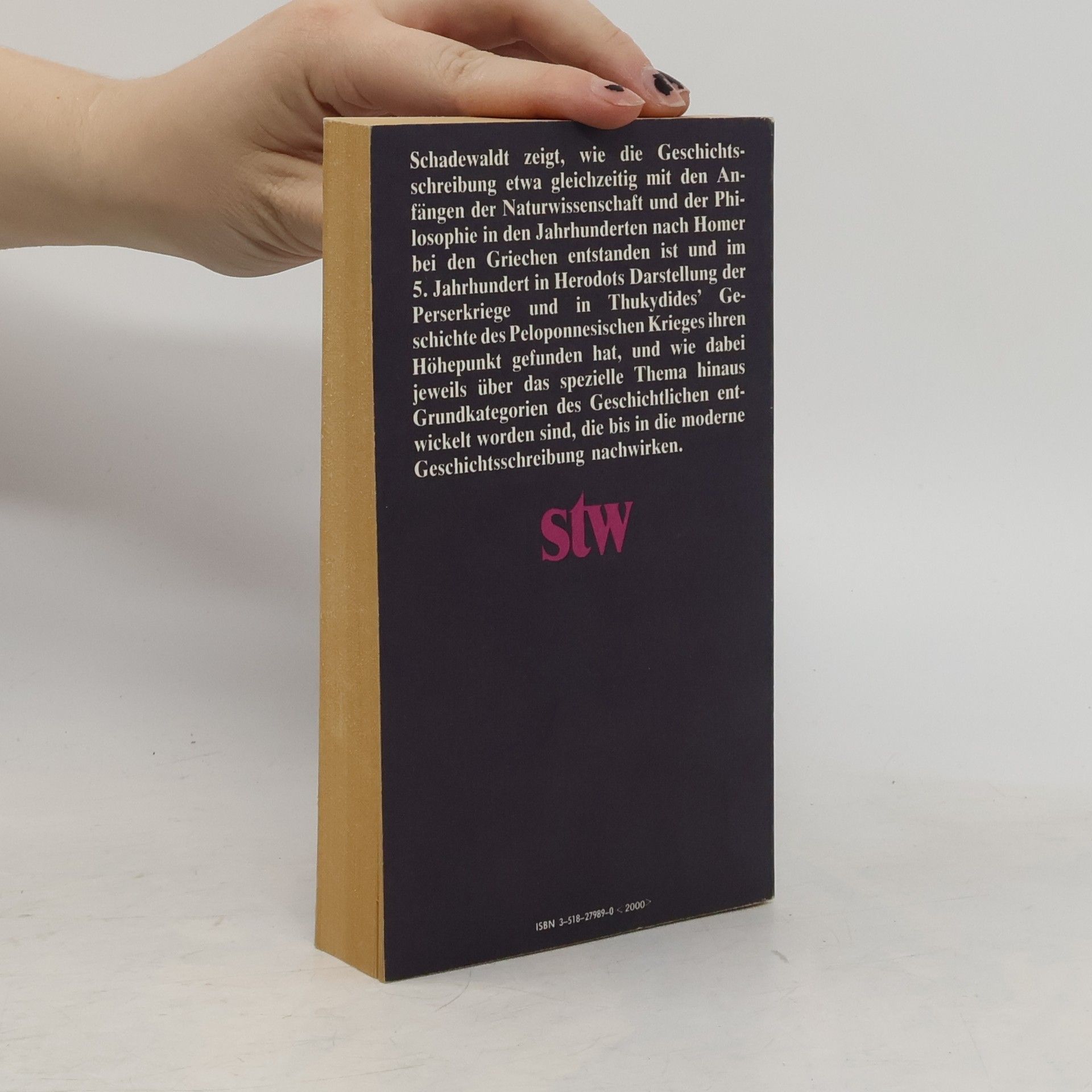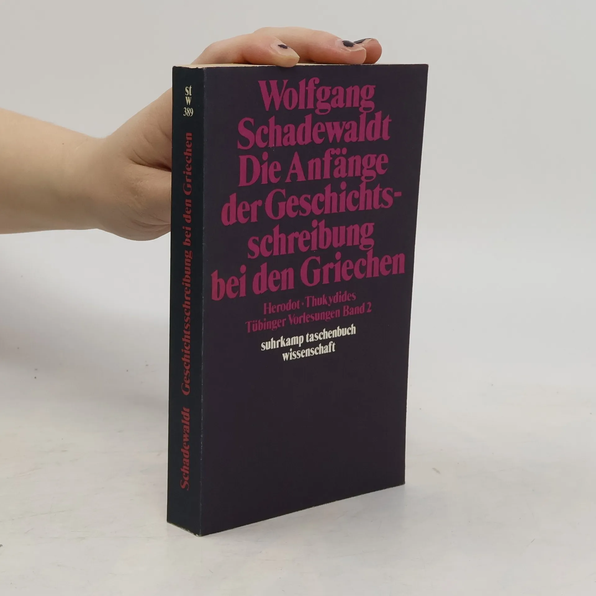 Die griechische Geschichtsschreibung ist neben Dichtung und Philosophie ein dritter großer Themenkreis, der Wolfgang Schadewaldt sein ganzes Leben hindurch beschäftigt hat. Der zweite Band seiner Tübinger Vorlesungen enthält die beiden Vorlesungen: »Herodot. Die Anfänge der Geschichtsschreibung bei den Griechen« (1959) und »Thukydides« (1961/62). Die Tübinger Vorlesungen Wolfgang Schadewaldts liegen in vier Bänden vor: Band 1: Die Anfänge der Philosophie bei den Griechen (stw 218) Band 2: Die Anfänge der Geschichtsschreibung bei den Griechen (stw 389) Band 3: Die frühgriechische Lyrik (stw 783) Band 4: Sophokles. Euripides (stw 948)