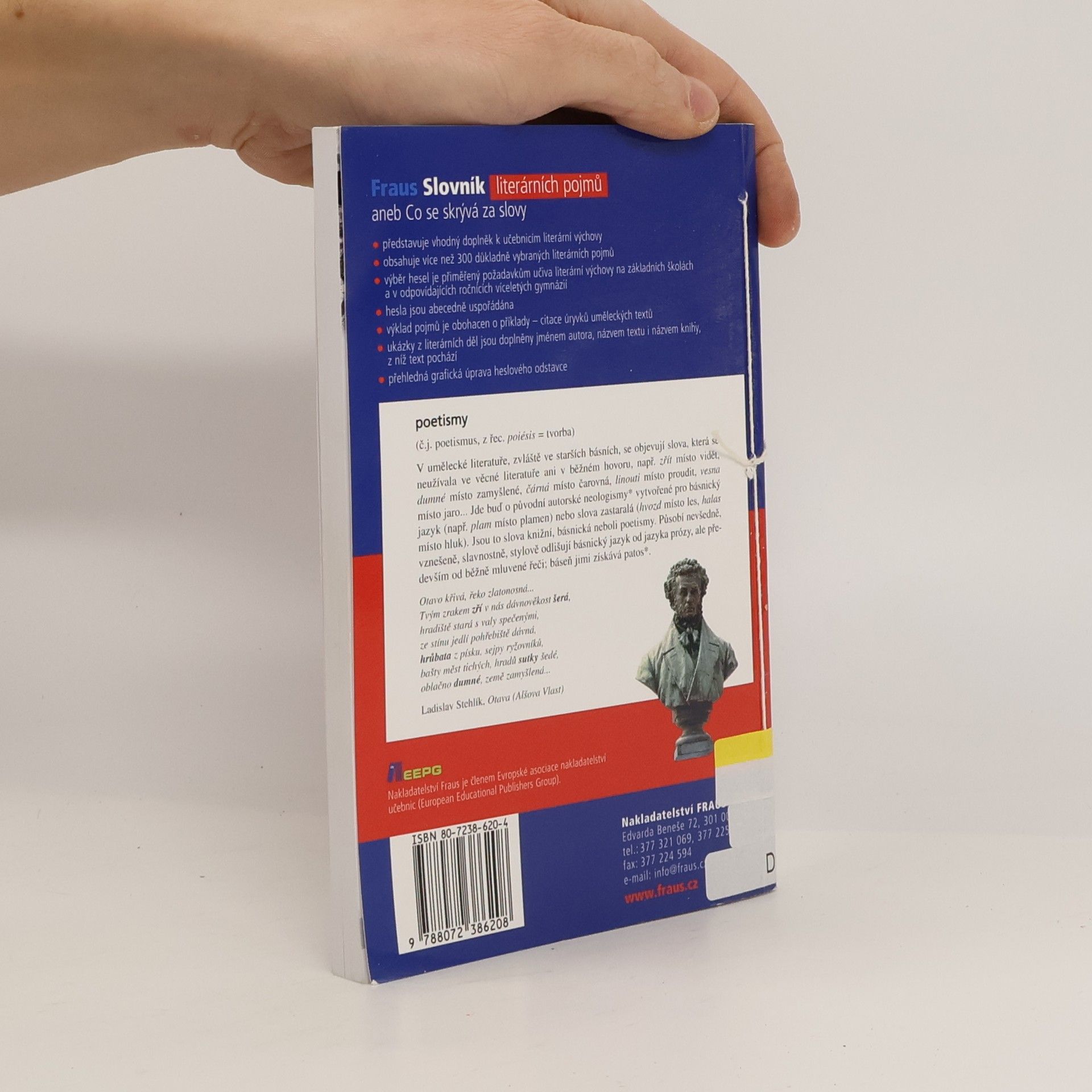 Slovník představuje vhodný doplněk k učebnicím literární výchovy. Obsahuje více než 300 důkladně vybraných literárních pojmů. Výběr hesel je přiměřený požadavkům učiva literární výchovy na základních školách a v odpovídajících ročnících víceletých gymnázií. Hesla jsou abecedně uspořádána. Výklad pojmů je obohacen o příklady - citace úryvků uměleckých textů. Ukázky z literárních děl jsou doplněny jménem autora, názvem textu i názvem knihy, z níž text pochází. Přehledná grafická úprava heslového odstavce.