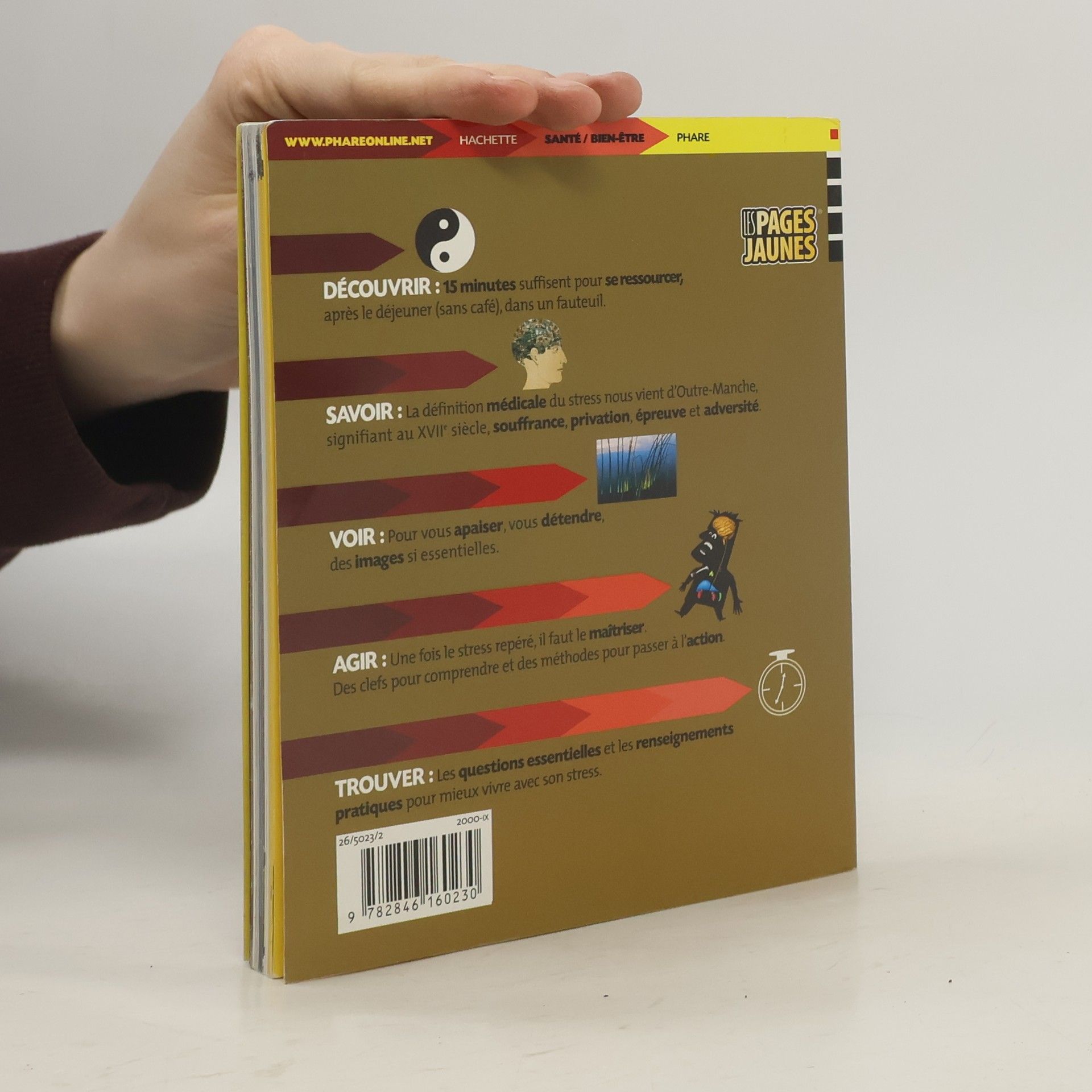 DECOUVRIR : 15 minutes suffisent pour se ressourcer, après le déjeuner (sans café), dans un fauteuil. SAVOIR : la définition médicale du stress vient d'Outre-Manche, signifiant au XVIIe siècle, souffrance, privation, épreuve et adversité. VOIR : pour vous apaiser, vous détendre, des images si essentielles. AGIR : une fois le stress repéré, il faut le maîtriser. Des clefs pour comprendre et des méthodes pour passer à l'action. TROUVER : les questions essentielles et les renseignements pratiques pour mieux vivre avec son stress.