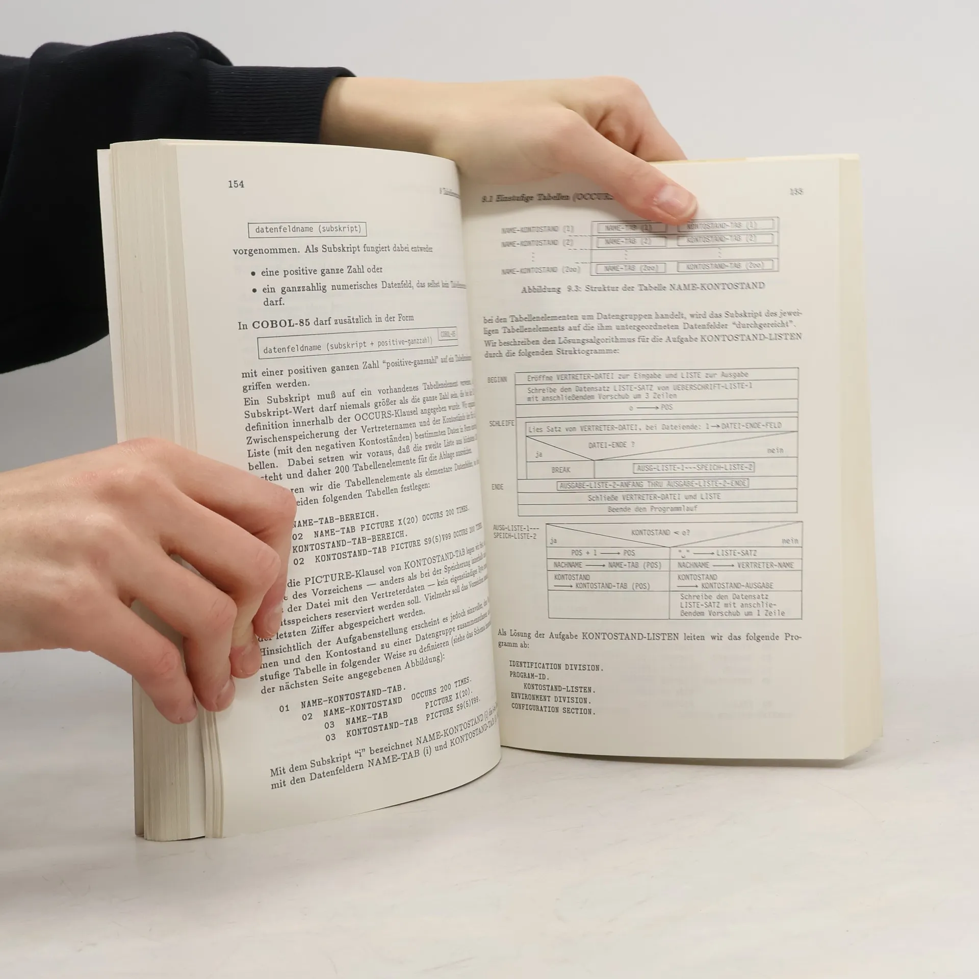 Inhaltsverzeichnis 1 Einführung. 2 Vereinbarung der Datensatz-Struktur. 2.1 Datenerfassung. 2.2 Vereinbarung von Datenfeldern (PICTURE-Klausel). 2.3 Vereinbarung von Datensätzen. 3 Programmaufbau und Programmablauf. 3.1 Datei-Beschreibung. 3.2 Beschreibung der Verarbeitung. 3.3 Identification Division, Environment Division und Data Division. 3.4 Vorbereitungen zur Programmausführung. 3.5 Kompilierung und Programmausführung. 3.6 Veränderung der Problemlösung. 4 Syntax und Einteilung von COBOL-Anweisungen. 5 Datentransport und Wertzuweisung. 5.1 Die MOVE-Anweisung. 5.2 Initialisieren von Datenfeldern. 6 Einfache Ein-/ Ausgabe. 6.1 Eröffnen und Schließen von Dateien. 6.2 Ein- und Ausgabe von Datensätzen (READ, WRITE). 6.3 Druckausgabe. 6.4 Logische Druckseiten. 6.5 Druckaufbereitung. 6.6 Dialogführung am Bildschirmarbeitsplatz. 7 Einfache Steueranweisungen. 7.1 Die PERFORM-Anweisung. 7.2 Die IF-Anweisung. 7.3 Die GO-Anweisung. 7.4 Die STOP-Anweisung. 7.5 Die EXIT-Anweisung. 8 Arithmetische Operationen. 8.1 ADD-, SUBTRACT-, MULTIPLY- und DIVIDE-Anweisung. 8.2 Die COMPUTE-Anweisung. 8.3 Die SIZE ERROR-Klausel. 8.4 Interne Daten-Darstellung (USAGE-Klausel). 9 Tabellenverarbeitung. 9.1 Einstufige Tabellen (OCCURS-Klausel). 9.2 Vorbesetzung von Tabellenelementen (REDEFINES-Klausel