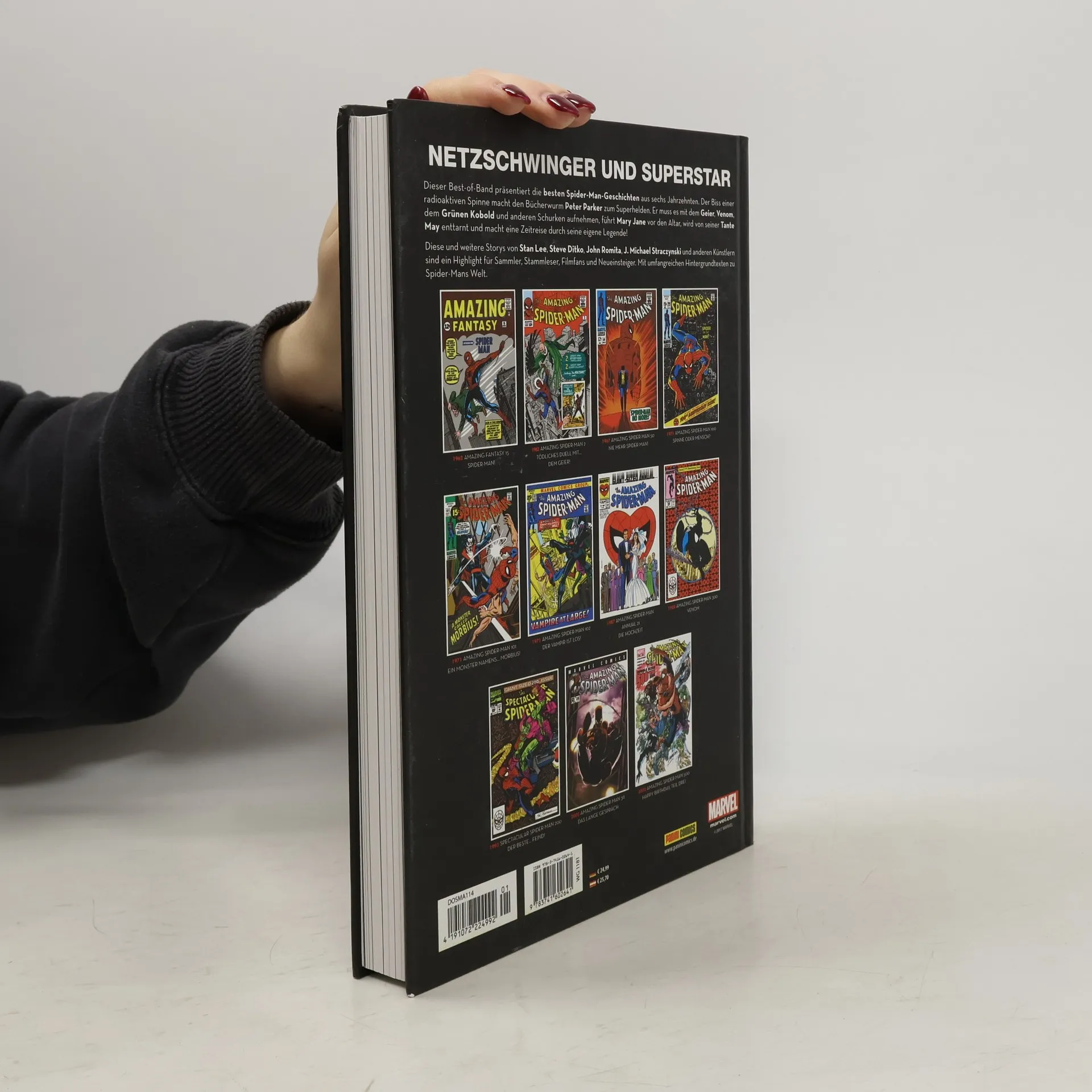 NETZSCHWINGER UND SUPERSTAR Dieser Best-of-Band präsentiert die besten Spider-Man-Geschichten aus sechs Jahrzehnten. Der Biss einer radioaktiven Spinne macht den Bücherwurm Peter Parker zum Superhelden, der es mit dem Geier, Venom, dem Grünen Kobold und anderen aufnimmt, Mary Jane vor den Altar führt, von seiner Tante May enttarnt wird und eine Zeitreise durch seine eigene Legende macht! Diese und weitere Storys von Stan Lee, Steve Ditko, John Romita, J. Michael Straczynski und anderen sind ein Highlight für Sammler, Stammleser, Filmfans und Neueinsteiger. Mit umfangreichen Hintergrundtexten zu Spider-Mans Welt. In über einem halben Jahrhundert kamen jede Menge bedeutende Geschichten mit Marvels netzschwingendem Aushängeschild und Fanliebling zusammen. Diese exklusive Best-of-Anthologie im Hardcover wirft einen Blick auf Spider-Mans monumentale Comic-Historie und zeichnet die wichtigsten Stationen mit einigen der größten Spidey-Abenteuer aller Zeiten und zahlreichen Sachartikeln nach.