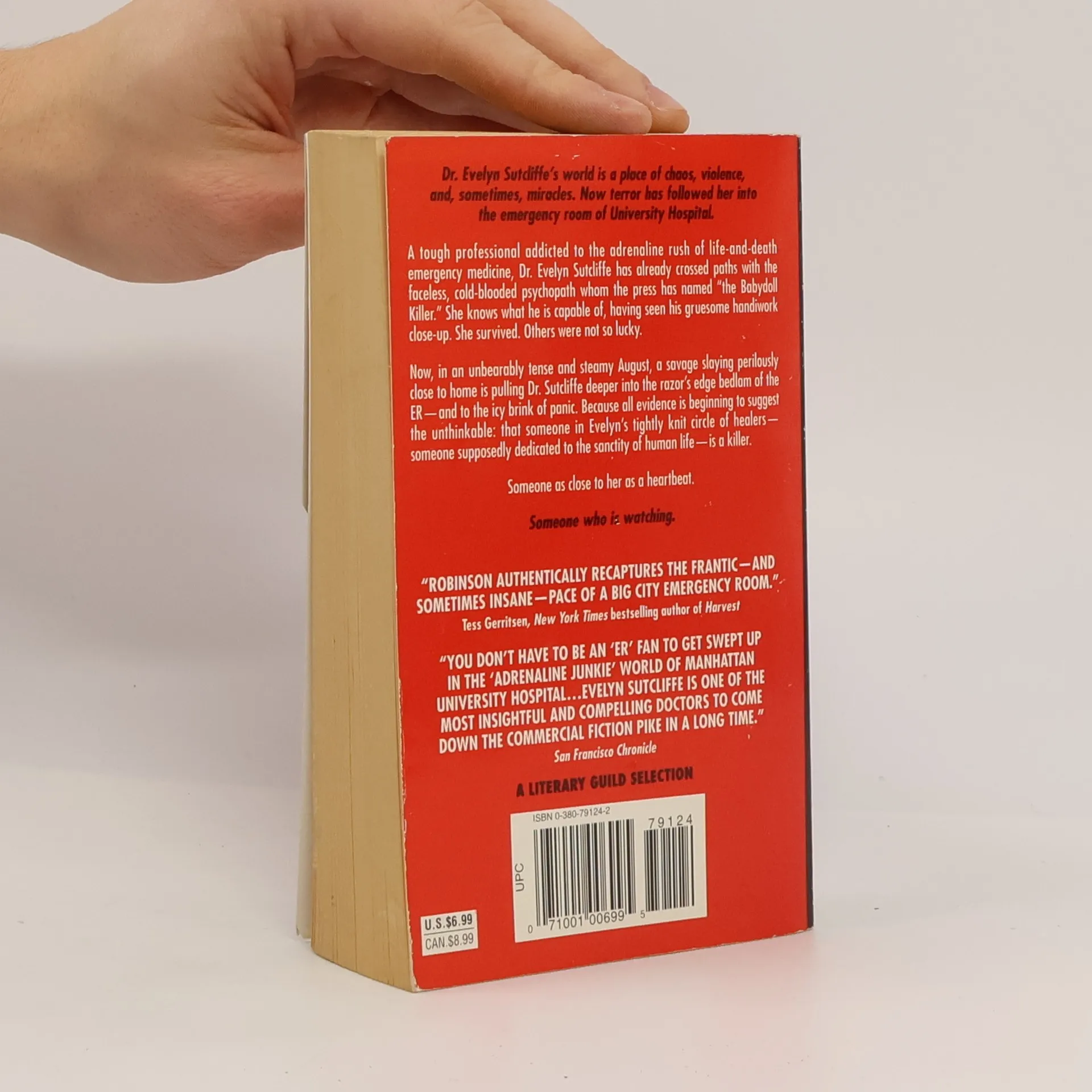 Dr. Evelyn Sutcliffe's world is a place chaos, violence, and, sometimes, miracles. Now terror has followed her into the emergency room of University Hospital. A tough professional addicted to the adrenaline rush of life-and-death emergency medicine, Dr. Evelyn Sutcliffe has already crossed paths with the faceless, cold-blooded psychopath whom the press has named "the Babydoll Killer." She knows what he is capable of, having seen his gruesome handiwork close-up. She survived. Others were not so lucky. Now, in an unbearably tense and steamy August, a savage slaying perilously close to home is pulling Dr. Sutcliffe deeper into the razor's edge bedlam of the ER -- and to the icy brink of panic. Because all evidence is beginning to suggest the that someone in Evelyn's tightly knit circle of healers -- someone supposedly dedicated to the sanctity of human life -- is a killer. Someone as close to her as a heartbeat. Someone who is watching.