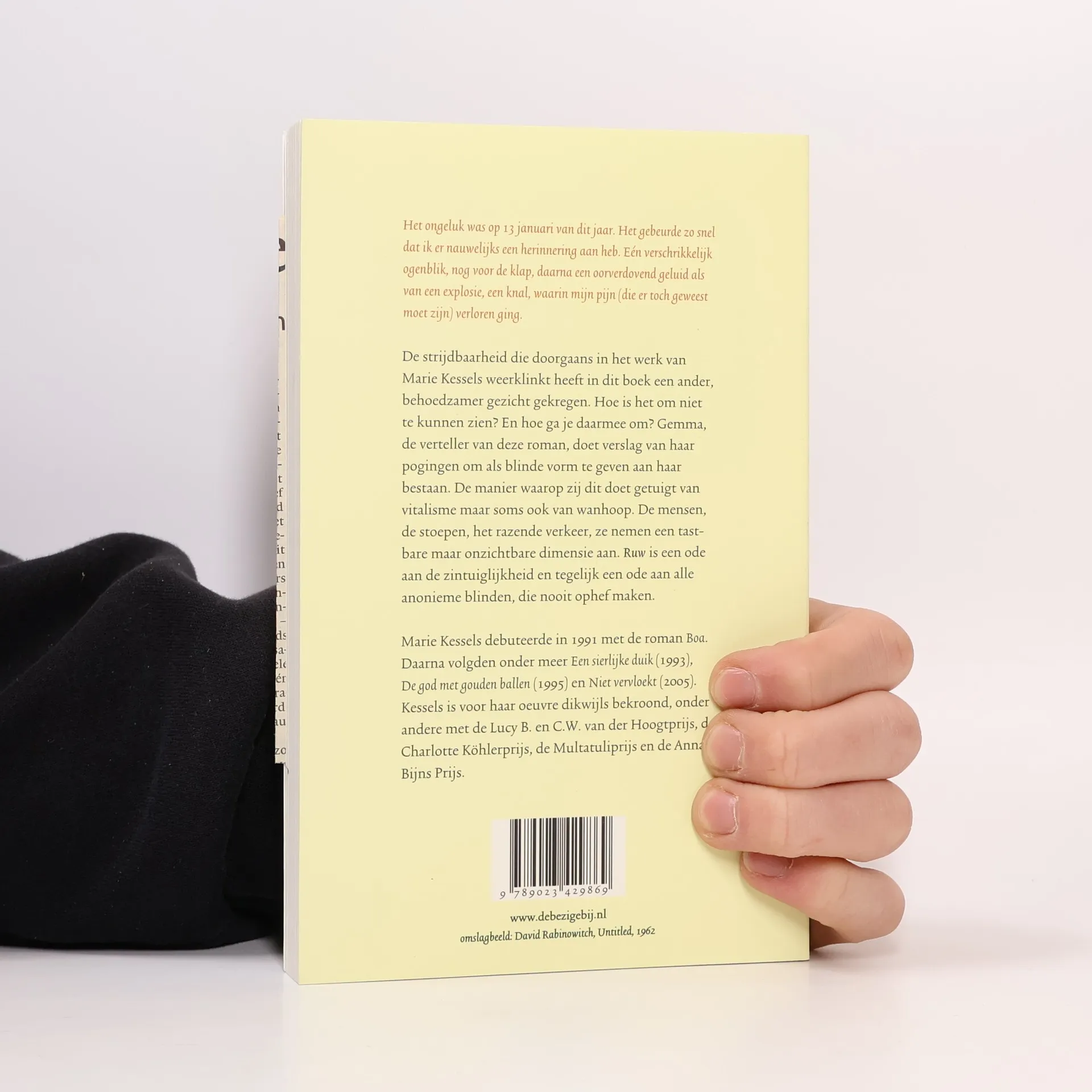 Het ongeluk was op 13 januari van dit jaar. Het gebeurde zo snel dat ik er nauwelijks een herinnering aan heb. Eén verschrikkelijk ogenblik, nog voor de klap, daarna een oorverdovend geluid als van een explosie, een knal, waarin mijn pijn (die er toch geweest moet zijn) verloren ging. De strijdbaarheid die doorgaans in het werk van Marie Kessels weerklinkt heeft in dit boek een ander, behoedzamer gezicht gekregen. Hoe is het om niet te kunnen zien? En hoe ga je daarmee om? Gemma, de verteller van deze roman, doet verslag van haar pogingen om als blinde vorm te geven aan haar bestaan. De manier waarop zij dit doet getuigt van vitalisme maar soms ook van wanhoop. De mensen, de stoepen, het razende verkeer, ze nemen een tastbare maar onzichtbare dimensie aan. Ruw is een ode aan de zintuiglijkheid en tegelijk een ode aan alle anonieme blinden, die nooit ophef maken.