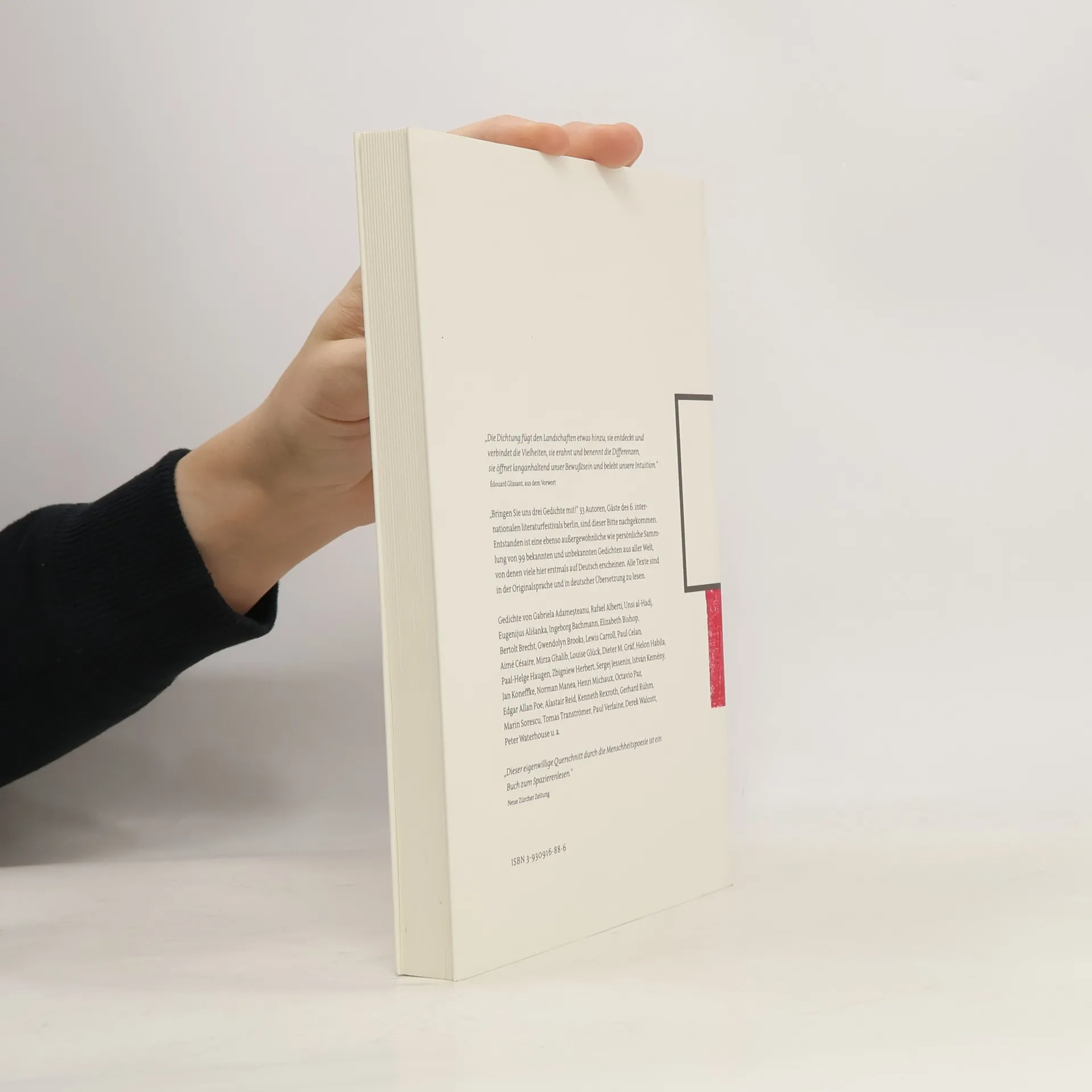'Bringen Sie uns drei Gedichte mit!' 33 Autoren, Gäste des 6. internationalen literaturfestivals berlin, sind dieser Bitte nachgekommen. Entstanden ist eine ebenso außergewöhnliche wie persönliche Sammlung von 99 bekannten und unbekannten Gedichten aus aller Welt, von denen viele hier erstmals deutsch erscheinen. Alle Texte sind in der Originalsprache und in deutscher Übersetzung zu lesen, gestaltet in zweifarbigem, elegantem Schriftbild. Auch wenn der Titel es vermuten läßt: Es handelt sich nicht um eine Anthologie mit Berlin-Gedichten; vielmehr reflektiert das Buch seit sechs Jahren die Vielstimmigkeit eines der größten Literaturfestivals der Welt und ist die bleibende Essenz des Festivals, wenn die Autoren nach zwölf Tagen wieder abgereist sind. In diesem Jahr mit Gedichten von Gabriela Adameşteanu, Rafael Alberti, Unsi al-Hadj, Eugenijus Ališanka, Ingeborg Bachmann, Elizabeth Bishop, Bertolt Brecht, Gwendolyn Brooks, Lewis Carroll, Paul Celan, Aimé Césaire, Mirza Ghalib, Louise Glück, Dieter M. Gräf, Helon Habila, Paal-Helge Haugen, Zbigniew Herbert, Sergej Jessenin, István Kemény, Jan Koneffke, Norman Manea, Henri Michaux, Octavio Paz, Edgar Allan Poe, Alastair Reid, Kenneth Rexroth, Gerhard Rühm, Marin Sorescu, Tomas Tranströmer, Paul Verlaine, Derek Walcott, Peter Waterhouse u. a. Mit einem Vorwort von Édouard Glissant, einem der bedeutendsten Lyriker der französischsprachigen Karibik.
