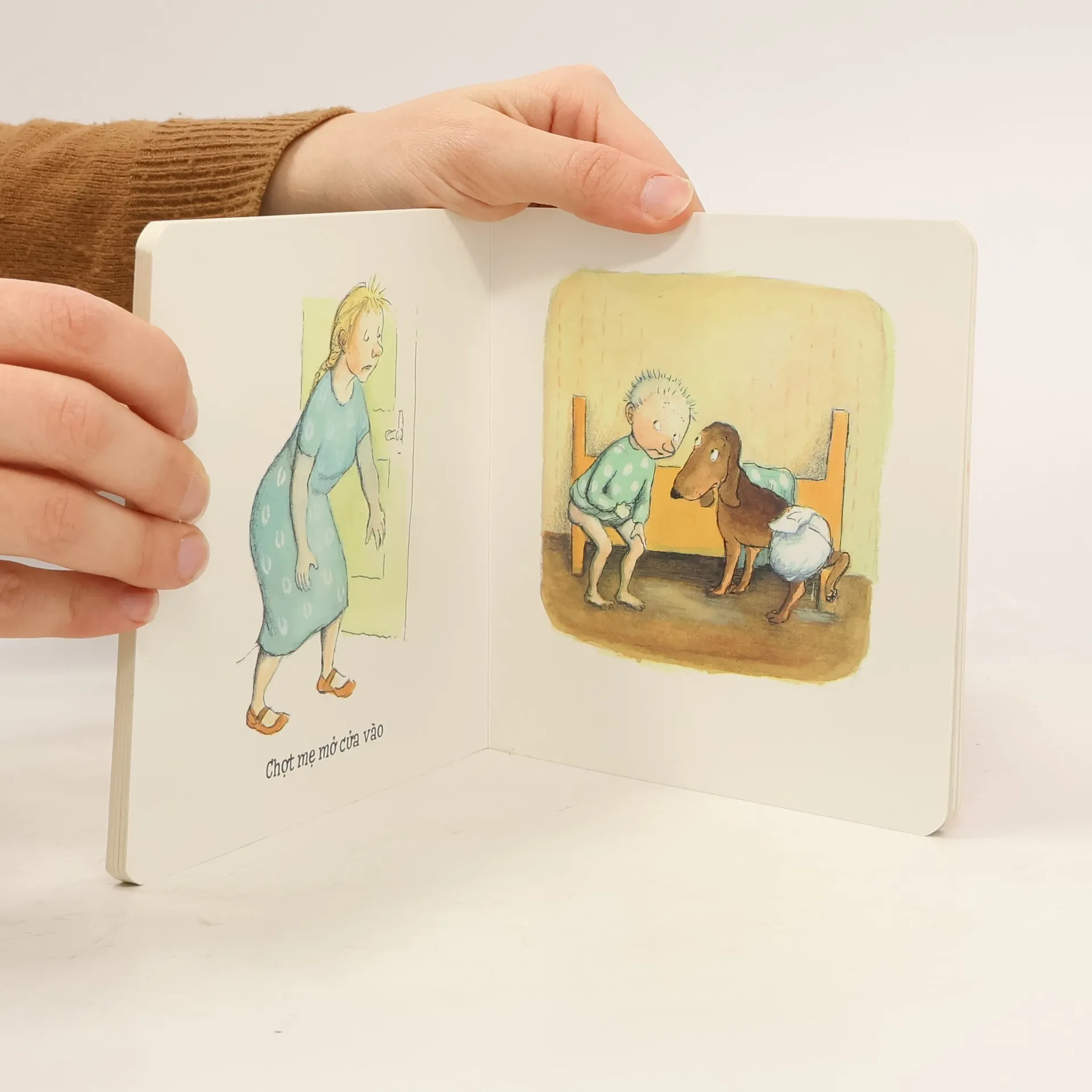 Billedbog med enkel tekst om Max der ikke vil tisse i bleen, men på gulvet. Hunden vil gerne tisse i bleen, men det synes Maxs mor ikke om