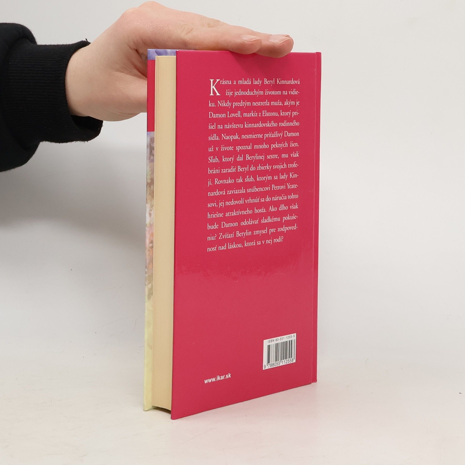 Krásna a mladá lady Beryl Kinnardová žije jednoduchým životom na vidieku. Nikdy predtým nestretla muža, akým je Damon Lovell, markíz z Elstonu, ktorý prišiel na návštevu kinnardovského rodinného sídla. Naopak, nesmierne príťažlivý Damon už v živote spoznal mnoho pekných žien. Sľub, ktorý dal Berylinej sestre, mu však bráni zaradiť Beryl do zbierky svojich trofejí. Rovnako tak sľub, ktorým sa lady Kinnardová zaviazala snúbencovi Petrovi Yeatesovi, jej nedovolí vrhnúť sa do náručia tohto hriešne atraktívneho hosťa. Ako dlho však bude Damon odolávať sladkému pokušeniu? Zvíťazí Berylin zmysel pre zodpovednosť nad láskou, ktorá sa v nej rodí?