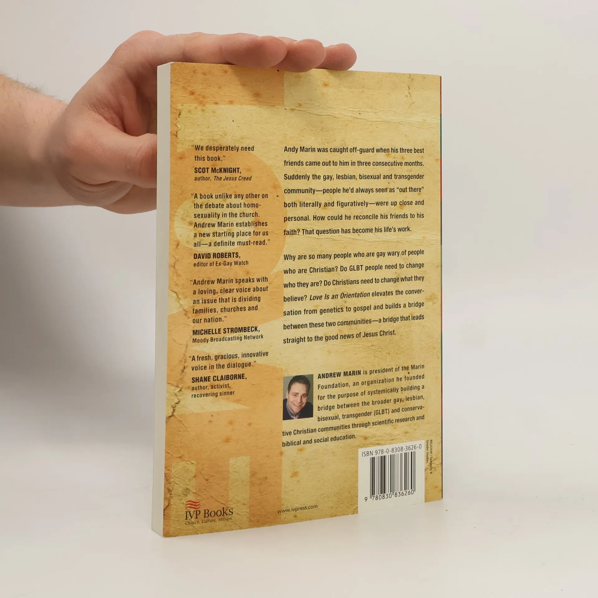 Outreach Magazine Resource of the Year Award winner Golden Canon Leadership Book Award winner Relevant Magazine : Top 20 Best Overall Books winner Englewood Review of Top 20 Best Overall Books winner Christian Manifesto Lime Award winner Andrew Marin's life changed forever when his three best friends came out to him in three consecutive months. Suddenly he was confronted with the gay, lesbian, bisexual and transgender community (GLBT) firsthand. And he was compelled to understand how he could reconcile his friends to his faith. In an attempt to answer that question, he and his wife relocated to Boystown, a predominantly GLBT community in Chicago. And from his experience and wrestling has come his book, Love Is an Orientation, a work which elevates the conversation between Christianity and the GLBT community, moving the focus from genetics to gospel, where it really belongs. Why are so many people who are gay wary of people who are Christians? Do GLBT people need to change who they are? Do Christians need to change what they believe? Love Is an Orientation is changing the conversation about sexuality and spirituality, and building bridges from the GLBT community to the Christian community and, more importantly, to the good news of Jesus Christ.