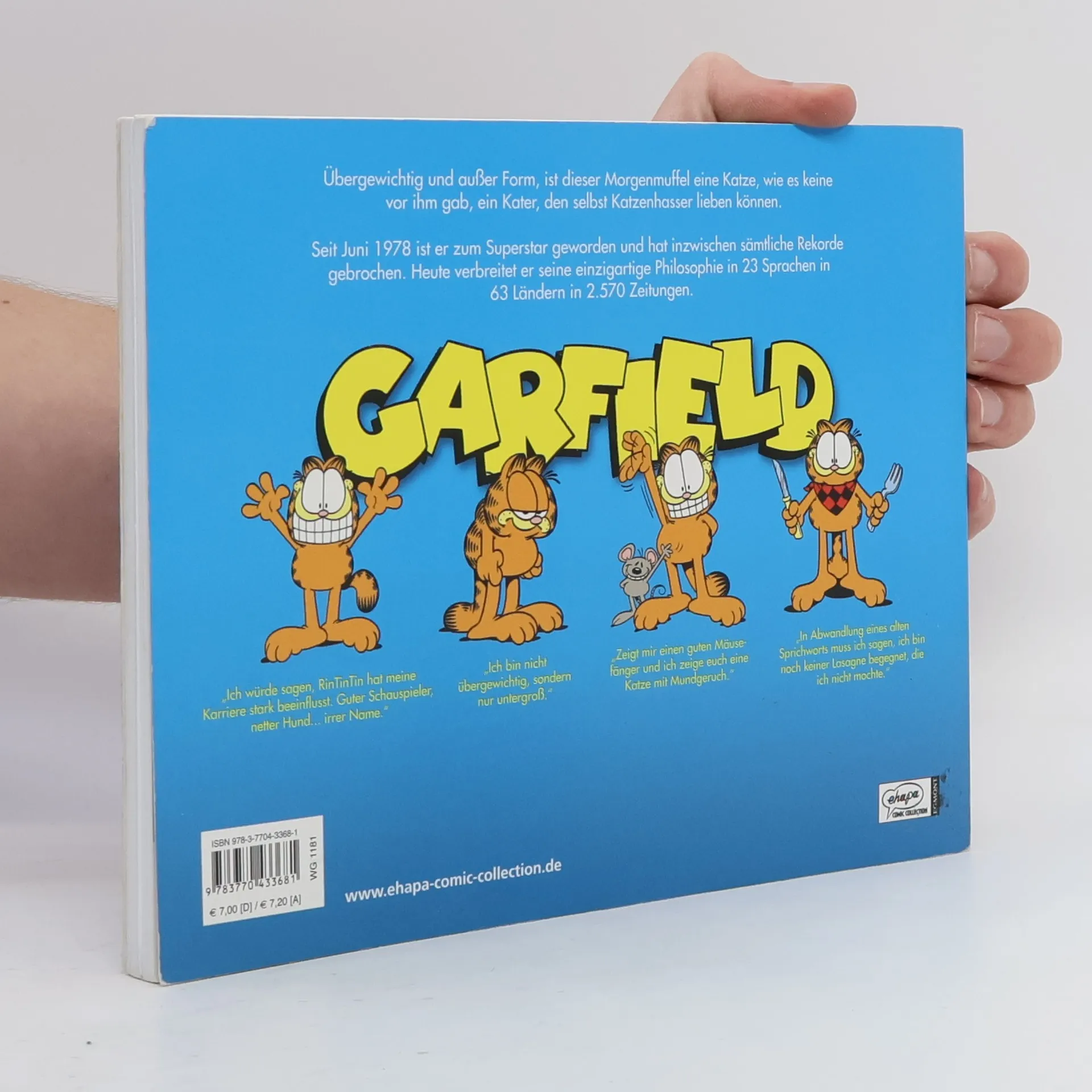 Übergewichtig und außer Form, ist dieser Morgenmuffel eine Katze, wie es keine vor ihm gab, ein Kater, den selbst Katzenhasser lieben können. Seit Juni 1978 ist er zum Superstar geworden und hat inzwischen sämtliche Rekorde gebrochen. Heute verbreitet er seine einzigartige Philosophie in 23 Sprachen in 63 Ländern in 2.570 Zeitungen.