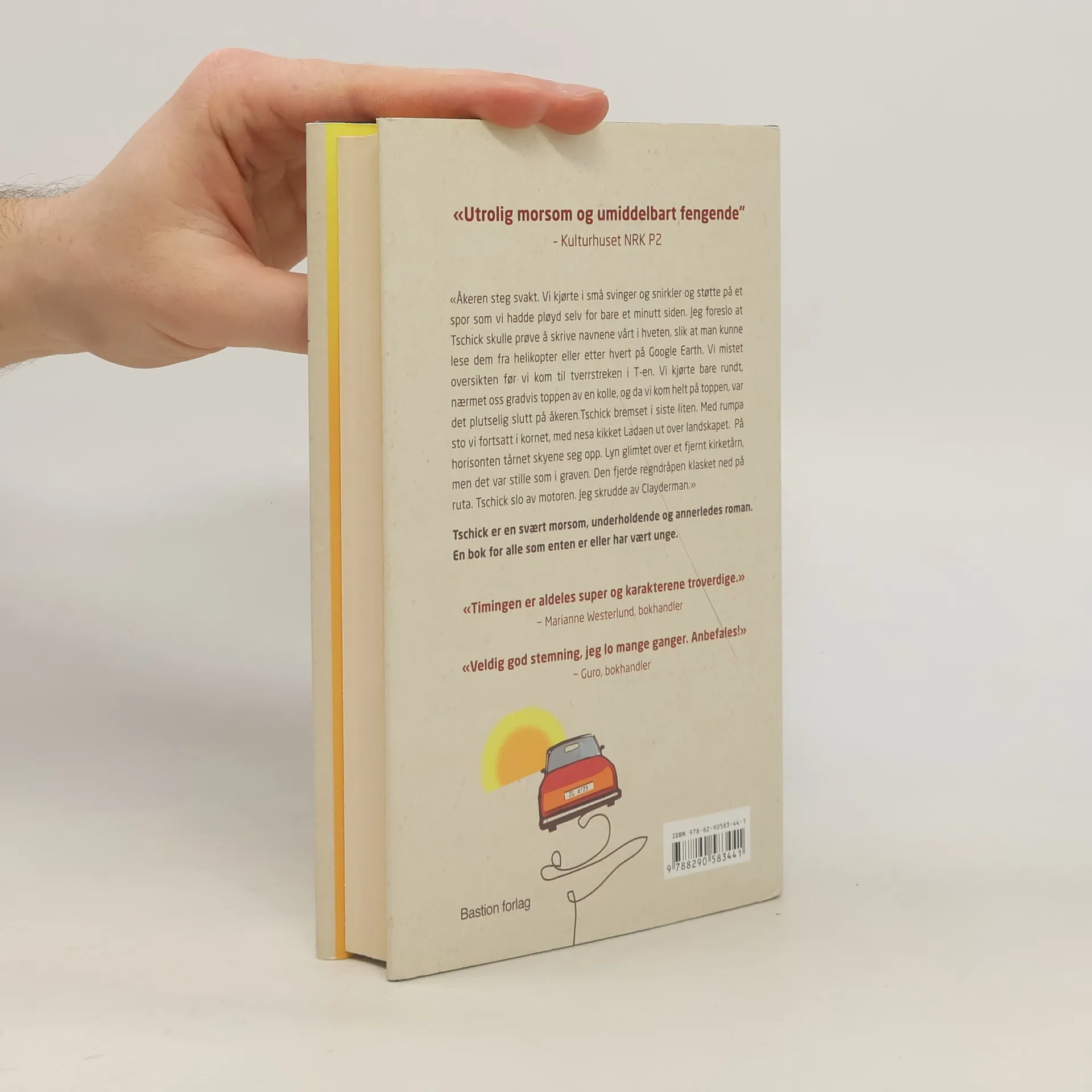 Åkeren steg svakt. Vi kjørte i små svinger og snirkler og støtte på et spor som vi hadde pløyd selv for bare et minutt siden. Jeg foreslo at Tschick skulle prøve å skrive navnene vårt i hveten, slik at man kunne lese dem fra helikopter eller etter hvert på Google Earth. Vi mistet oversikten før vi kom til tverrstreken i T-en. Vi kjørte bare rundt, nærmet oss gradvis toppen av en kolle, og da vi kom helt på toppen, var det plutselig slutt på åkeren. Tschick bremset i siste liten. Med rumpa sto vi fortsatt i kornet, med nesa kikket Ladaen ut over landskapet. På horisonten tårnet skyene seg opp. Lyn glimtet over et fjernt kirketårn, men det var stille som i graven. Den fjerde regndråpen klasket ned på ruta. Tschick slo av motoren. Jeg skrudde av Clayderman.