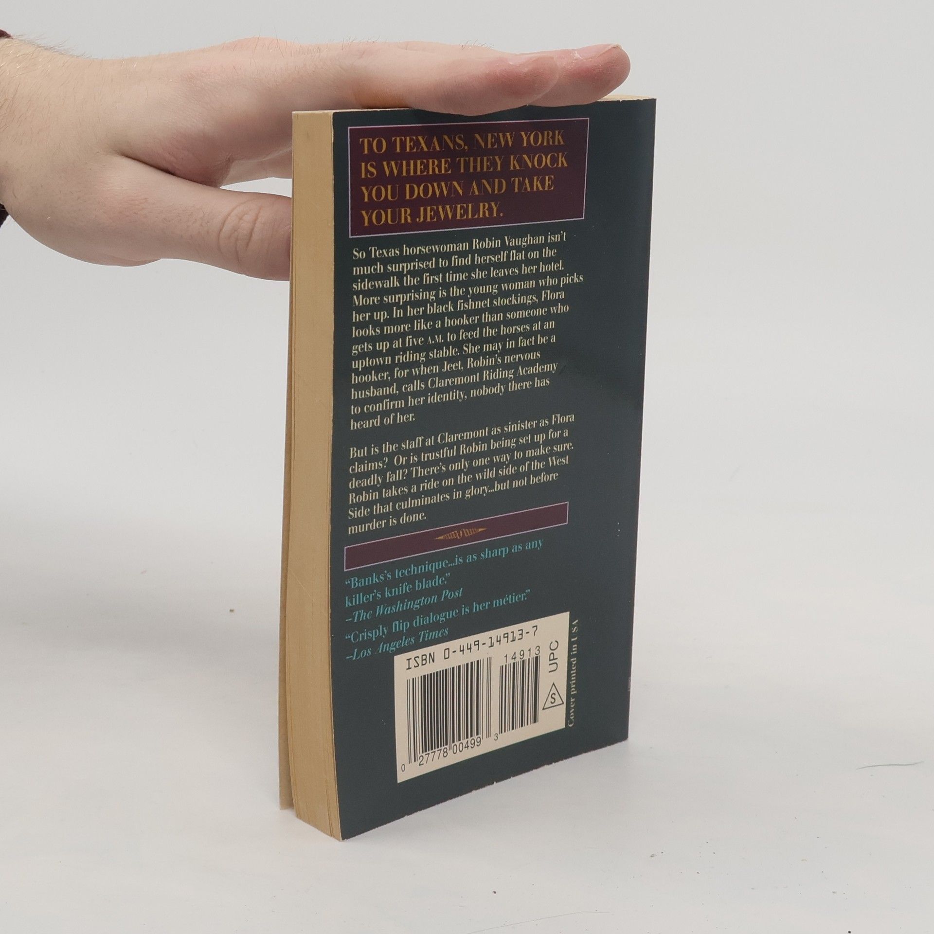 So Texas horsewoman Robin Vaughan isn't much surprised to find herself flat on the sidewalk the first time she leaves her hotel. More surprising is the young woman who picks her up. In her black fishnet stockings, Flora looks more like a hooker than someone who gets up at five A.M. to feed the horses at an uptown riding stable. She may in fact be a hooker, for when Jeet, Robin's nervous husband, calls Claremont Riding Academy to confirm her identity, nobody there has heard of her.But is the staff at Claremont as sinister as Flora claims? Or is trustful Robin being set up for a deadly fall? There's only one way to make sure, Robin takes a ride on the wild side of the West Side that culminates in glory...but not before murder is done.