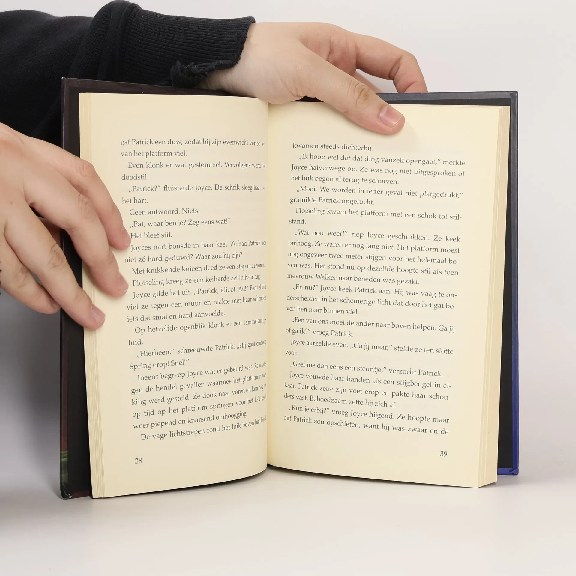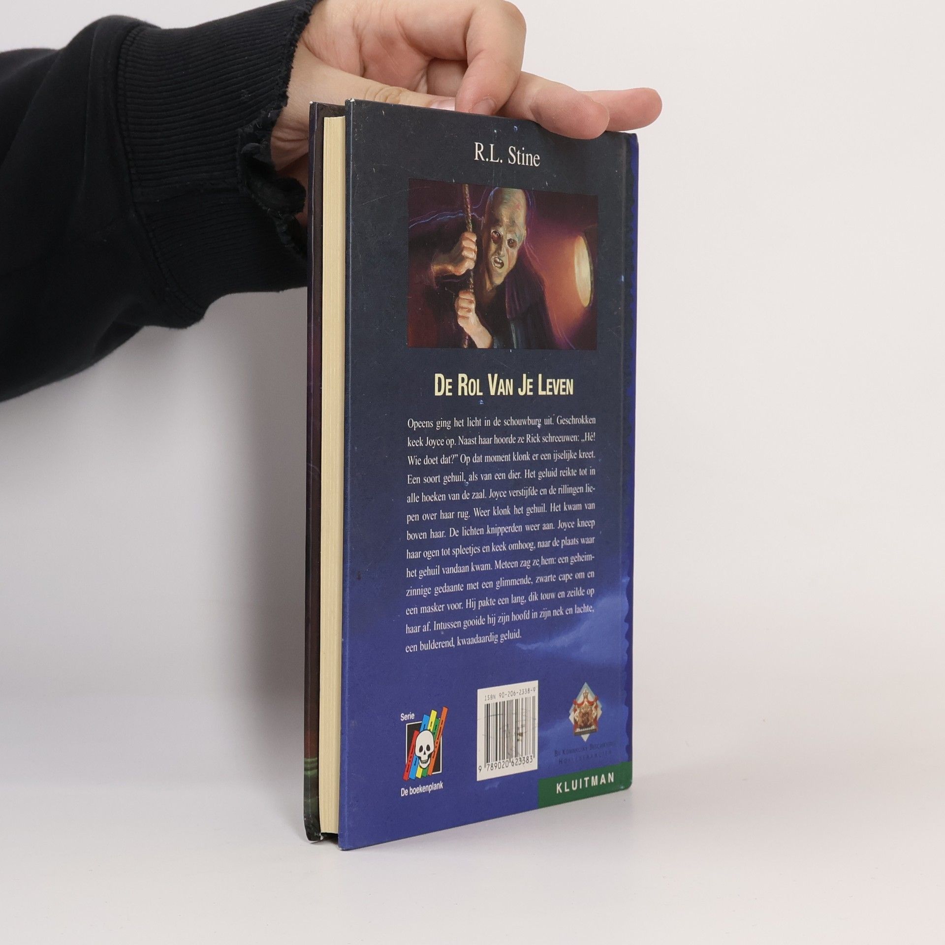 Opeens ging het licht in de schouwburg uit. Geschrokken keek Yoyce op. Naast haar hoorde ze Rick schreeuwen: hè wie doet dat? Op dat moment klonk er een ijselijke kreet. Een soort gehuil, als van een dier. Het geluid reikte tot in alle hoeken van de zaal. Joyce verstijfde en de rillingen liepen over haar rug. Weer klonk het gehuil. Het kwam van boven haar. De lichten knipperden weer aan. Joyce kneep haar ogen tot spleetjes en keek omhoog, naar de plaats waar het gehuil vandaan kwam. Meteen zag ze hem: een geheimzinnige gedaante met een glimmende, zwarte cape om en een masker voor. Hij pakte een lang, dik touw en zeilde op haar af. Intussen gooide hij zijn hoofd in zijn nek en lachte, een bulderend, kwaadaardig geluid.