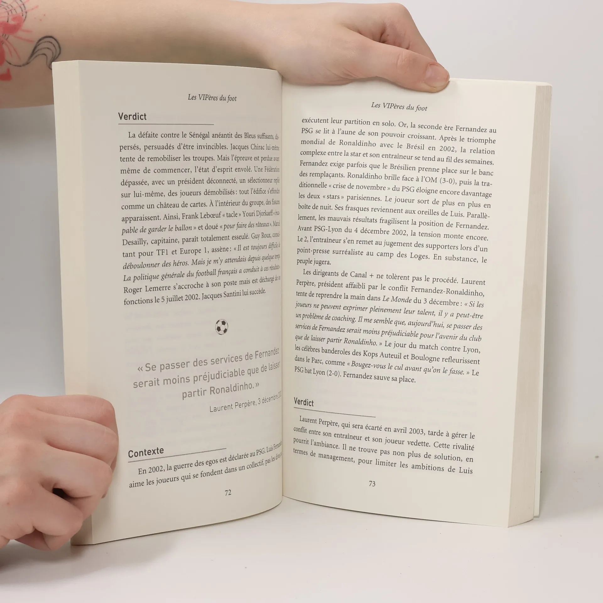 Les footballeurs français jouent autant avec leurs pieds qu'avec... leur langue. Oh, certes, parfois, surtout après les matches, ils manient une redoutable langue de bois pour éviter toute polémique. Mais en d'autres circonstances, soit par stratégie, soit par inadvertance, soit par pure méchanceté, ils assènent des phrases ou des répliques vachardes qui déclenchent de vives polémiques. Celles-ci ne sont pas « off » mais lancées sur des plateaux de télévision, des émissions de radio ou dans des journaux. Elles traduisent les querelles de chapelle, les rivalités, les inimitiés entre joueurs, entraîneurs, présidents, consultants, observateurs. Le grand public entend alors ses « héros » se déchirer, balancer, s'insulter parfois. Dans cet ouvrage, nous regroupons ces phrases VIPérines et les mettons en exergue, tout en rappelant le contexte dans lequel elles ont été prononcées pour les mettre en perspective. Quels intérêts servent-elles ? Ont-elles atteint leur objectif, « servi » à leur auteur et si oui, dans quelle mesure ? À l'exemple de Raymond Domenech qui évoque Zinédine Zidane : « Zizou a sacrifié les chances de l'équipe de France au profit de son orgueil. » Et qui s'adresse à Christophe Dugarry : « Je crois que dans le rôle du méchant donneur de leçons, tu es devenu un virtuose. » Voici les meilleurs tacles du foot français.