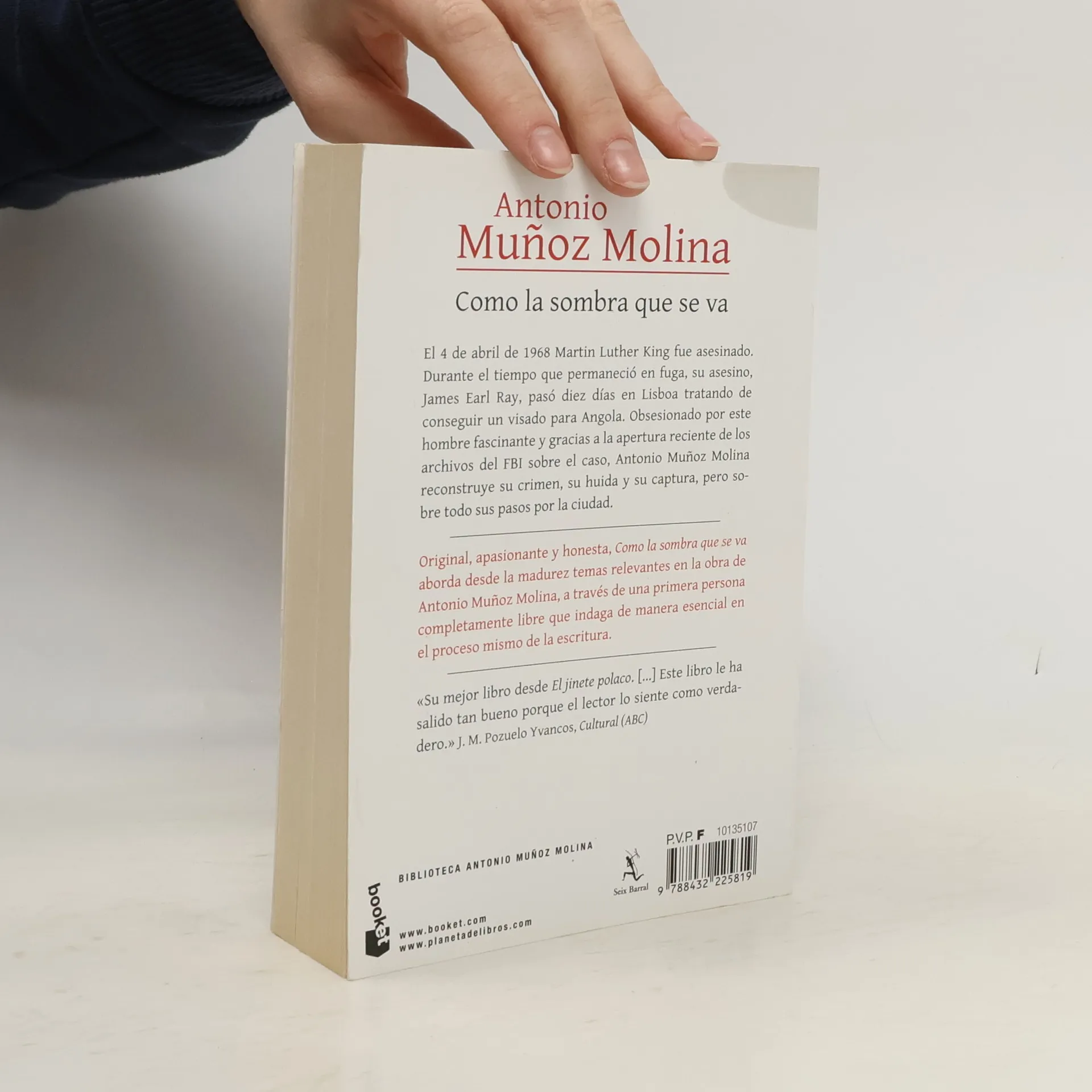 El 4 de abril de 1968 Martin Luther King fue asesinado. Durante el tiempo en que permaneció en fuga, su asesino, James Earl Ray, pasó diez días en Lisboa tratando de conseguir un visado para Angola. Obsesionado por este hombre fascinante y gracias a la apertura reciente de los archivos del FBI sobre el caso, Antonio Muñoz Molina reconstruye su crimen, su huida y su captura, pero sobre todo sus pasos por la ciudad. Lisboa es paisaje y protagonista esencial en esta novela, pues acoge tres viajes que se alternan en la mirada del escritor: el del prófugo Earl Ray en 1968; el de un joven Antonio que en 1987 parte en búsqueda de inspiración para escribir la novela que lo consagró como escritor, El invierno en Lisboa, y el del hombre que escribe esta historia hoy desde la necesidad de descubrir algo esencial sobre estos dos completos desconocidos. Original, apasionante y honesta, Como la sombra que se va aborda desde la madurez temas relevantes en la obra de Antonio Muñoz Molina: la dificultad de recrear fielmente el pasado, la fragilidad del instante, la construcción de la identidad, lo fortuito como motor de la realidad o la vulnerabilidad de los derechos humanos, pero cobran aquí forma a través de una primera persona completamente libre que indaga de forma esencial en el proceso mismo de la escritura.