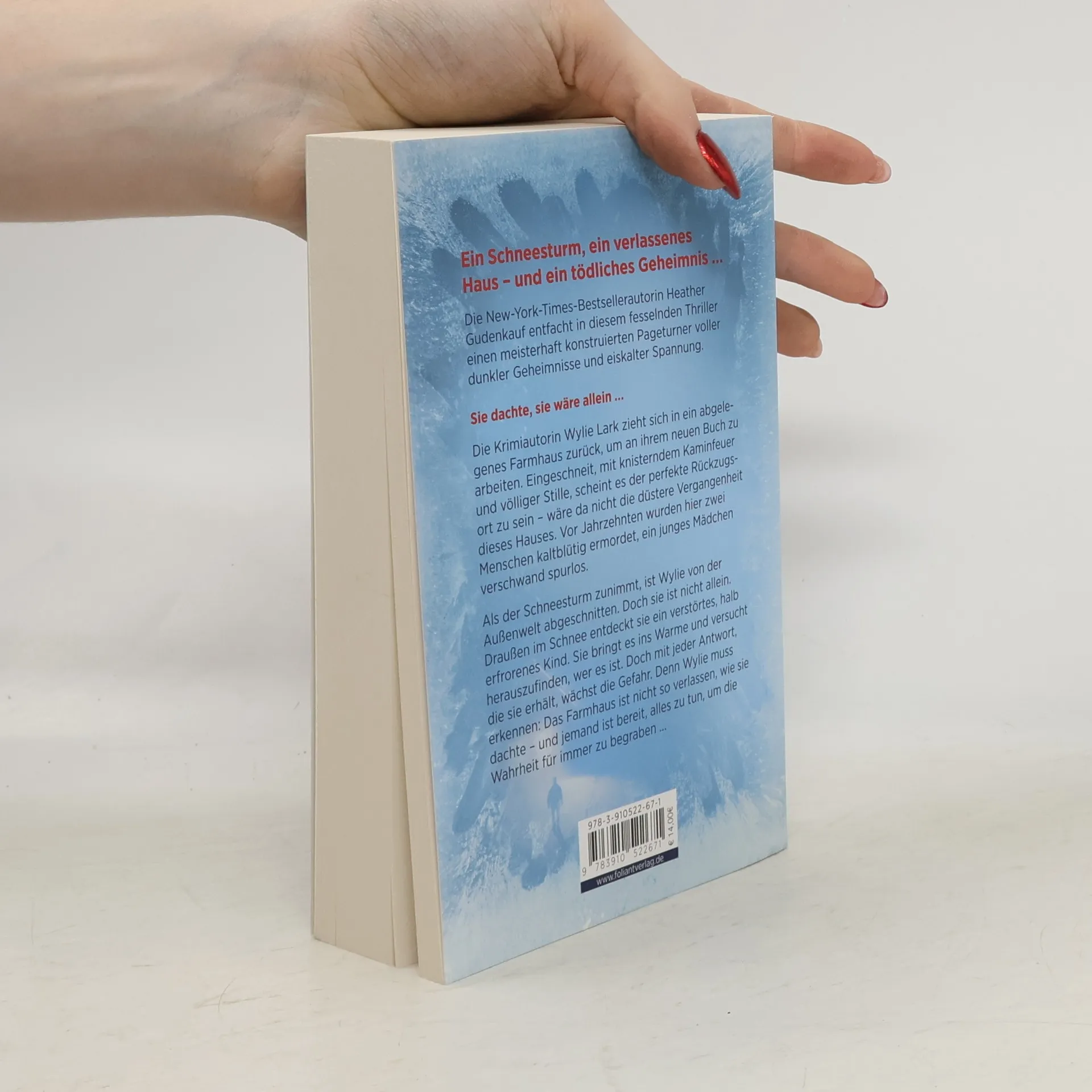 <strong>Ein Schneesturm, ein verlassenes Haus – und ein tödliches Geheimnis …</strong> <strong>Heather Gudenkauf, New York Times-Bestsellerautorin,</strong> entfacht in diesem fesselnden Thriller einen meisterhaft konstruierten Pageturner voller dunkler Geheimnisse und eiskalter Spannung. <strong>Sie dachte, sie wäre allein …</strong> Krimiautorin Wylie Lark hat sich in ein abgelegenes Farmhaus zurückgezogen, um an ihrem neuen Buch zu arbeiten. Eingeschneit, mit einem knisternden Kaminfeuer und völliger Stille, scheint es der perfekte Rückzugsort – wäre da nicht die grausame Vergangenheit dieses Hauses. Vor Jahrzehnten wurden hier zwei Menschen kaltblütig ermordet, ein junges Mädchen verschwand spurlos. Als der Schneesturm immer heftiger wird, ist Wylie von der Außenwelt abgeschnitten. Doch sie ist nicht allein. Draußen im Schnee entdeckt sie ein Kind – verstört, halb erfroren, wortlos. Sie bringt es ins Warme und versucht herauszufinden, wer es ist. Doch mit jeder Antwort, die sie findet, wächst die Gefahr. Denn Wylie muss erkennen: Das Farmhaus ist nicht so verlassen, wie sie dachte – und jemand ist bereit, alles zu tun, um die Wahrheit für immer zu begraben …