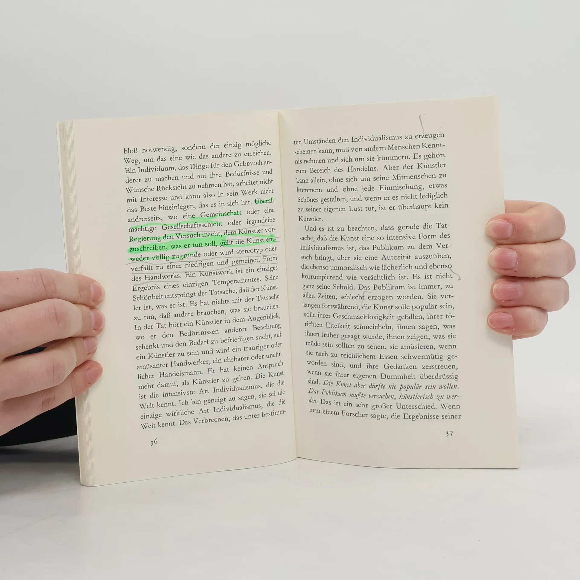 Dieser Essay Wildes ist das ungewöhnliche Plädoyer für einen Sozialismus, der die Beschäftigung mit dem Schönen nicht ausschließen soll. Wildes soziale Utopie entwirft gesellschaftliche Bedingungen, die es jedem erlauben sollen, ein individualistisch geprägtes, ja egoistisches Leben zu führen der Künstler verkörpert dabei den freien Menschen par excellence.