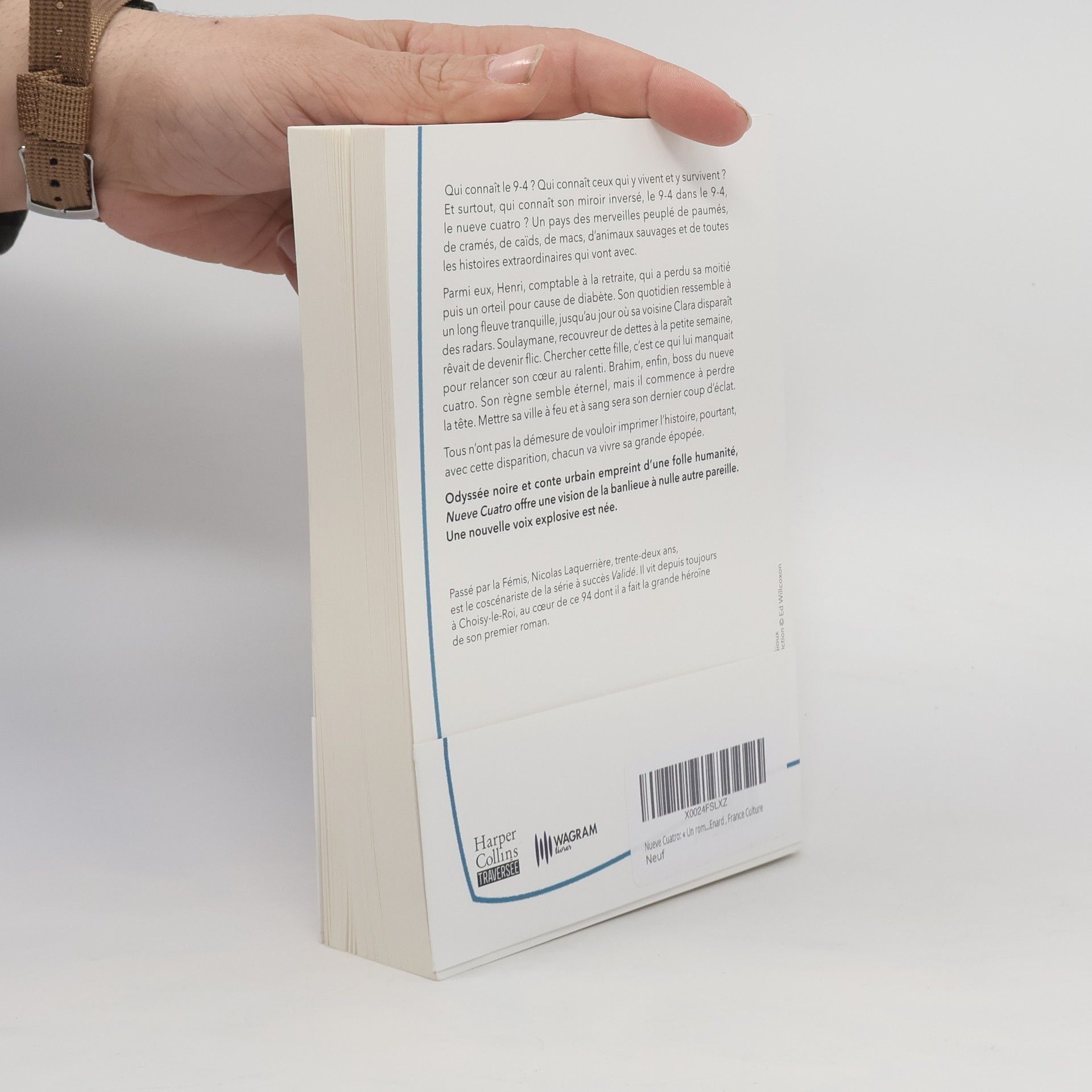 Qui connaît le 9-4 ? Qui connaît ceux qui y vivent et y survivent ? Et surtout, qui connaît son miroir inversé, le 9-4 dans le 9-4, le nueve cuatro ? Un pays des merveilles peuplé de paumés, de cramés, de caïds, de macs, d’animaux sauvages et de toutes les histoires extraordinaires qui vont avec. Parmi eux, Henri, comptable à la retraite, qui a perdu sa moitié puis un orteil pour cause de diabète. Son quotidien ressemble à un long fleuve tranquille, jusqu’au jour où sa voisine Clara disparaît des radars. Soulaymane, recouvreur de dettes à la petite semaine, rêvait de devenir flic. Chercher cette fille, c’est ce qui lui manquait pour relancer son coeur au ralenti. Brahim, enfin, boss du nueve cuatro. Son règne semble éternel, mais il commence à perdre la tête. Mettre sa ville à feu et à sang sera son dernier coup d’éclat.Tous n’ont pas la démesure de vouloir imprimer l’histoire, pourtant, avec cette disparition, chacun va vivre sa grande épopée. Odyssée noire et conte urbain empreint d’une folle humanité, Nueve Cuatro offre une vision de la banlieue à nulle autre pareille. Une nouvelle voix explosive est née.À propos de l'auteurPassé par la Fémis, Nicolas Laquerrière, trente-deux ans, est le coscénariste de la série à succès Validé. Il vit depuis toujours à Choisy-le-Roi, au coeur de ce 94 dont il a fait la grande héroïne de son premier roman.
