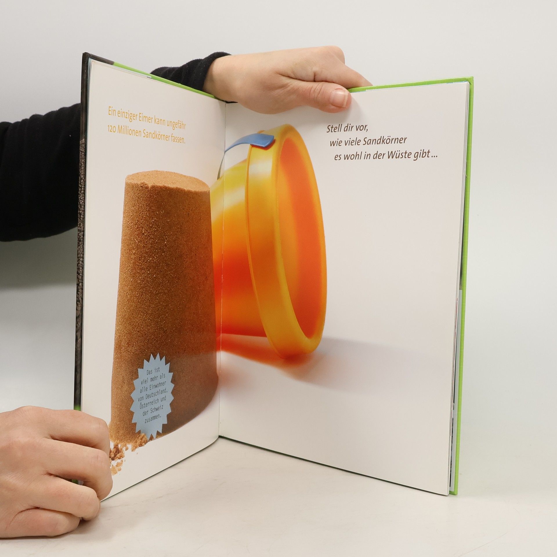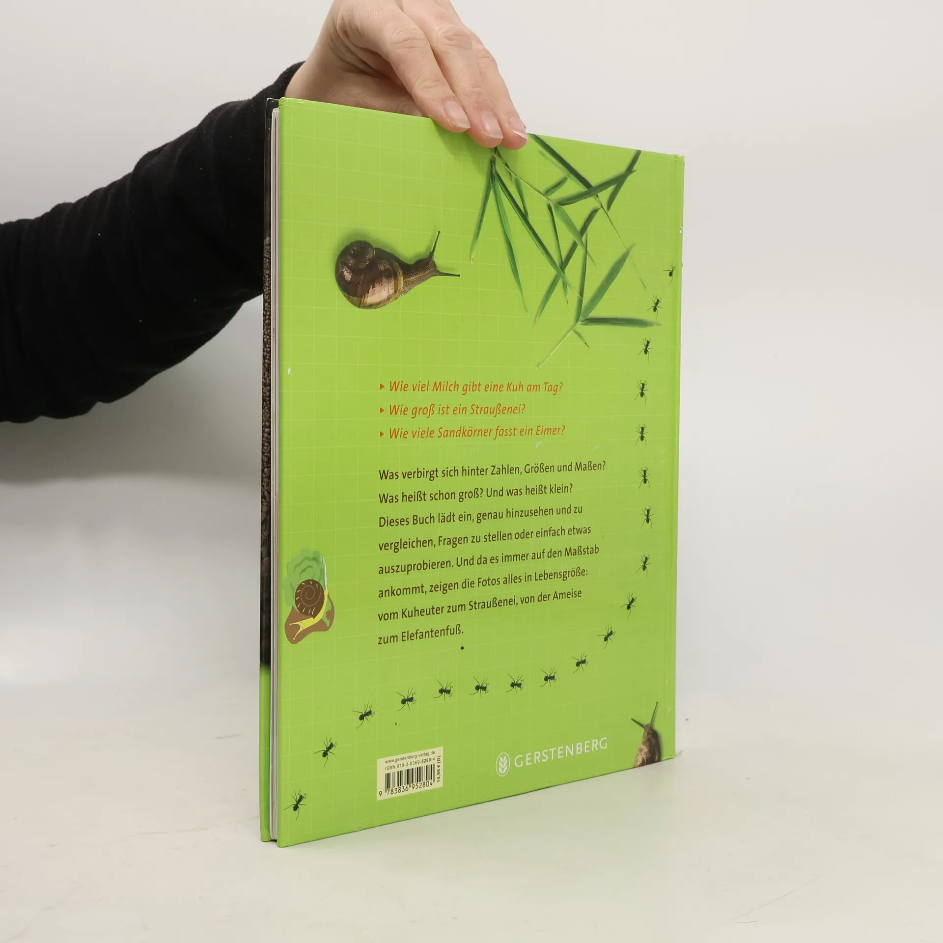 Bilder in Lebensgrösse: Faszinierende Farbfotos in Lebensgrösse und viele wissenswerte Informationen vermittelt dieses geniale Buch, welches die Begriffe von Grössenwahrnehmung, Zahlbegriffe und Masseinheiten sprichwörtlich unter die Lupe nimmt. Du erfährst, wie viele Ameisen es braucht, um eine Torte zu verschlingen oder wie viel Milch eine Kuh am Tag hergibt, wieviel Wasser ein Kamel auf einmal trinken kann, wie viele Maiskolben für eine Portion Popcorn benötigt werden und wie viele Luftballons sich im Laufe eines Menschenlebens durch die Atmung füllen lassen. Und, was bedeutet überhaupt klein und gross? Neugierig geworden? Dann wird es höchste Zeit, diesen imposanten Band zur Hand zu nehmen. Die speziell angefertigten Fotos sind explizit für dieses aussergewöhnliche Buch ausgewählt worden. Vom kleinen Mäuschen über die winzigen Ameisen und der hungrigen Bernhardinerschnauze bis zum klobigen Elefantenfuss können wir Bilder in Originalgrösse betrachten und bestaunen. Selbstverständlich werden die lebensnahen Bilder durch viele lehrreiche Erklärungen ergänzt, die gut verständlich und kindgerecht beschrieben werden. Ab 6 Jahren, *****, Silvia Zanetti.
