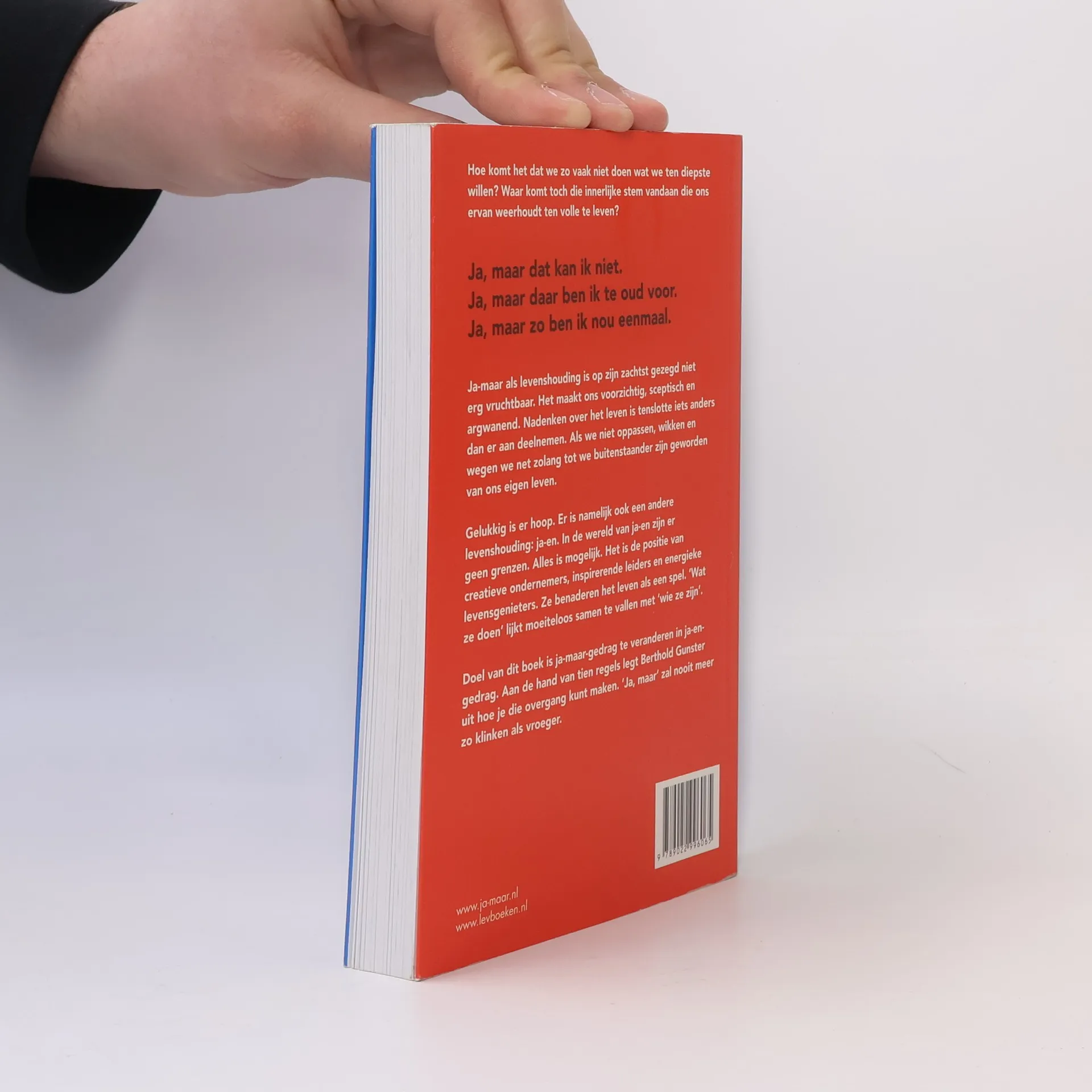 Hoe komt het dat we zo vaak niet doen wat we ten diepste willen? Waar komt toch die innerlijke stem vandaan die ons ervan weerhoudt ten volle te leven?Ja, maar dat kan ik niet.Ja, maar daar ben ik te oud voor.Ja, maar zo ben ik nou eenmaal.Ja-maar als levenshouding is op zijn zachtst gezegd niet erg vruchtbaar. Het maakt ons voorzichtig, sceptisch en argwanend. Nadenken over het leven is tenslotte iets anders dan er aan deelnemen. Als we niet oppassen, wikken en wegen we net zolang tot we buitenstaander zijn geworden van ons eigen leven.Gelukkig is er hoop. Er is namelijk ook een andere levenshouding: ja-en. In de wereld van ja-en zijn er geen grenzen. Alles is mogelijk. Het is de positie van creatieve ondernemers, inspirerende leiders en energieke levensgenieters. Ze benaderen het leven als een spel. ‘Wat ze doen’ lijkt moeiteloos samen te vallen met ‘wie ze zijn’.Doel van dit boek is ja-maar-gedrag te veranderen in ja-en-gedrag. Aan de hand van tien regels legt Berthold Gunster uit hoe je die overgang kunt maken. ‘Ja, maar’ zal nooit meer zo klinken als vroeger.
