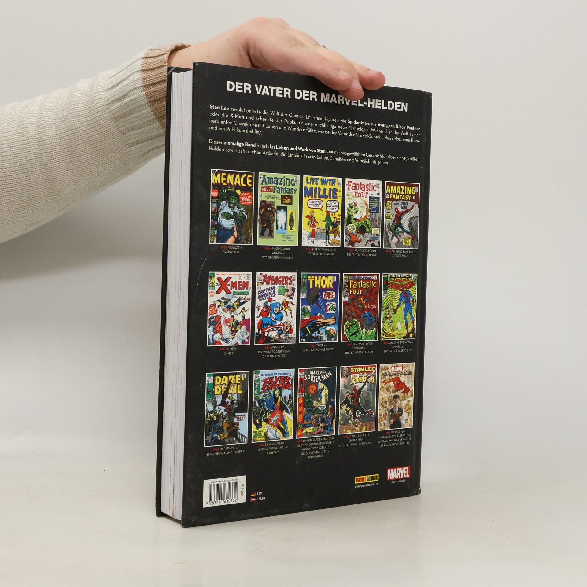 DER VATER DER MARVEL-HELDEN Stan Lee revolutionierte die Welt der Comics. Er erfand Figuren wie Spider-Man, die Avengers, Black Panther oder die X-Men und schenkte der Popkultur eine reichhaltige neue Mythologie. Während er die Welt seiner berühmten Charaktere mit Leben und Wundern füllte, wurde der Vater der Marvel-Superhelden selbst eine Ikone und ein Publikumsliebling. Dieser einmalige Band feiert das Leben und Werk von Stan Lee mit ausgewählten Geschichten über seine größten Helden sowie zahlreichen Artikeln, die Einblick in sein Leben, Schaffen und Vermächtnis geben. - 1953 MENACE 3 WERWOLF! - 1962 AMAZING ADULT FANTASY 11 WO GEISTER WANDELN - 1961 LIFE WITH MILLIE 10 TYPISCH TEENAGER! - 1961 FANTASTIC FOUR 1 DIE FANTASTISCHEN VIER! - 1962 AMAZING FANTASY 15 SPIDER-MAN! - 1963 X-MEN 1 X-MEN - 1964 AVENGERS 4 DIE WIEDERGEBURT DES... CAPTAIN AMERICA - 1967 THOR 141 DER ZORN VON REPLICUS - 1968 FANTASTIC FOUR ANNUAL 6 UND ES WERDE... LEBEN! - 1968 AMAZING SPIDER-MAN ANNUAL 5 DAS IST DER JACKP(L)OT! - 1968 DAREDEVIL 47 NIMM MEINE HAND, BRUDER! - 1969 SILVER SURFER 5 ... UND WER WIRD UM IHN TRAUERN? - 1971 AMAZING SPIDER-MAN 96-98 ER IST WIEDER DA! DER KOBOLD! IM GRIFF VOM KOBOLD! DES SCHURKEN LETZTER SCHNAUFER! - 2006 STAN LEE MEETS SPIDER-MAN 1 STAN LEE TRIFFT SPIDER-MAN - 2014 MARVEL 75th ANNIVERSARY CELEBRATION CAPTAIN AMERICA VEREITELT DIE RACHE DES VERRÄTERS