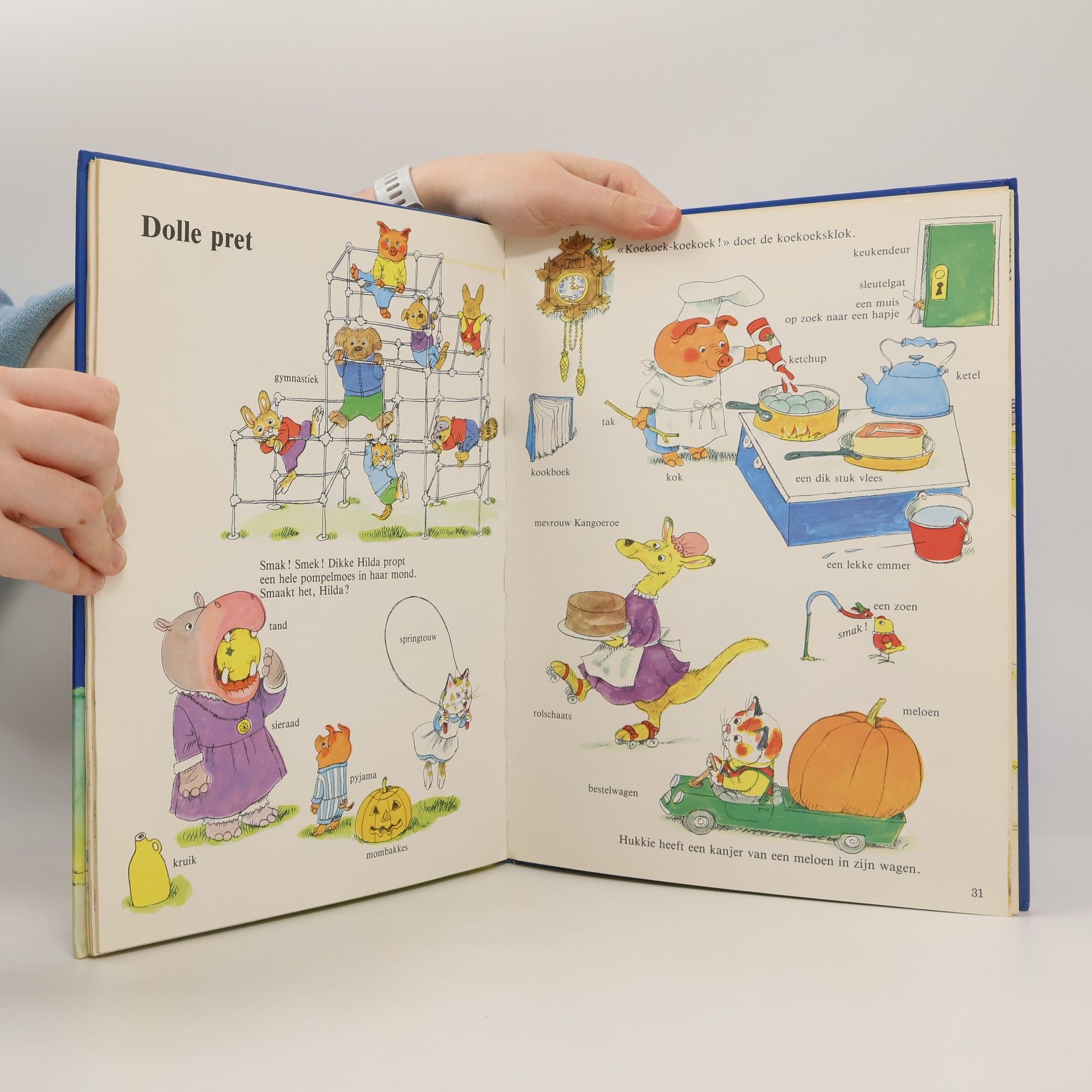 Prentenboek met veel gedetailleerde, vrolijk gekleurde tekeningen, waarbij woorden of korte zinnen staan. Vanaf ca. 3 jaar.