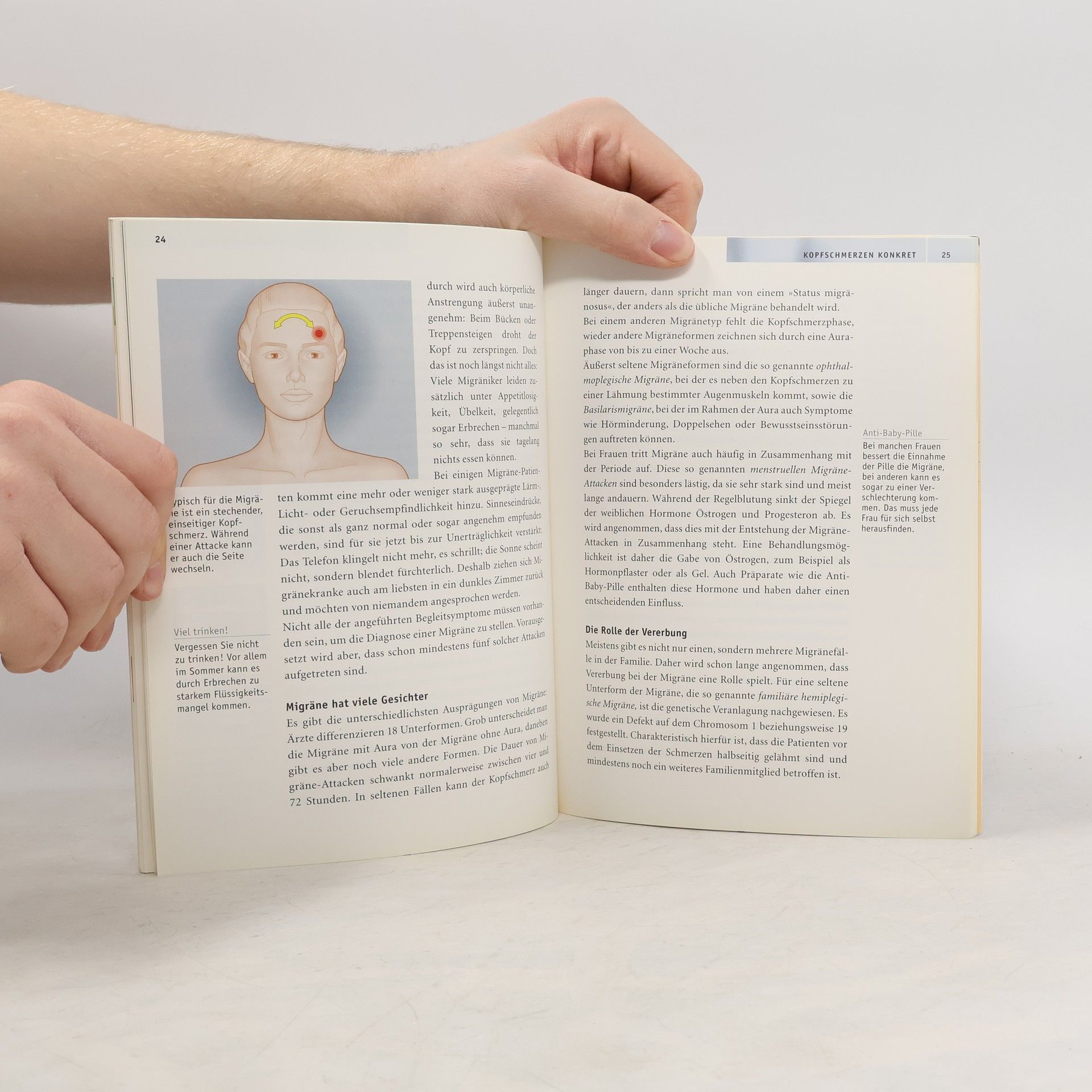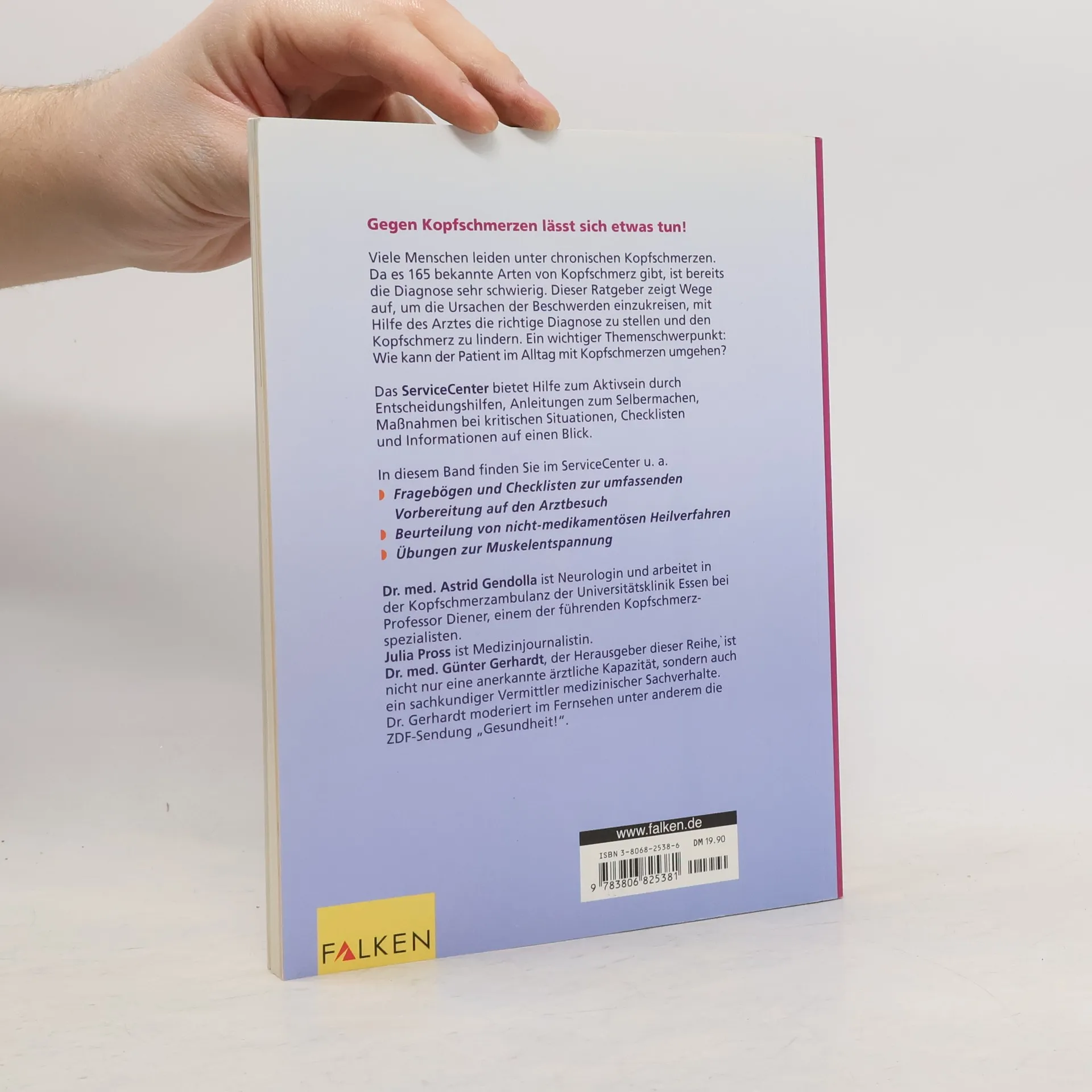 Das Falken-Sublabel 'Gesundheit aktiv' wird vom Leiter der ZDF-Serie 'Gesundheit!', H. Gerhardt, herausgegeben. Ähnlich gestaltet wie die Ratgeber von TRIAS oder Midena mit ansprechendem, übersichtlichen Layout, erläuternden Abbildungen, guter Gliederung und patientennaher Diktion steht dieser Kopfschmerz-Band somit in einem bereits stark gesättigten verlegerischen Umfeld. Was dieses Buch besonders qualifiziert, ist die Institution des umfangreichen, patientenaktivierenden 'ServiceCenters' im Anhang: mit Fragebögen und Checklisten zur Vorbereitung auf den Arztbesuch; zu den nicht-medikamentösen Behandlungen; zu Selbsthilfe-Maßnahmen; inkl. Adressen, Glossar und Register. Auf die entsprechenden Teile des 'ServiceCenter' wird im Hauptteil mit seinen Kapiteln zur Einschätzung des individuellen Kopfschmerzes, zu dessen wichtigsten Formen und ihrer Behandlung sowie zum Leben mit der Krankheit ständig verwiesen. - Seriös, anwendungsnah, auf sanfte Medizin setzend, selbstaktivierend. (1).
