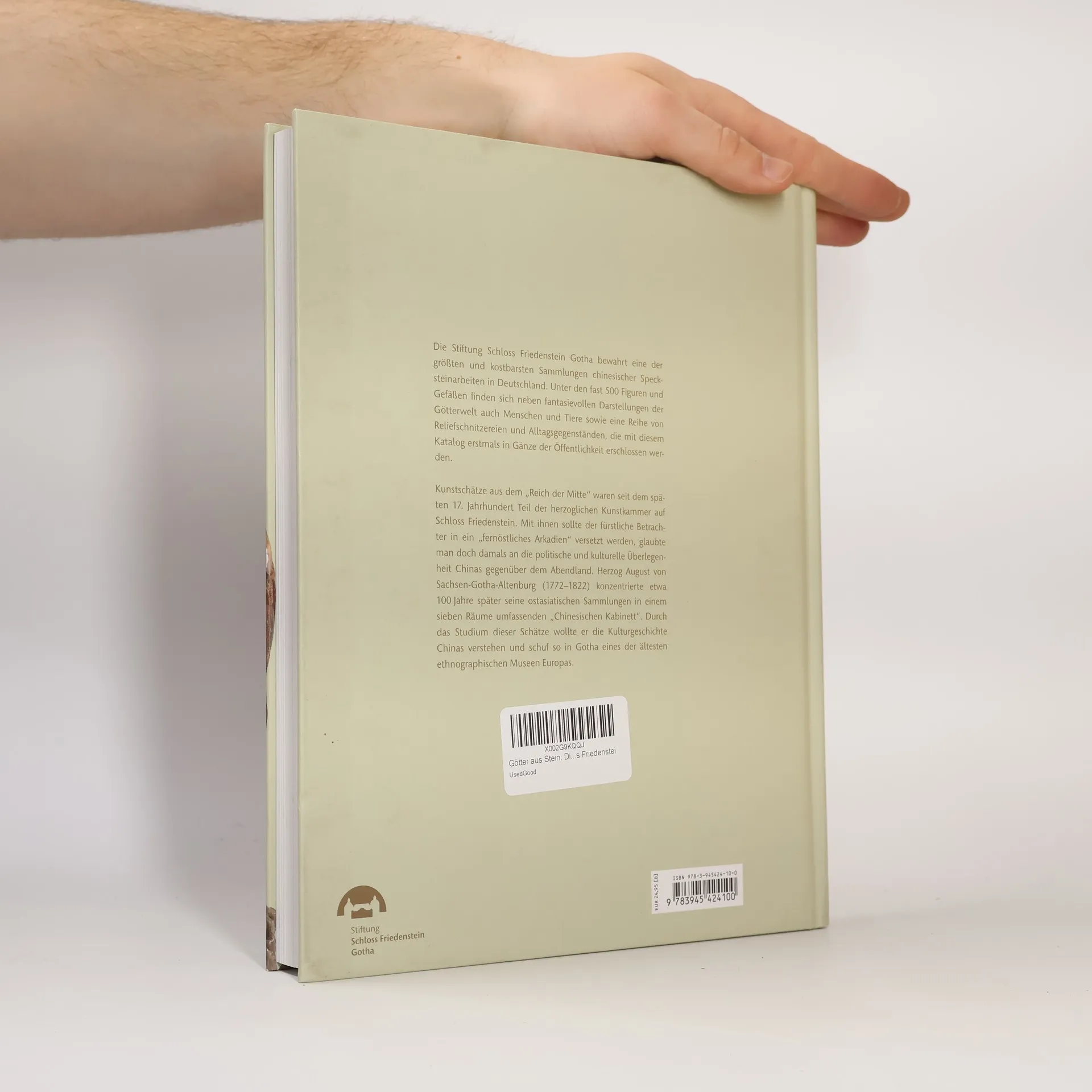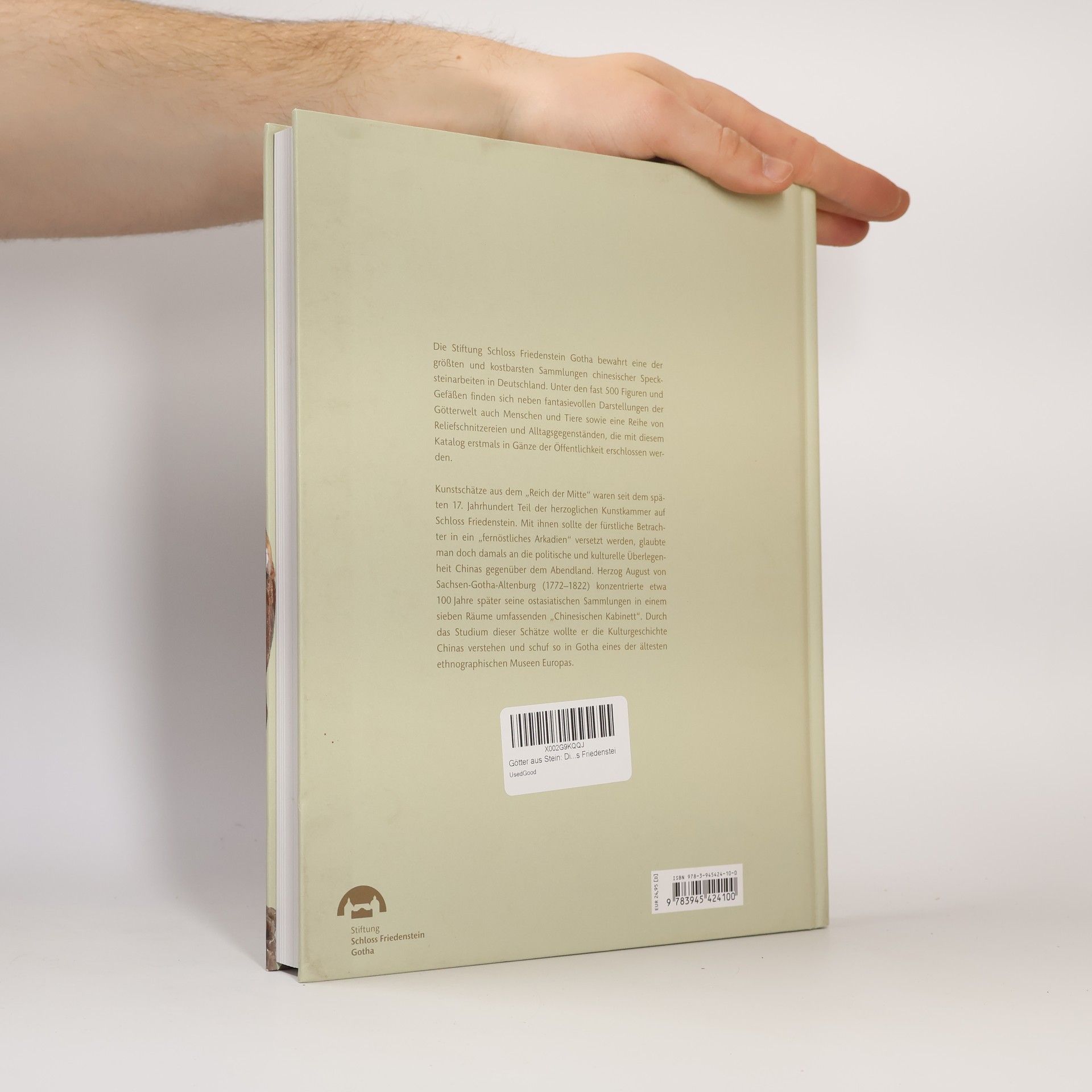 Mit knapp 500 Figuren und Gefäßen aus Speckstein verfügt die Stiftung Schloss Friedenstein Gotha über eine der größten Kollektionen dieser Art in Deutschland, die sich zudem noch an ihrem ursprünglichen Ort erhalten hat. Chinesische Kostbarkeiten sollten den fürstlichen Betrachter in ein „fernöstliches Arkadien“ versetzen, glaubte man doch um 1700 an die politische und kulturelle Überlegenheit Chinas gegenüber Europa. Herzog August von Sachsen-Gotha-Altenburg (1772–1822) konzentrierte 100 Jahre später seine ostasiatischen Sammlungen in einem sieben Räume umfassenden „Chinesischen Kabinett“. Anhand des Studiums der fernöstlichen Schätze wollte er die Kulturgeschichte Chinas verstehen und schuf so eines der ältesten ethnografischen Museen Europas. Die Sammlung der kostbaren chinesischen Specksteinarbeiten umfasst nicht nur Götter und andere figürliche Darstellungen, sondern auch eine Reihe von Reliefschnitzereien und Gefäßen, die mit diesem Katalog erstmals der Öffentlichkeit in Gänze erschlossen werden.